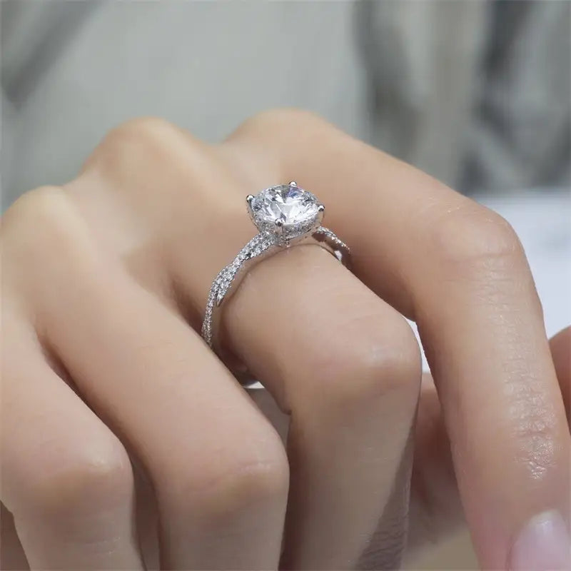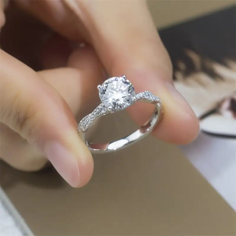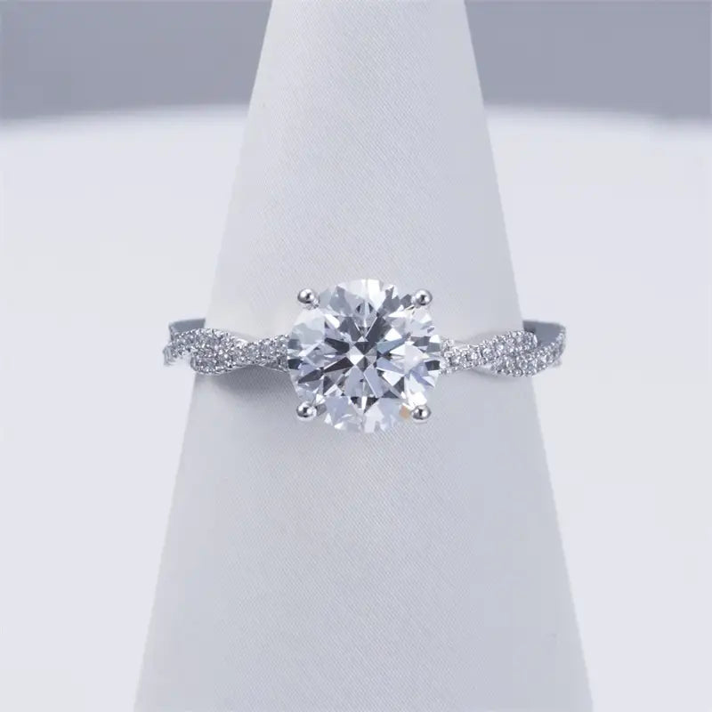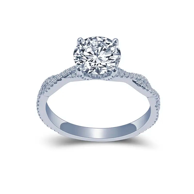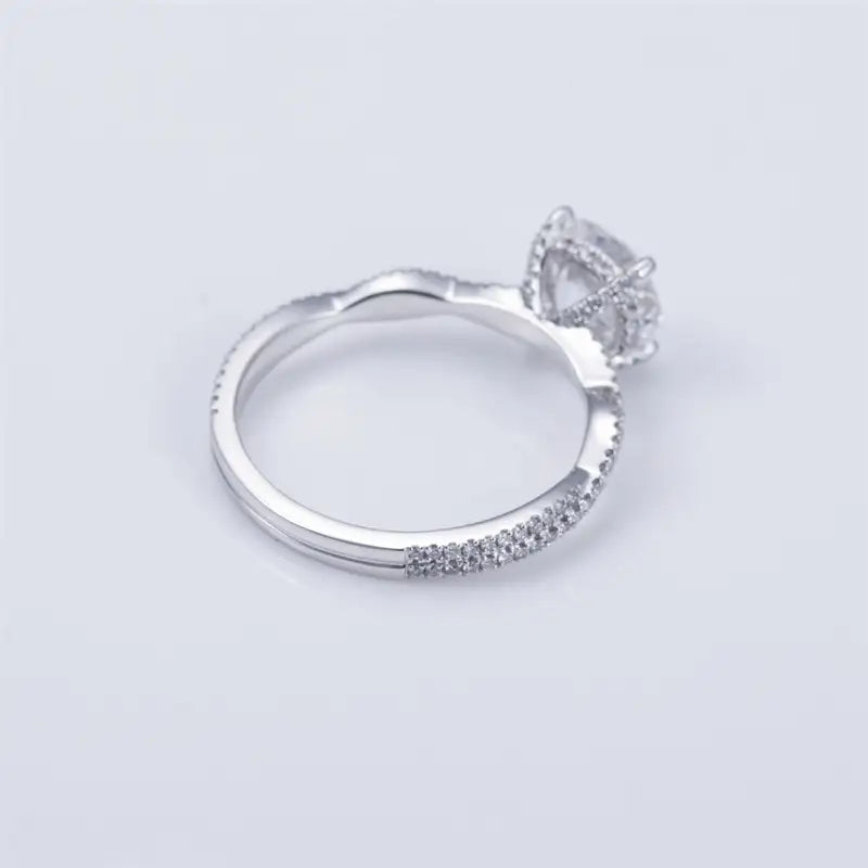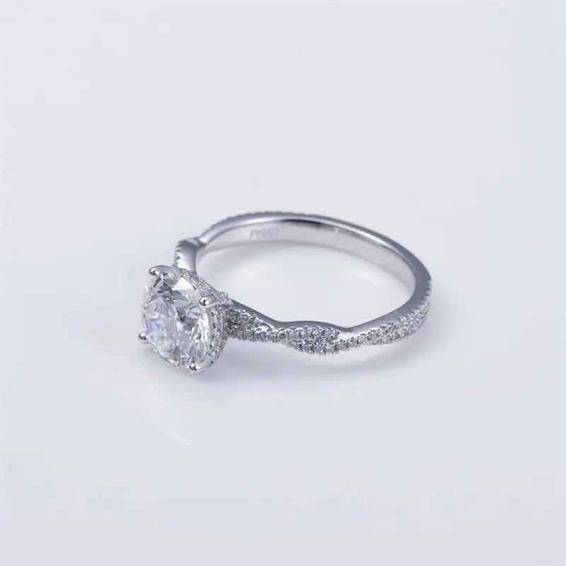 The PT750 platinum band features a twisted shank design, intricately adorned with pavé-set lab-grown diamonds that extend halfway around the band. This detail adds movement and brilliance, while the cool-toned platinum reflects the strength and purity of your vows. The ring's low profile allows it to nestle seamlessly beside a future wedding band, forming one continuous circle of light.