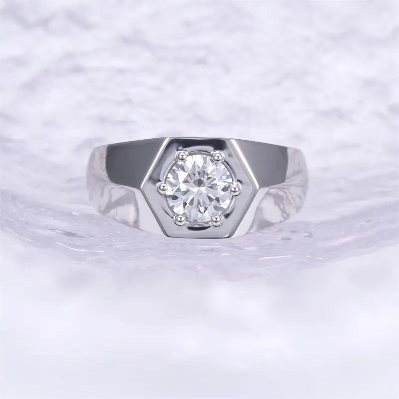 The stone is secured in a hexagonal bezel setting, elevated by six precision prongs that frame the diamond like a crown. This unique geometric design adds a contemporary edge to the classic solitaire silhouette, while the high-polish 14K or 18K white gold band reflects light with every movement. Sleek and unadorned, the band allows the diamond to take center stage—whether worn alone or paired with a wedding band.