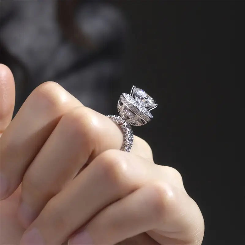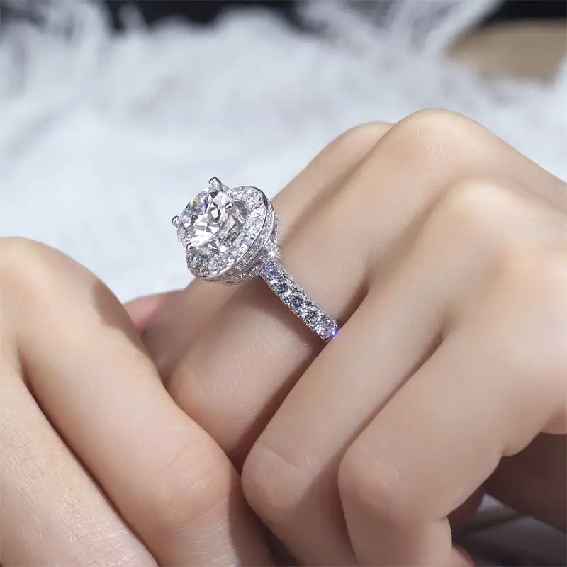 | Design: | Elevated solitaire with halo and pavé brilliance |