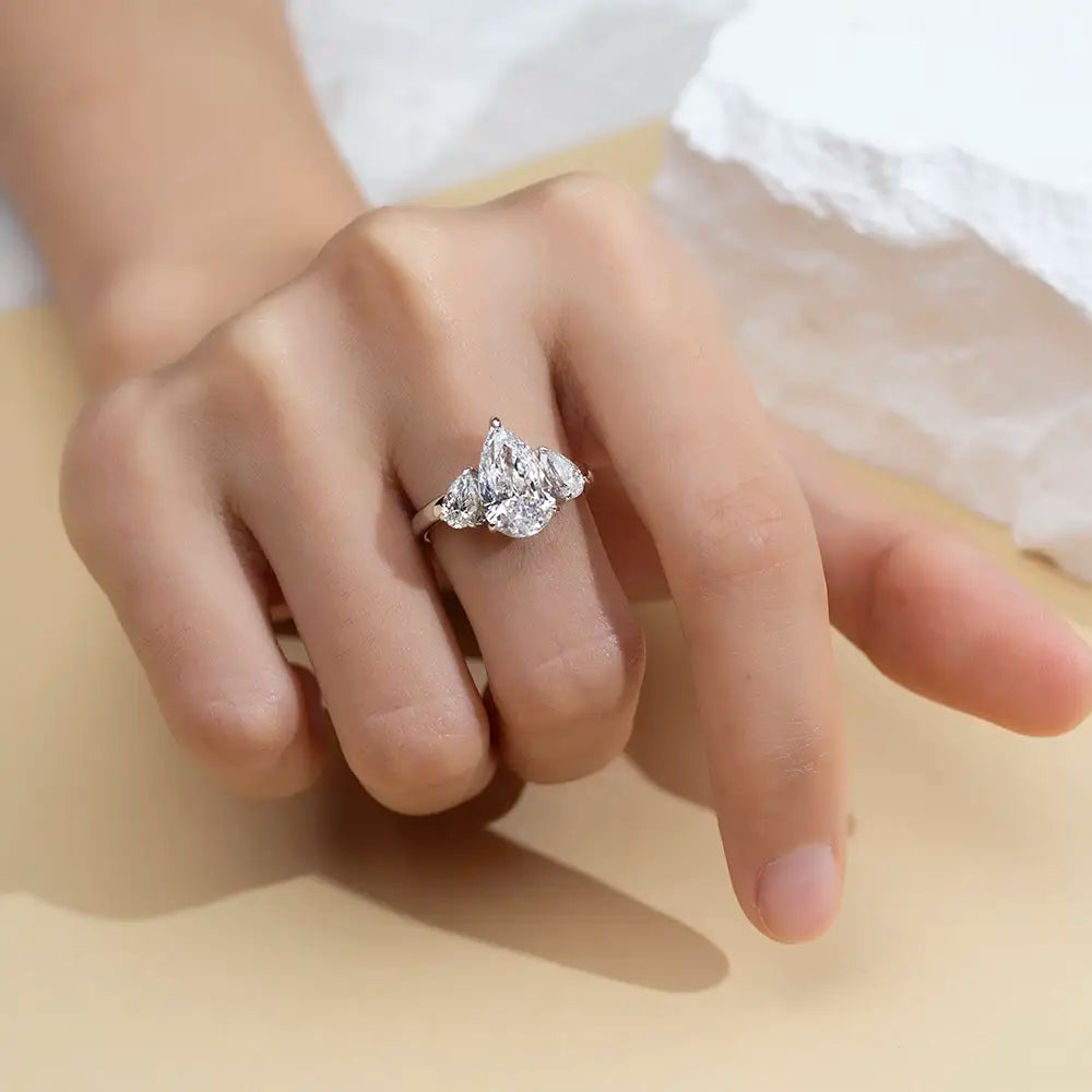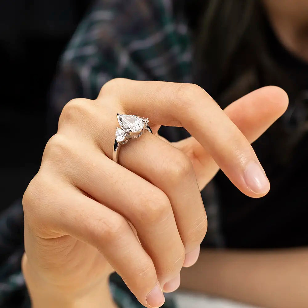 At its heart lies a pear-shaped lab-grown diamond, graded D color, VVS clarity, and IGI-certified, precisely cut to capture light with every movement. Flanking the center stone are two matching pear-shaped side diamonds, angled to mirror its silhouette and enhance its brilliance. Together, the three stones symbolize past, present, and future—making this ring a poetic choice for proposals, anniversaries, or personal milestones.