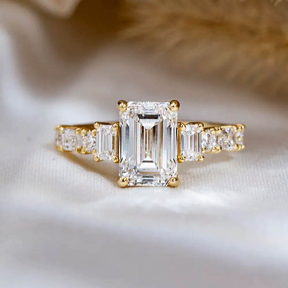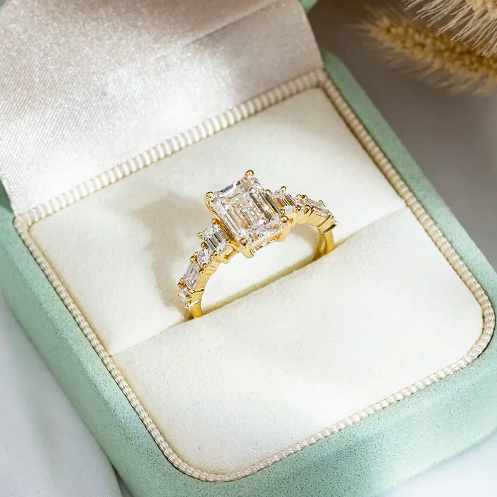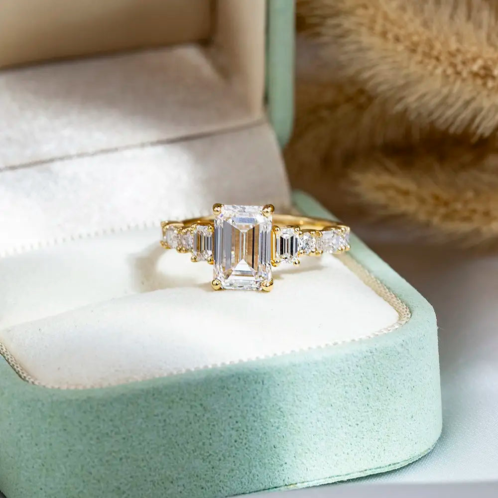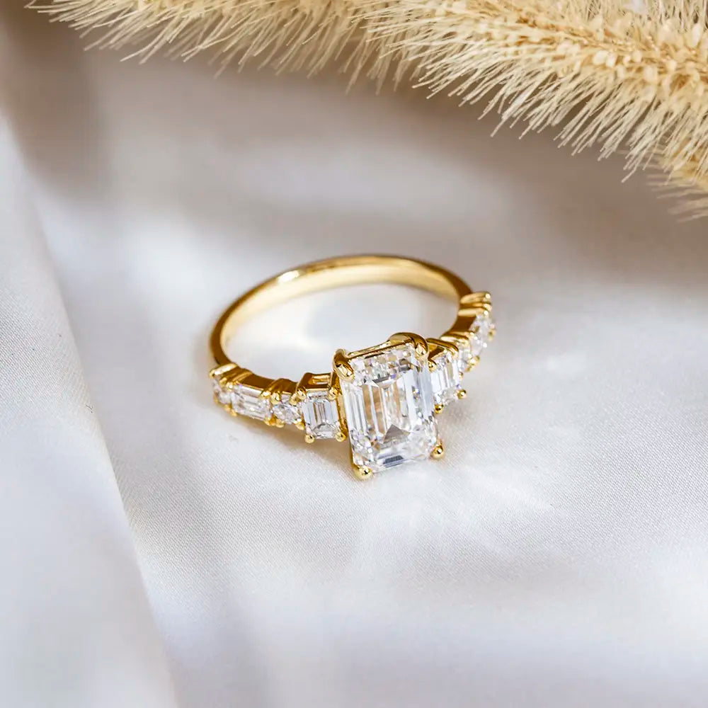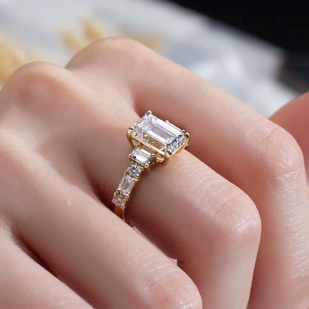 Bold, balanced, and breathtaking—Ecogemma's Eco-1810 ring is a masterclass in ethical elegance. At its heart lies a commanding 3-carat emerald-cut lab-grown diamond, held securely by four prongs that elevate its clean, step-cut geometry. Flanked by smaller emerald and round accent stones embedded into the polished 18K yellow gold band, the design radiates symmetry and sophistication from every angle.