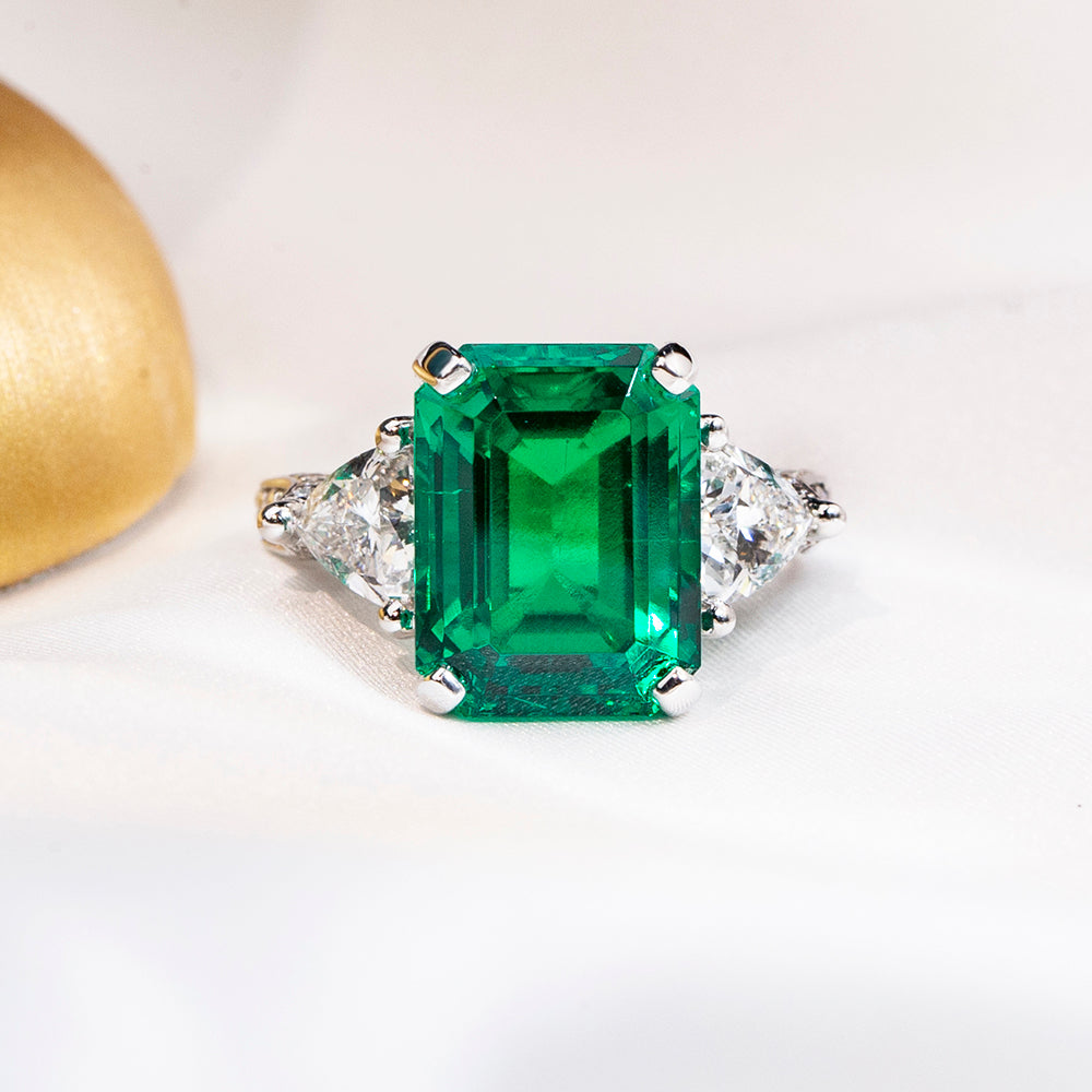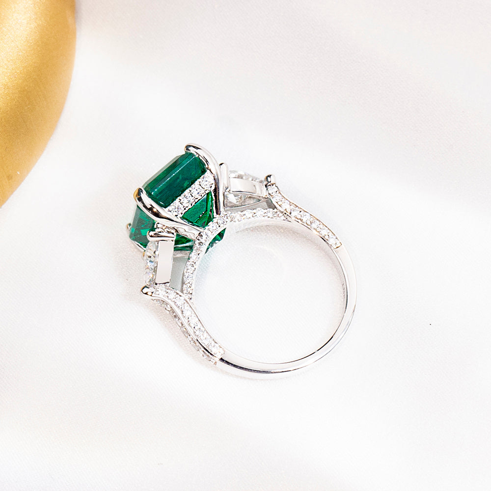 Designed by Ecogemma, this trilogy ring is more than jewelry—it's a reverie in green, a sculptural ode to clarity, and a radiant promise that beauty can be both timeless and kind.