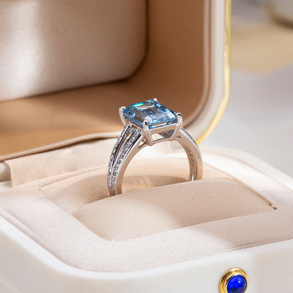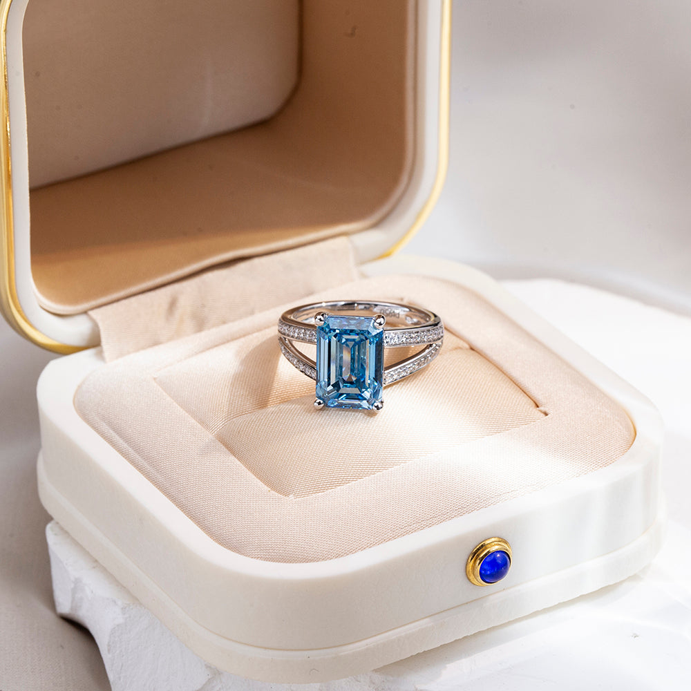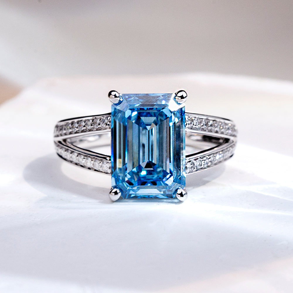 At its center lies a lab-grown emerald-cut blue diamond, chosen for its rare hue and exceptional fire. The elongated rectangular silhouette evokes strength and serenity, while the cool azure tone mirrors the depth of twilight skies and the calm of open seas.