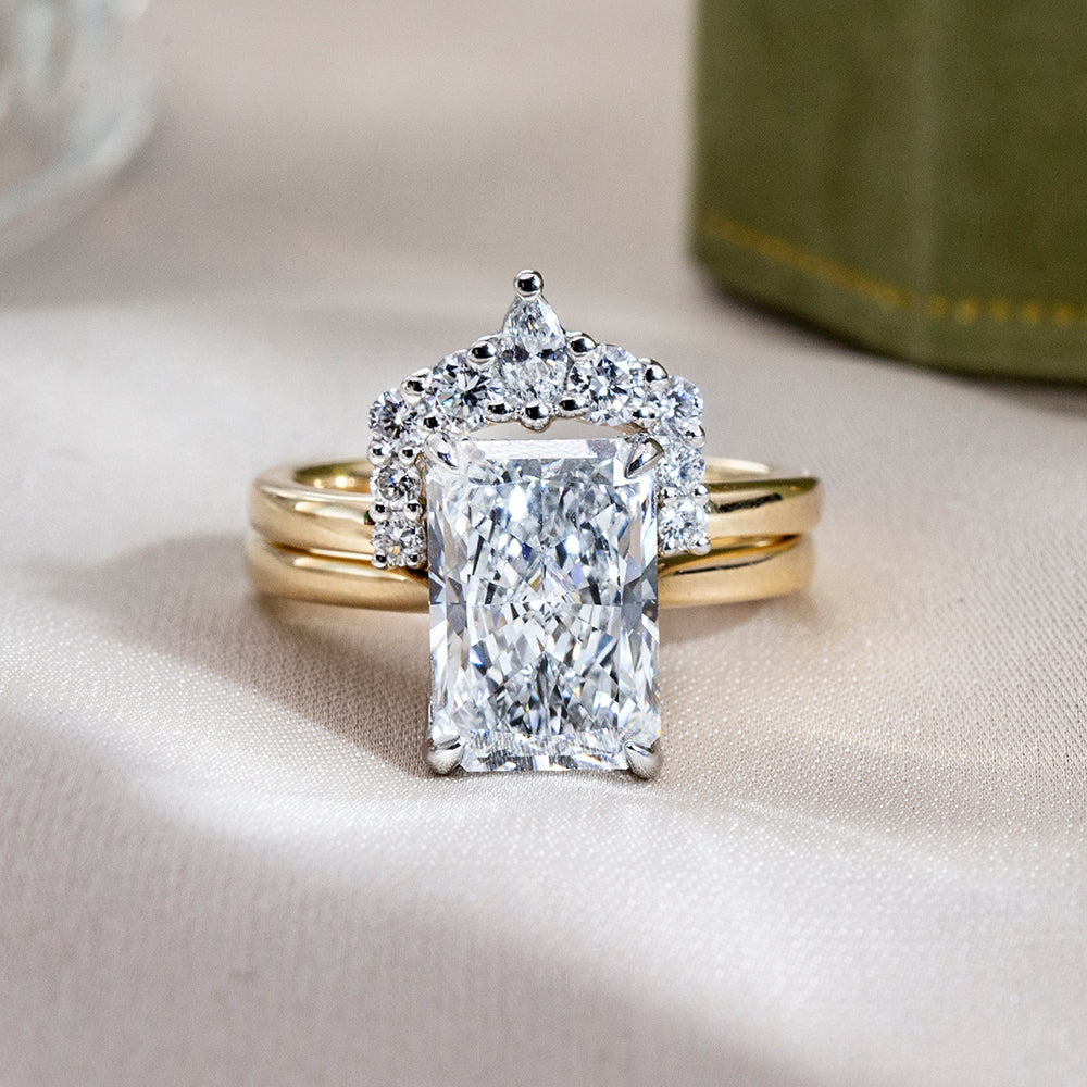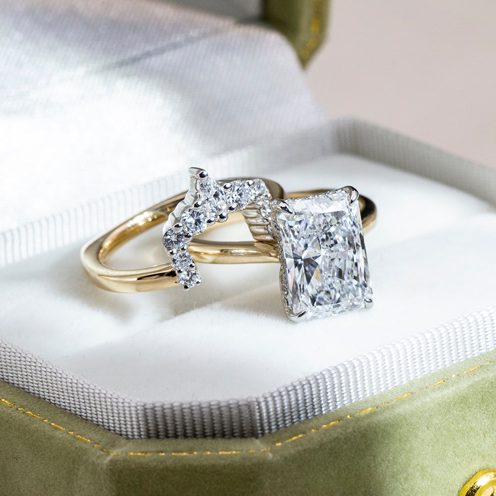 The engagement ring features a lab-grown radiant-cut diamond, chosen for its exceptional fire and symmetry. The radiant cut blends the linear elegance of emerald shapes with the brilliance of round cuts, creating a stone that dazzles from every angle.