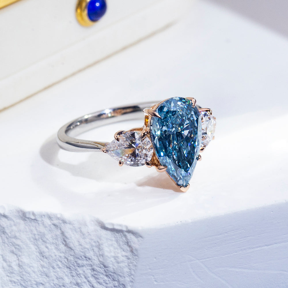Flanking the sapphire are two lab-grown pear-cut diamonds, their icy brilliance offering contrast and symmetry, enhancing the central gem's depth and luminosity. The three stones create a harmonious composition—a visual dialogue between color and clarity.