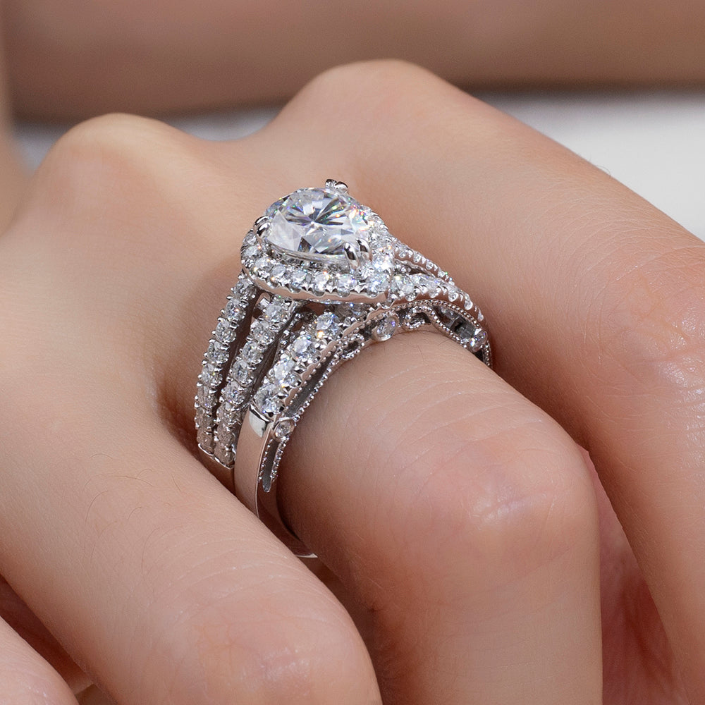 The engagement ring features a lab-grown pear-cut diamond, held in a secure halo setting that amplifies its brilliance with a constellation of lab-grown round diamonds. The pear shape—with its graceful taper and romantic silhouette—creates an elongating effect that flatters the finger.
