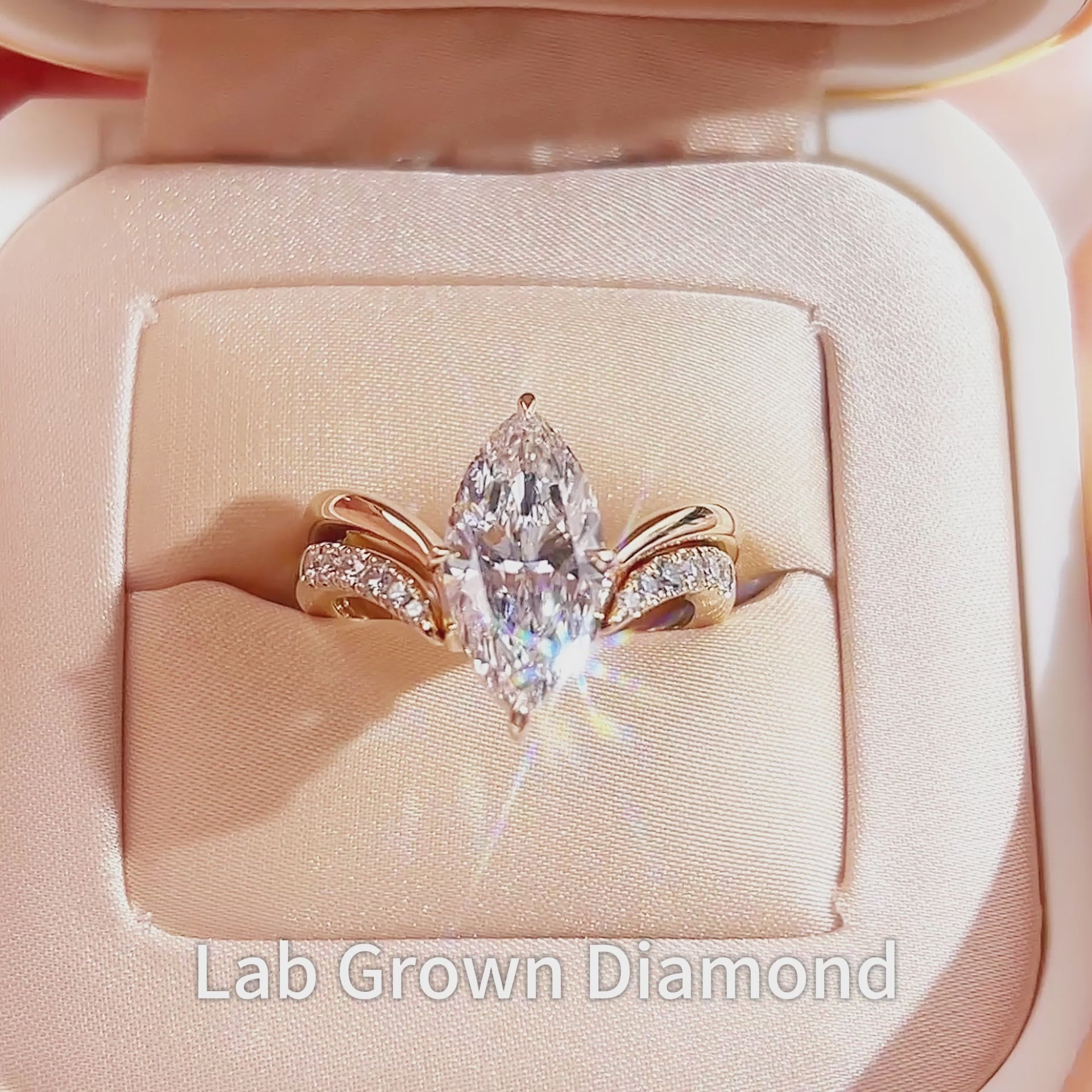 At its center lies a lab-grown marquise-cut diamond, chosen for its elongated brilliance and regal symmetry. The marquise shape, reminiscent of a leaf or a flame, symbolizes growth and passion.