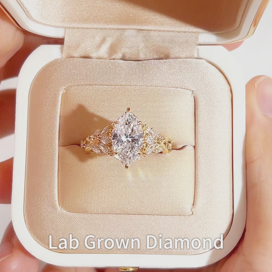At its heart lies a lab-grown marquise-cut diamond, chosen for its elongated silhouette and exceptional fire. The marquise cut, reminiscent of a leaf or flame, symbolizes growth, transformation, and enduring beauty.