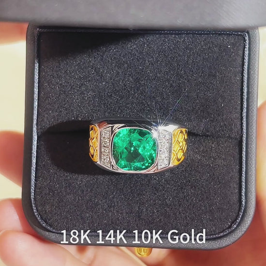 Eco-1889: Emerald Legacy – Lab-Grown Green Emerald Cushion Ring in 18K White ; Yellow Gold