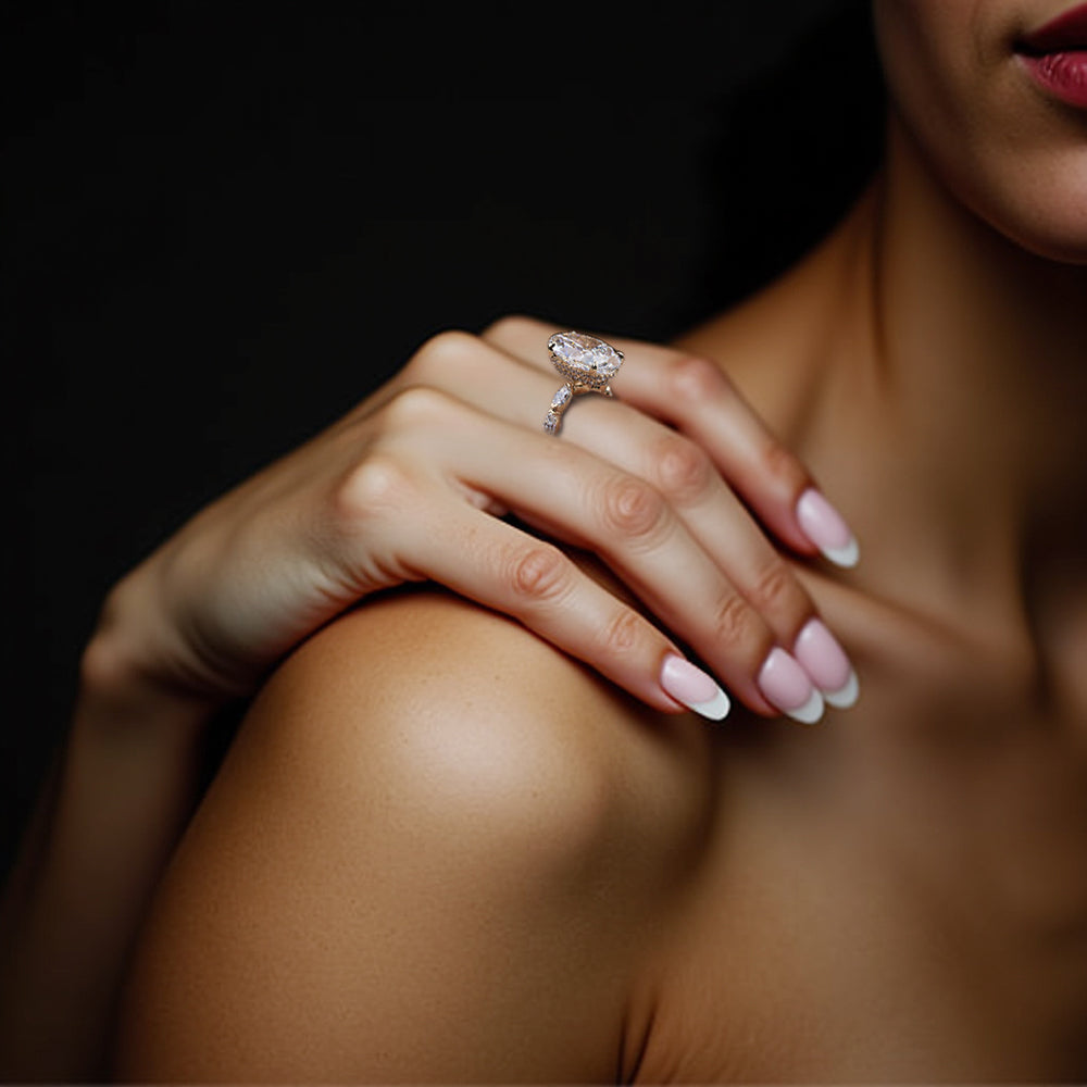 At its center lies a lab-grown oval-cut diamond, chosen for its elongated brilliance and graceful silhouette. The oval cut offers a flattering balance between fire and softness, making it ideal for those who seek both drama and delicacy.