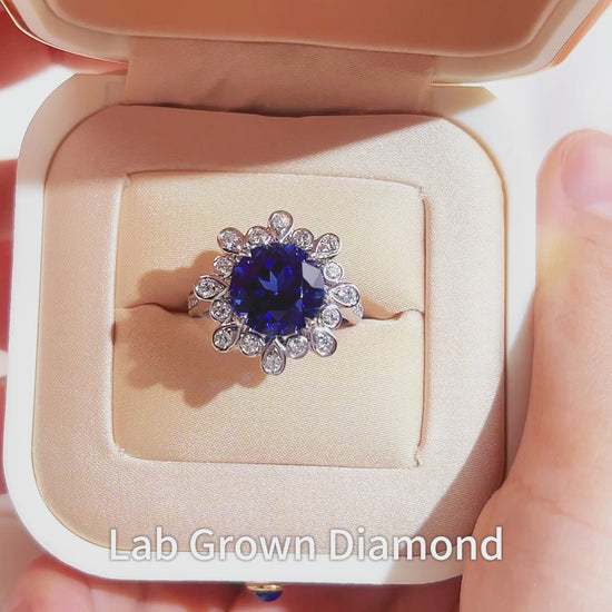 Encircling the sapphire is a halo of alternating lab-grown round and pear-shaped diamonds, arranged in a floral or sunburst pattern. This sculptural halo adds dimension and radiance, creating a striking contrast against the sapphire's saturated color.