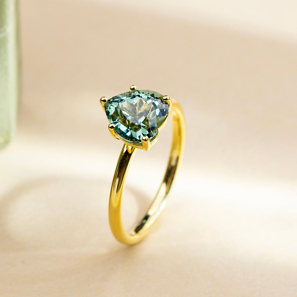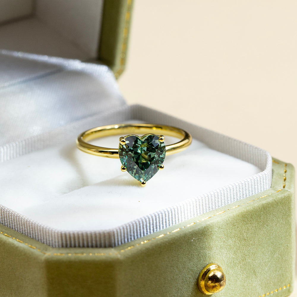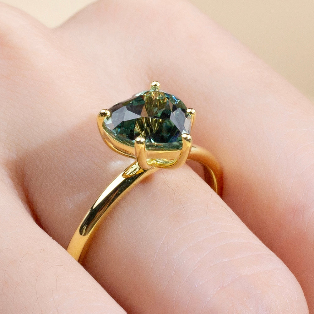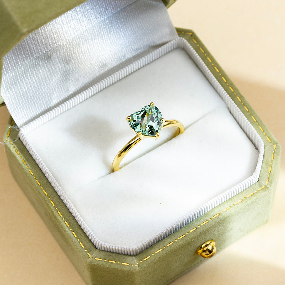 The heart shape is the ultimate symbol of love and devotion, while the green color represents growth, renewal, and harmony with nature. Together, they create a ring that speaks to both romantic commitment and environmental consciousness—a perfect union of emotion and ethics.