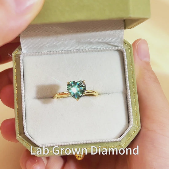At its center lies a lab-grown heart-cut green diamond, chosen for its unique hue—a deep forest green with hints of teal—and its symbolic silhouette. The heart cut, with its symmetrical curves and pointed base, speaks of love, individuality, and timeless sentiment.