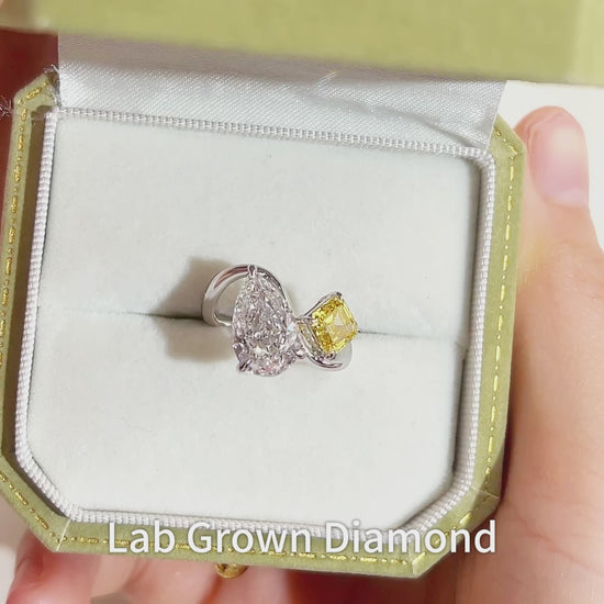This avant-garde bypass ring features two distinct lab-grown diamonds: a pear-cut clear diamond and a radiant-cut yellow diamond, each held in a tension-inspired prong setting that curves gracefully around the finger.