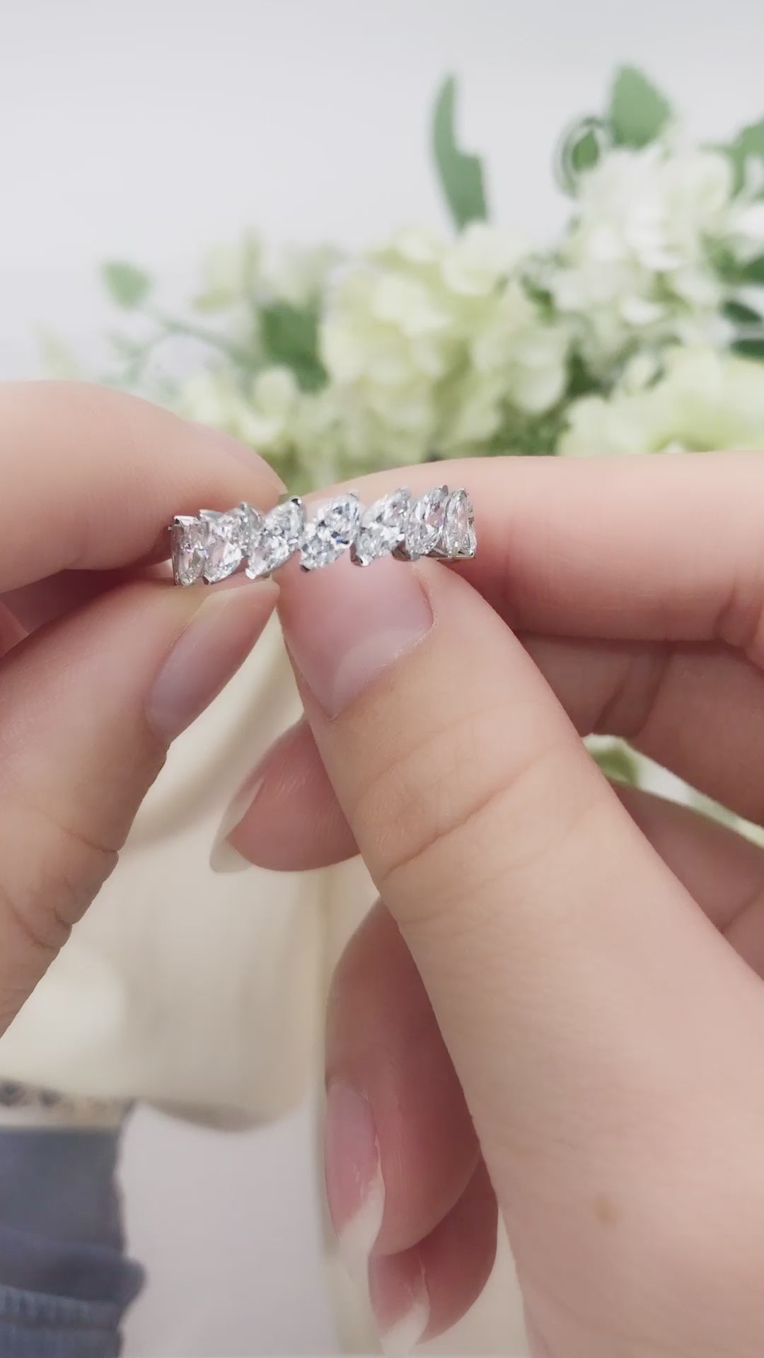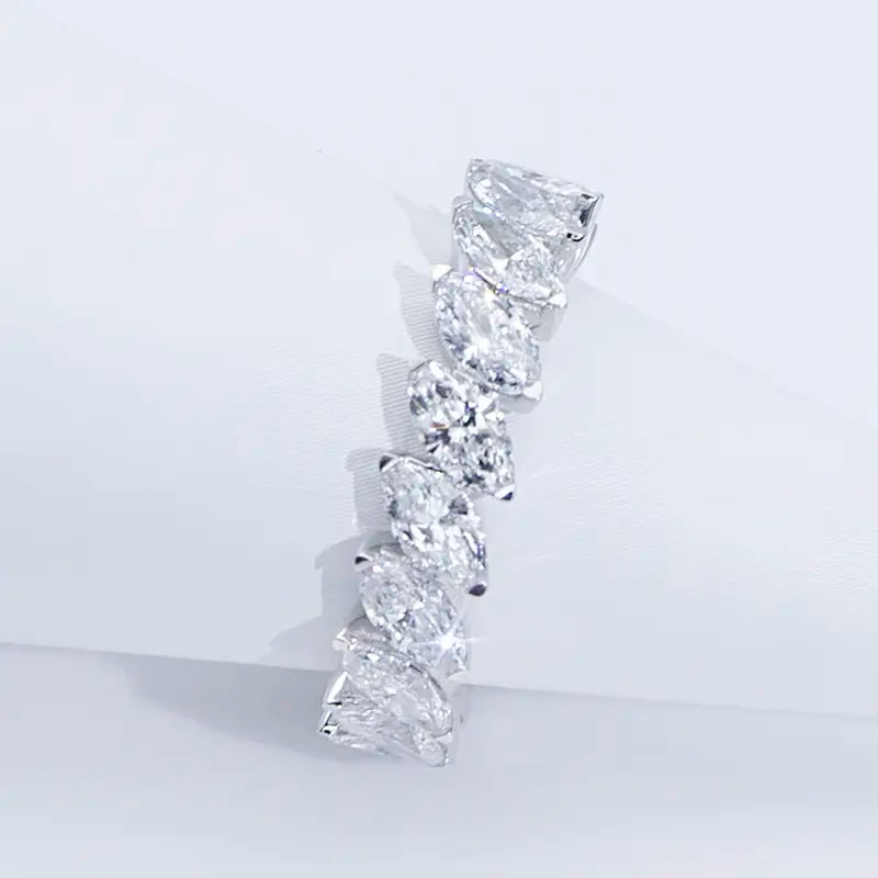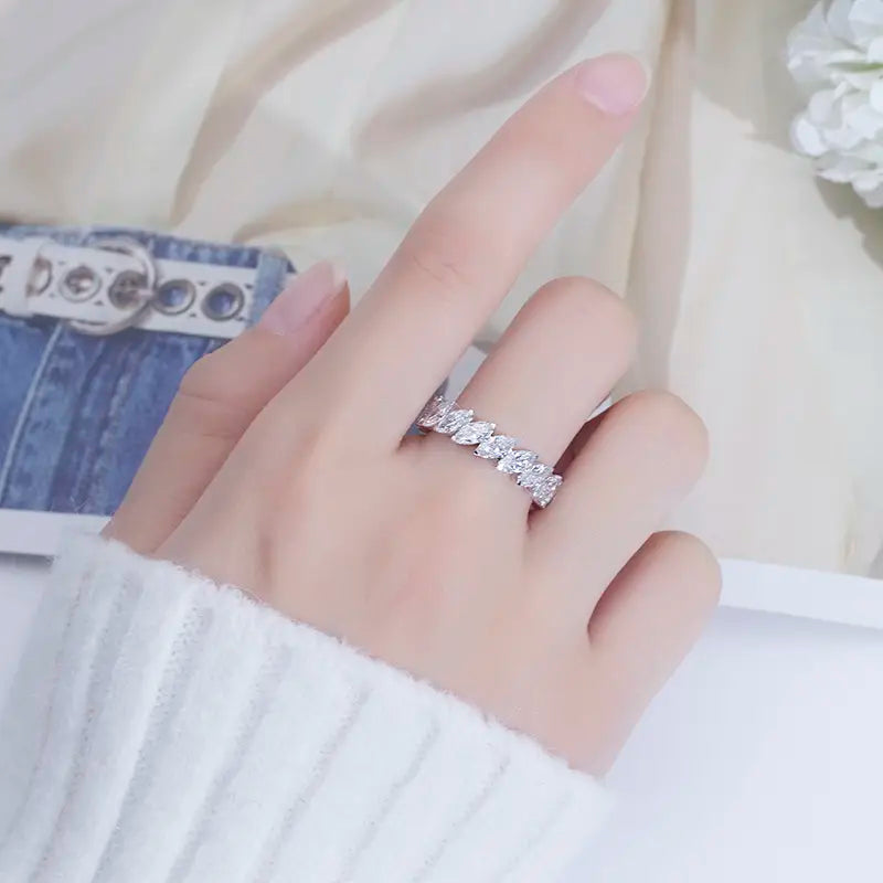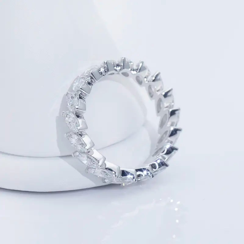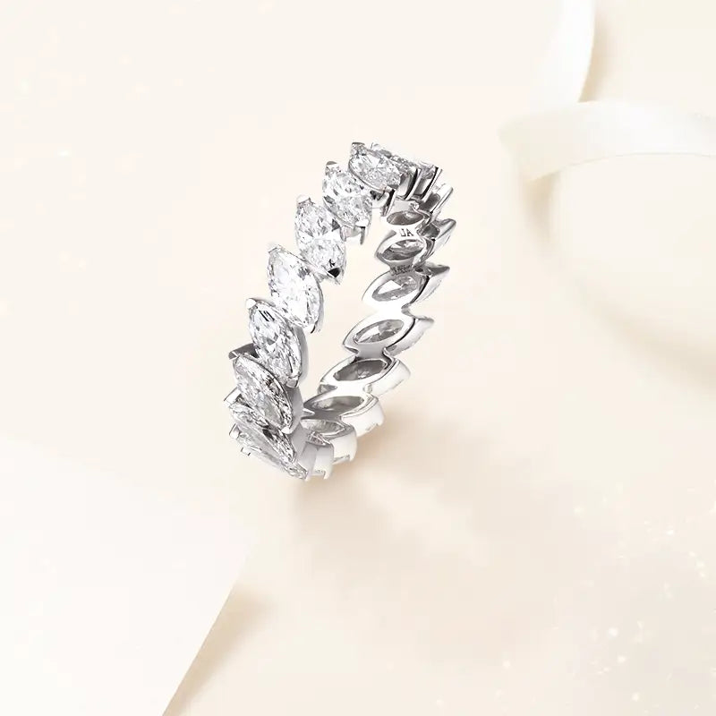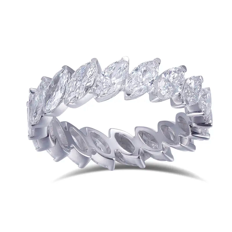 A symphony of sparkle and sophistication, the Eco-623 ring is a true celebration of craftsmanship and ethical luxury. Expertly set in 14K white gold, this elegant band features 18 meticulously selected marquise-cut lab-grown diamonds, each graded DEF color and VVS clarity — delivering exceptional brilliance and purity.