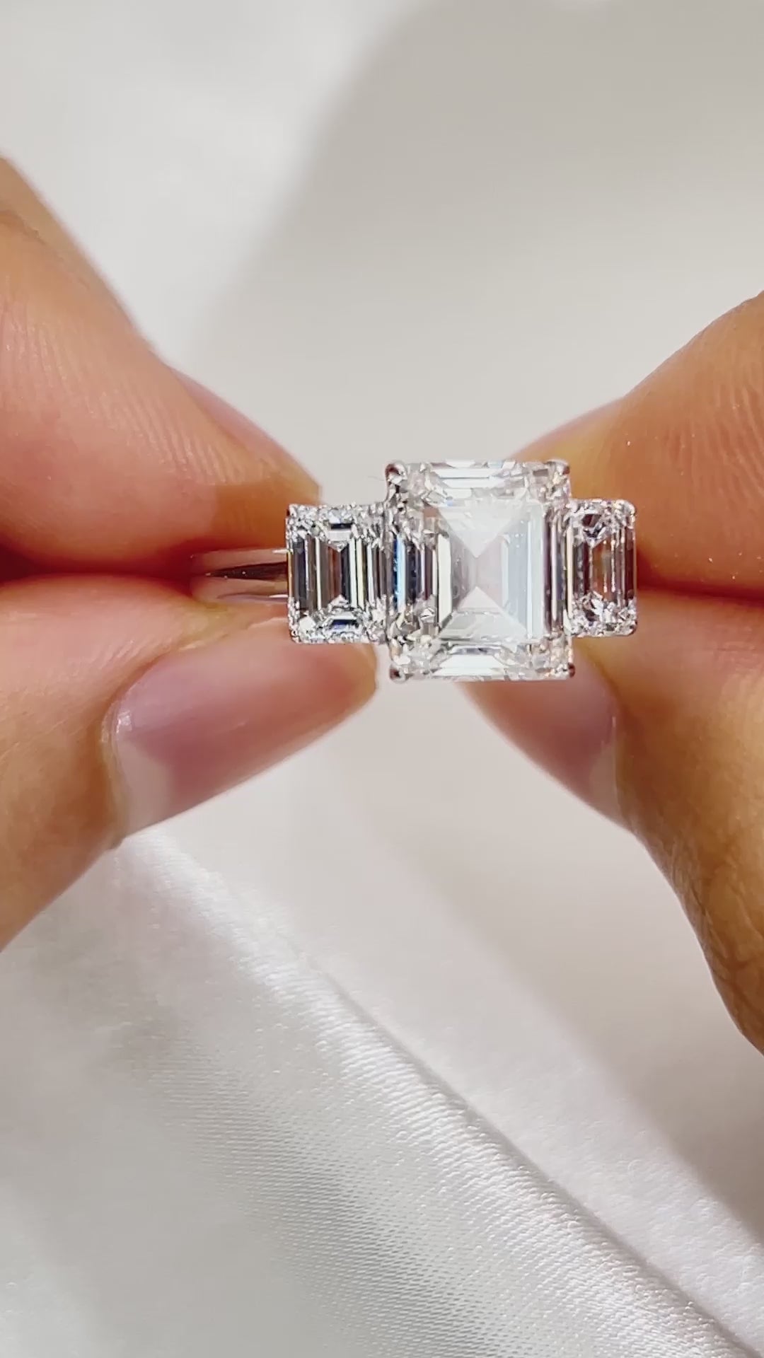 The step-cut facets of the emerald shape create a mesmerizing "hall-of-mirrors" effect, reflecting light in long, elegant flashes. Flanked by two matching emerald-cut side stones, the composition evokes balance and harmony—perfect for a love that's both grounded and luminous.