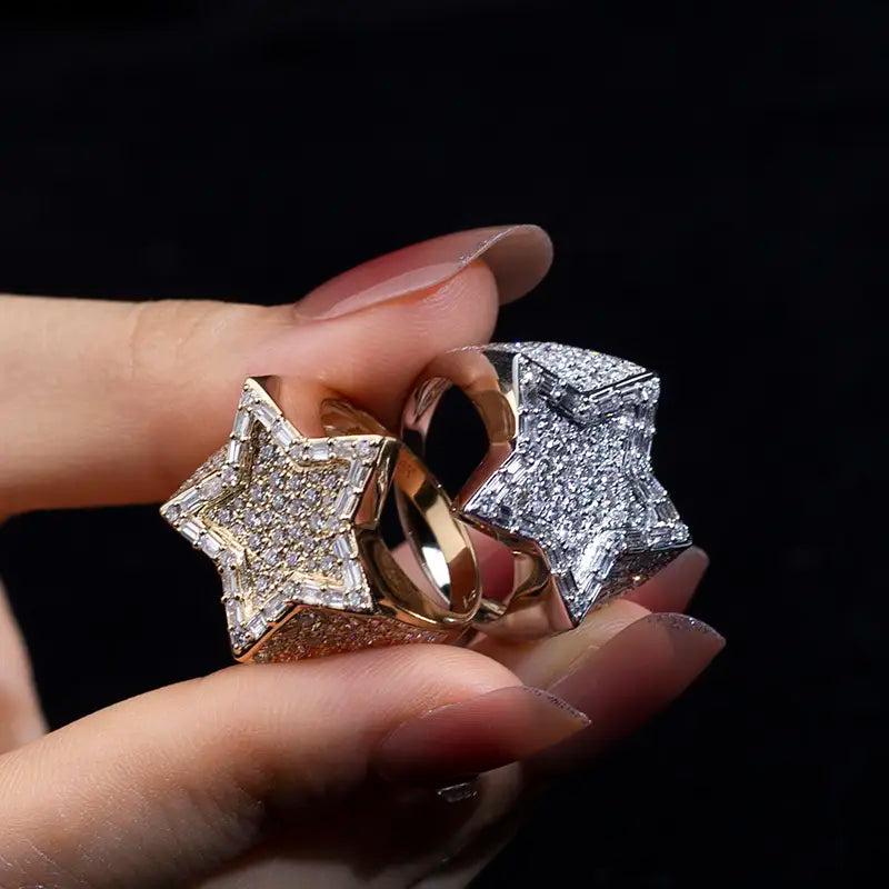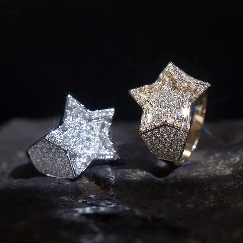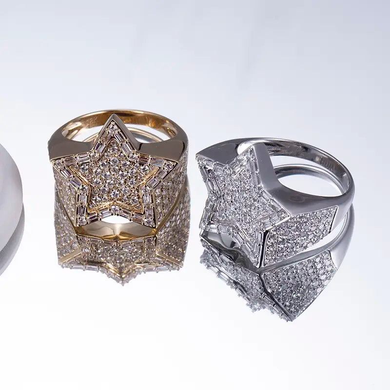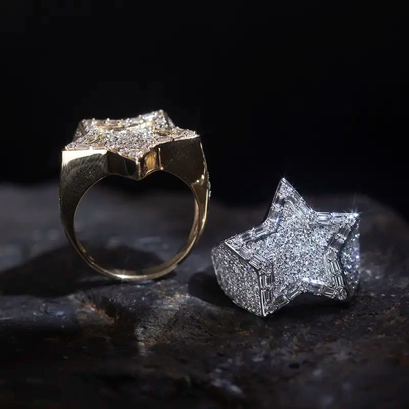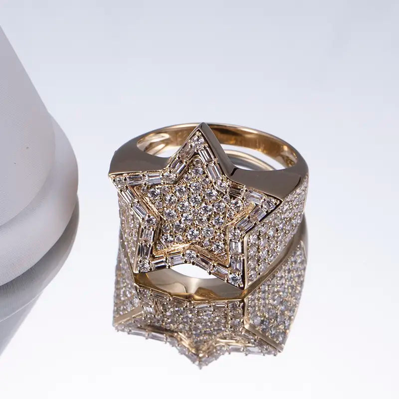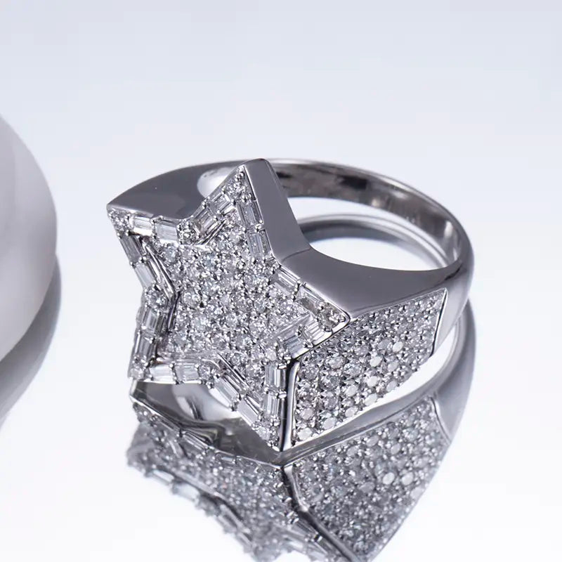 Crafted in 18K white or yellow gold, this bold design features a star-shaped centerpiece, fully encrusted with lab-grown diamonds that shimmer with precision-cut brilliance. Each facet of the star reflects light like a constellation, while the multi-row pavé-set diamonds along the band add depth, texture, and undeniable luxury.