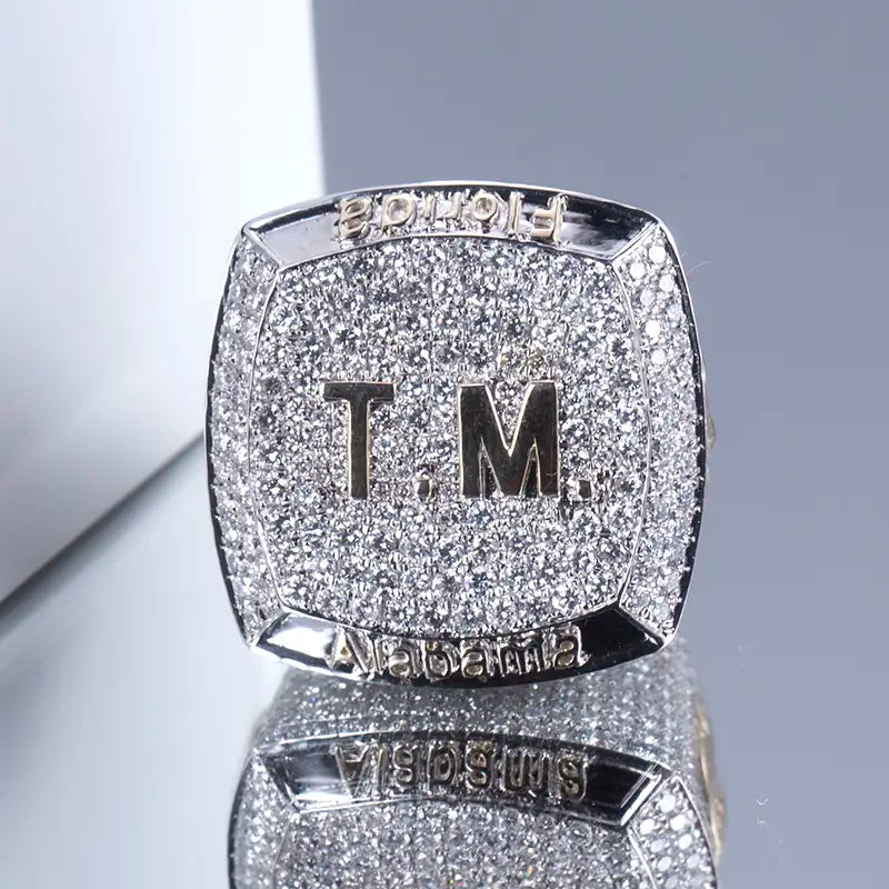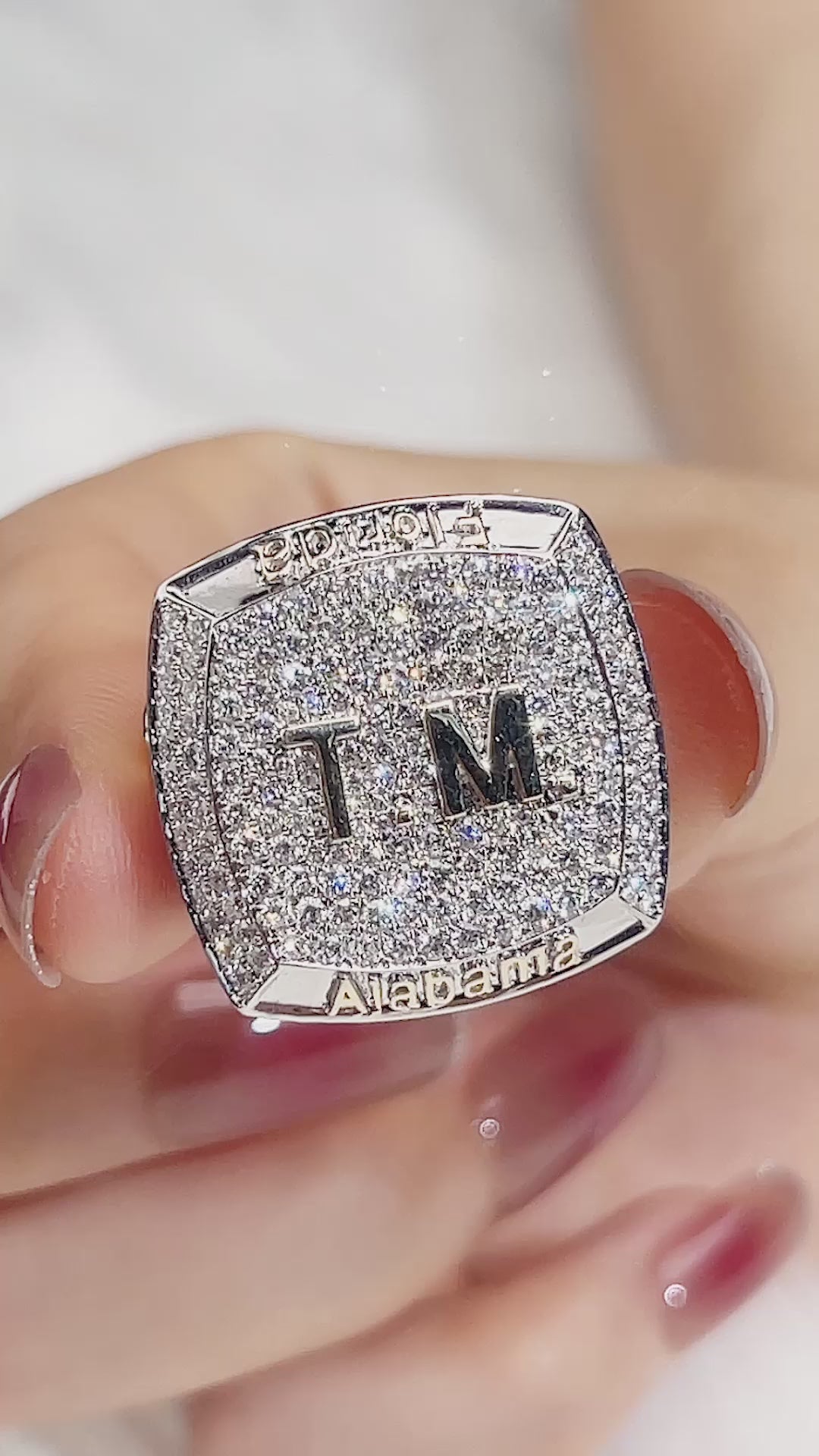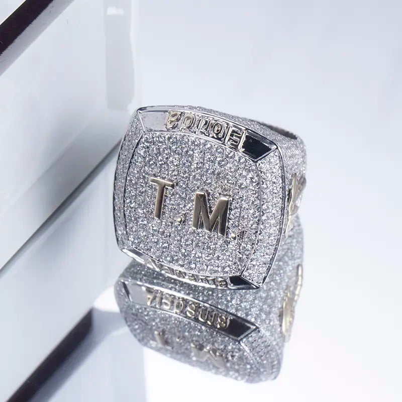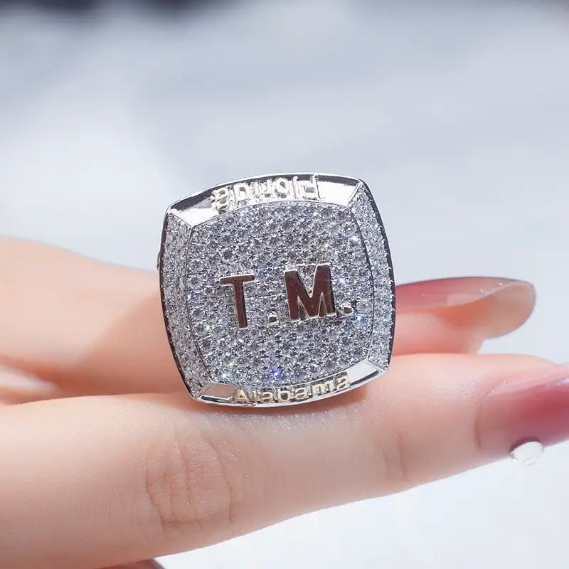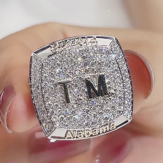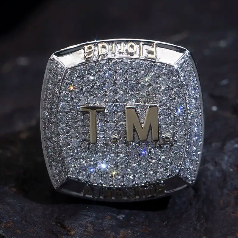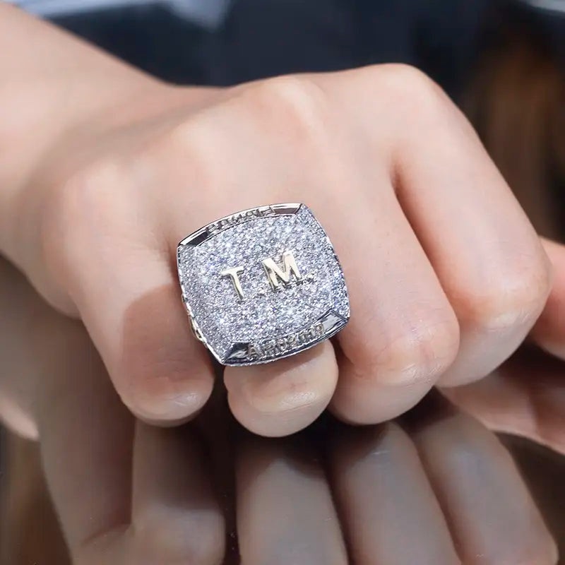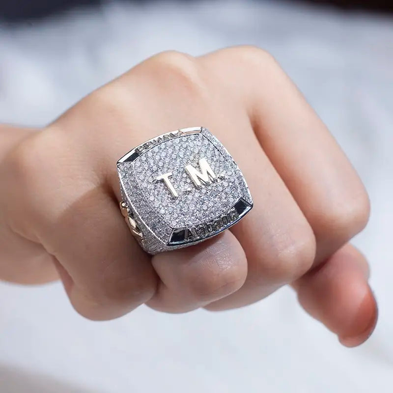 At the center, custom initials or symbols can be engraved in bold relief, transforming the ring into a personal crest of achievement.