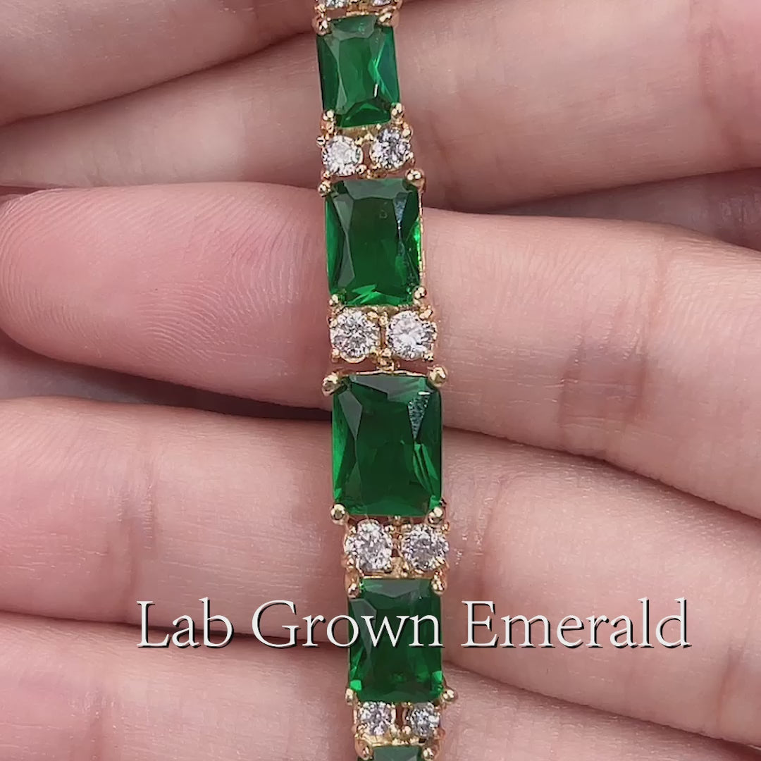 Each rectangular lab-grown emerald is set in a golden frame, flanked by pairs of round-cut lab-grown diamonds, creating a rhythmic pattern of color and brilliance that dances across the wrist.