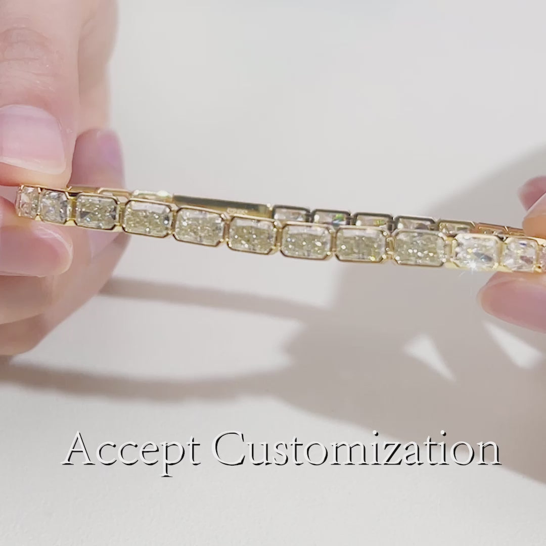 Crafted with lab-grown diamonds set in individual bezel frames, the bracelet offers a clean, architectural silhouette. The stones are precisely cut and uniformly spaced, creating a rhythm of brilliance that flows seamlessly across the wrist. The box clasp, engineered for security and elegance, integrates discreetly into the design.
