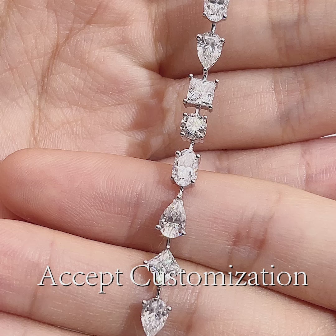 Crafted in 925 sterling silver or 18K white gold, the bracelet's silhouette is refined yet expressive, with each stone chosen not only for its shape but for its clarity and fire. The alternating cuts evoke emotion, movement, and modernity—making this piece ideal for both everyday elegance and formal occasions.