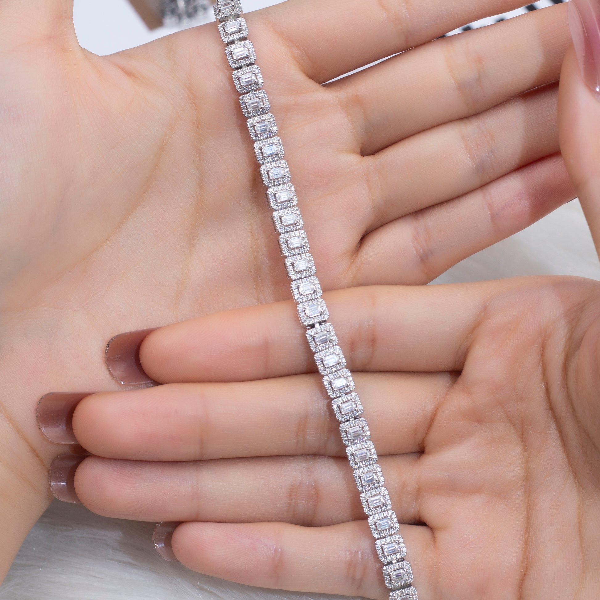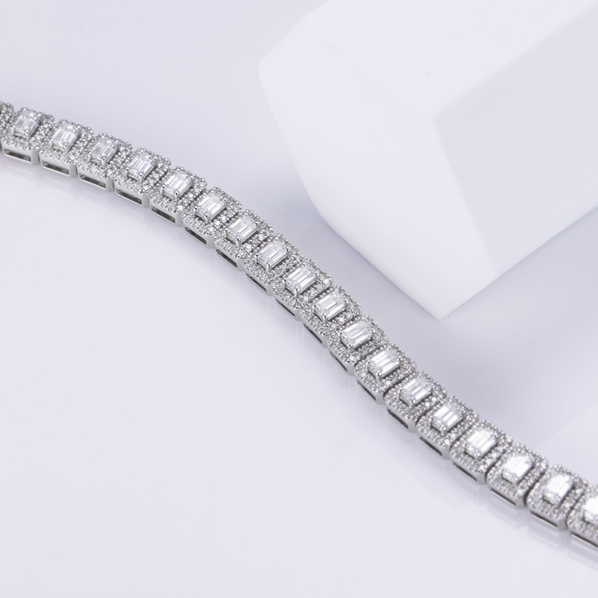 The rectangular silhouette of the center stones evokes clarity, strength, and timeless sophistication, while the surrounding halos soften each edge with a whisper of brilliance. Set in 18K white gold, the bracelet's design is both bold and refined—ideal for those who appreciate geometry with soul.