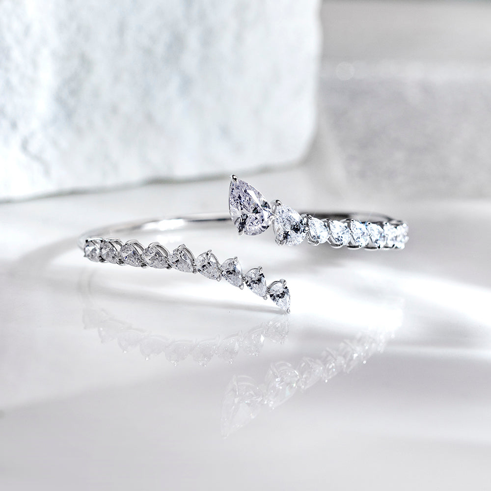 The diamonds are arranged in a graduated pattern, tapering from delicate brilliance to bold fire at each tip. The open cuff silhouette allows for a gentle embrace of the wrist, while the inner band is engineered with subtle cutouts for comfort and breathability.