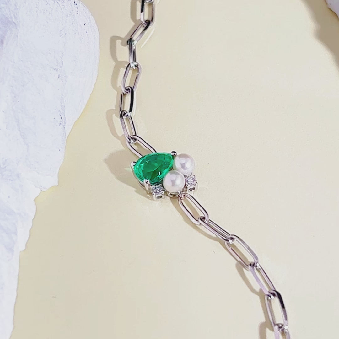 The Ecob-618 Verdant Grace Bracelet is a delicate ode to serenity, love, and timeless refinement. At its center lies a heart-shaped lab-grown emerald, its verdant hue evoking lush gardens and quiet strength. Flanked by two cultured white pearls, the composition speaks of balance—earth's richness embraced by purity.