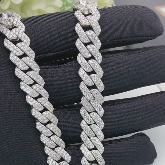 Each link is forged in a tightly interlocked pattern, 12mm or 16mm wide, and drenched in ice-out Moissanite stones, chosen for their unmatched brilliance and fire.