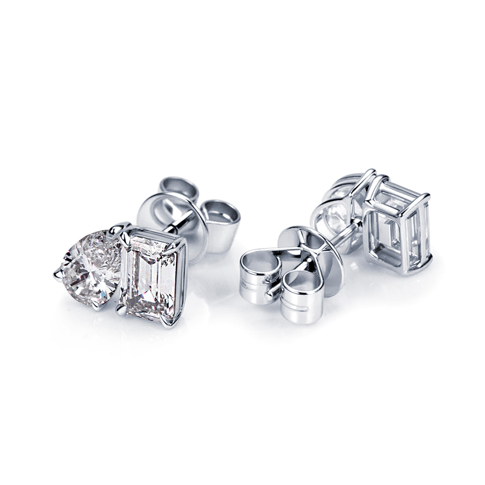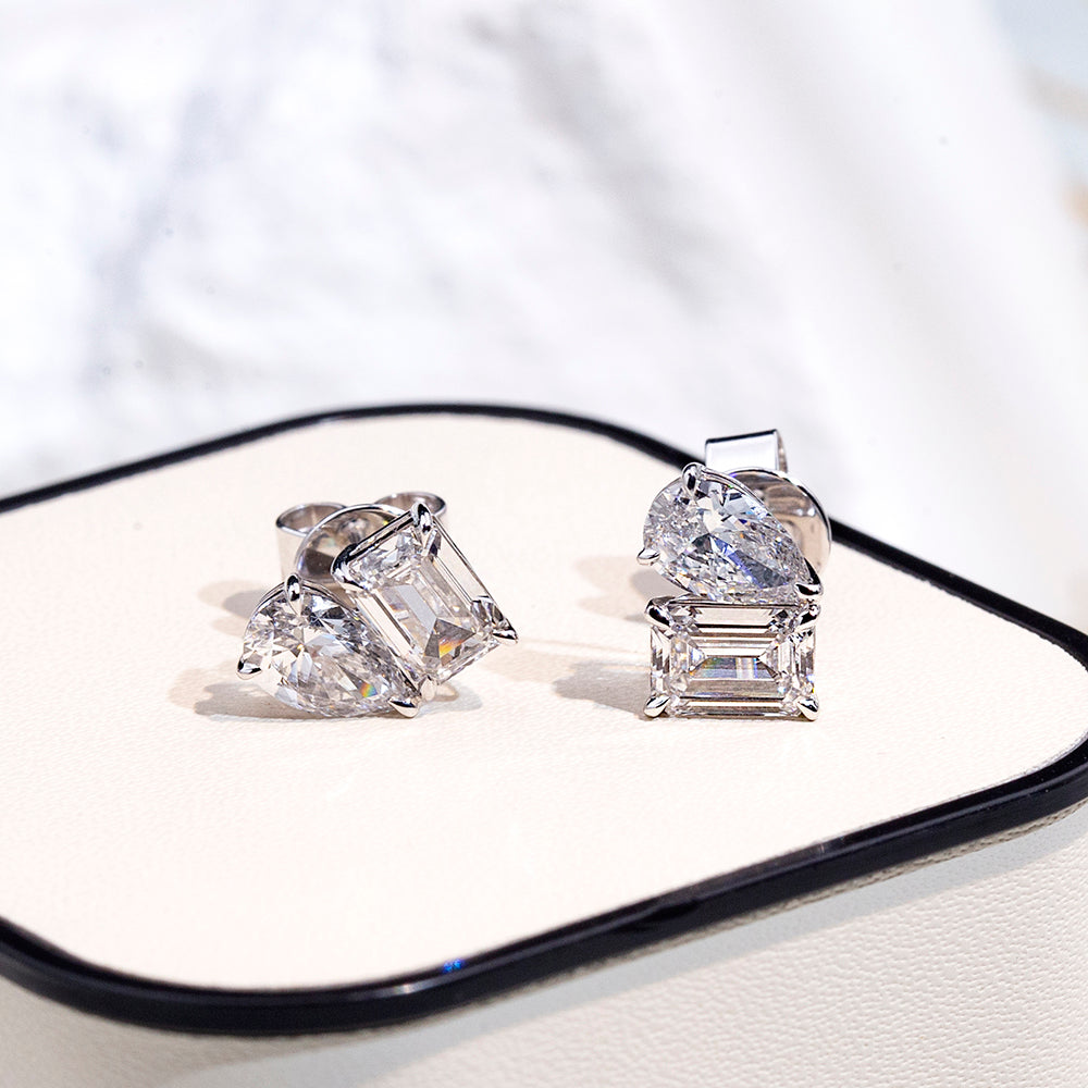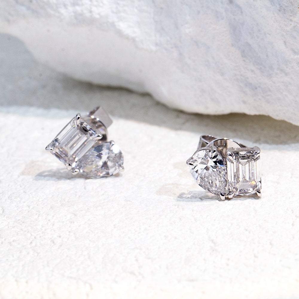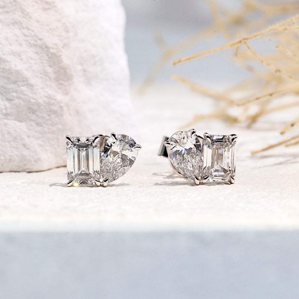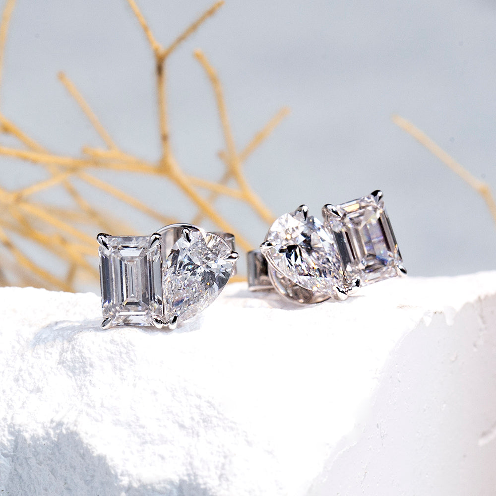 The pear-cut stone is a lab-grown diamond, chosen for its fire and ethical origin. The emerald-cut counterpart may feature: