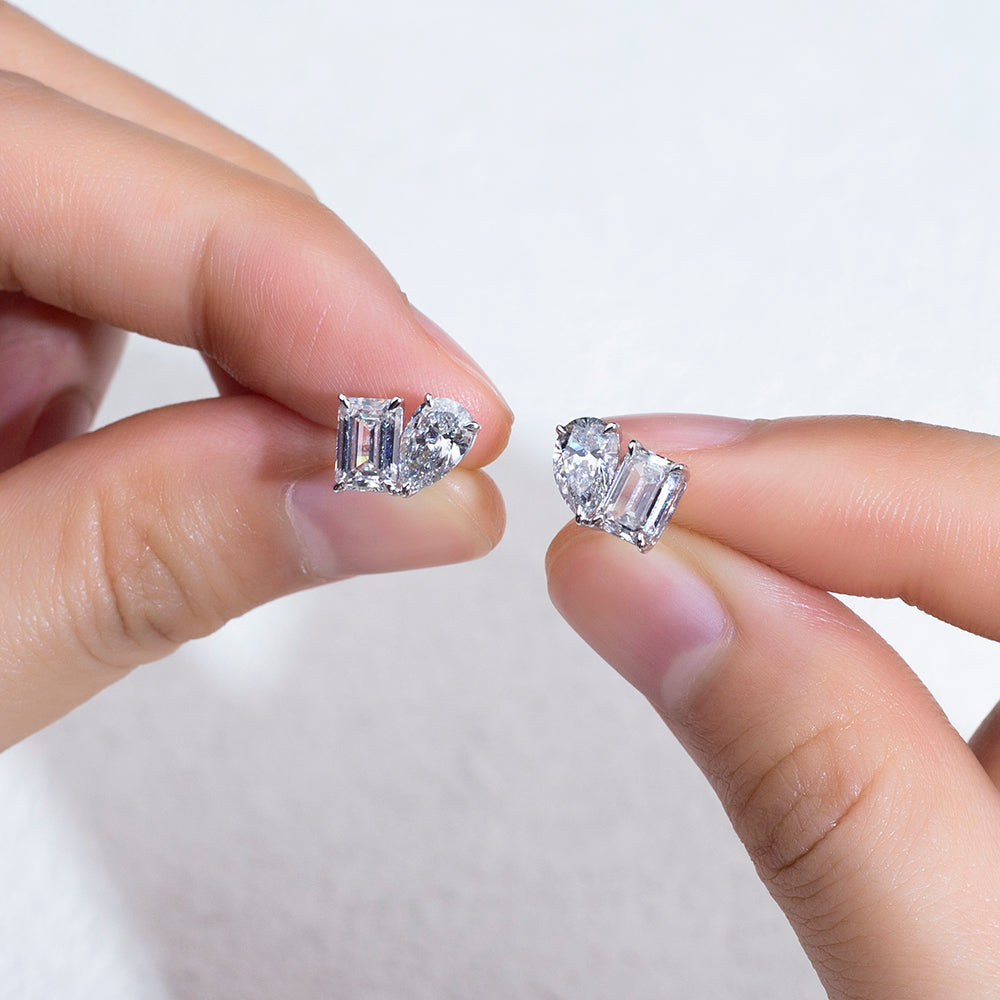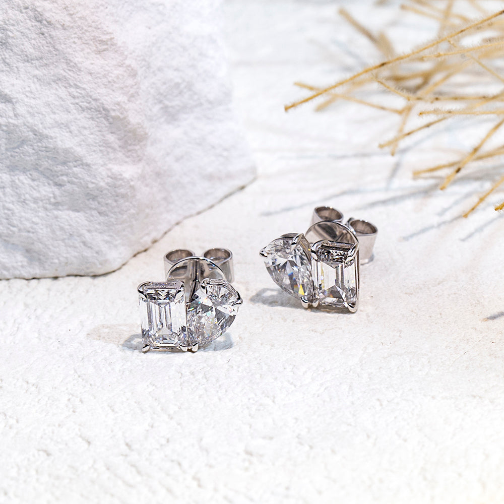 In the quiet geometry of light, the Ecoe-802 | Asymmetric Light earrings speak a language of contrast and harmony. Each stud pairs two distinct silhouettes: a pear-cut lab-grown diamond, fluid and emotive like a falling star, and an emerald-cut lab-created gemstone, precise and architectural like a shard of moonlight.