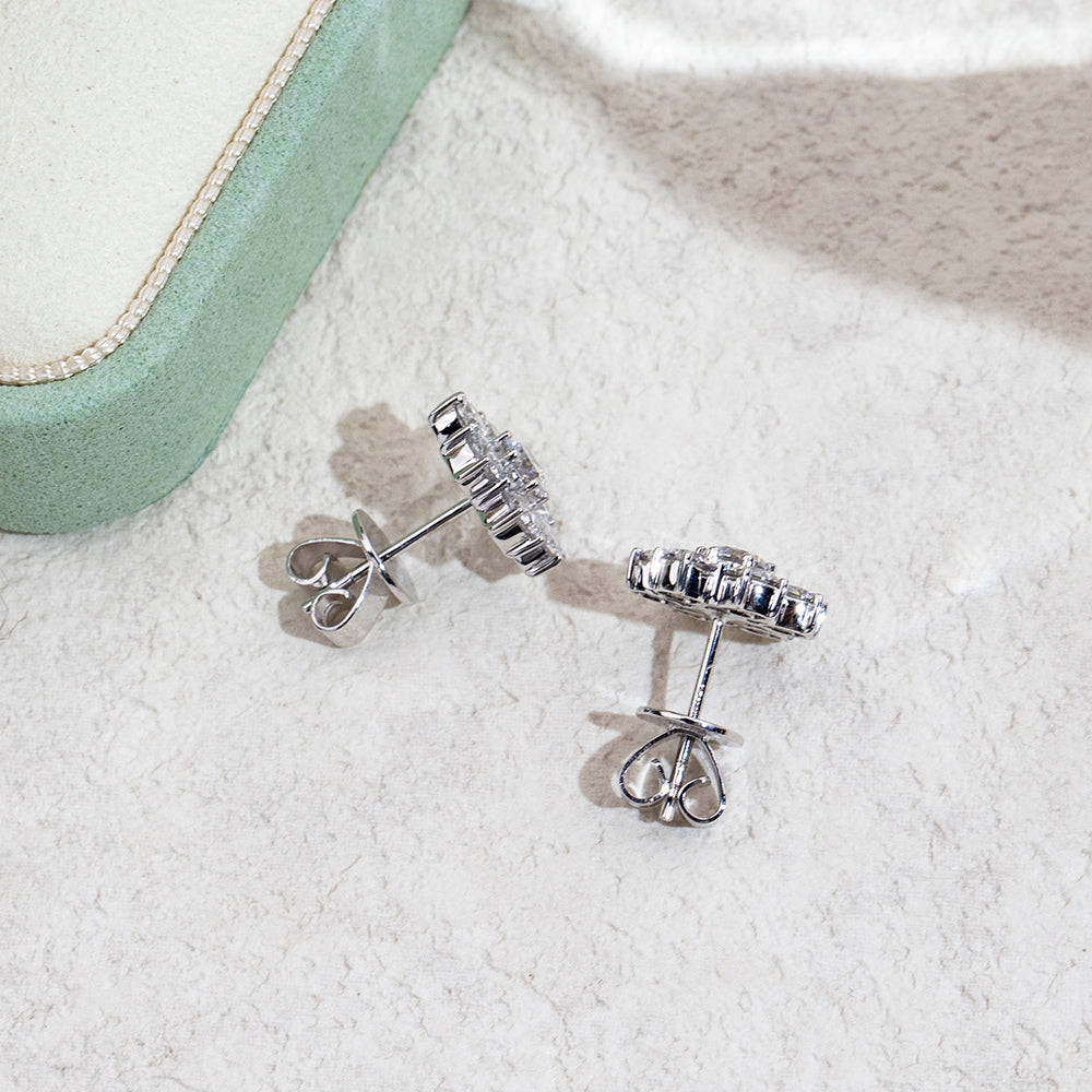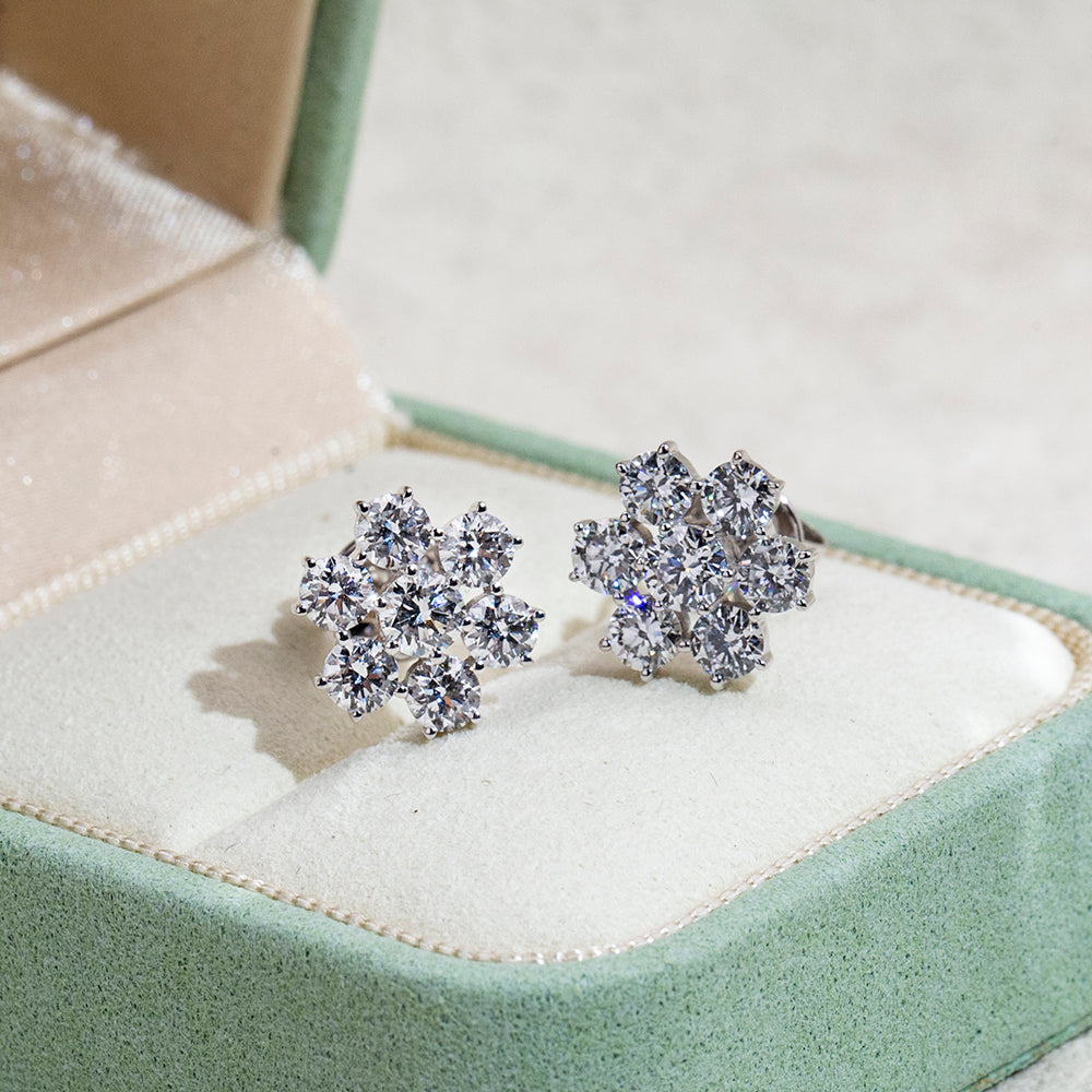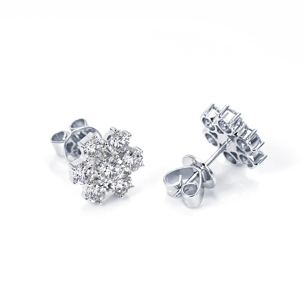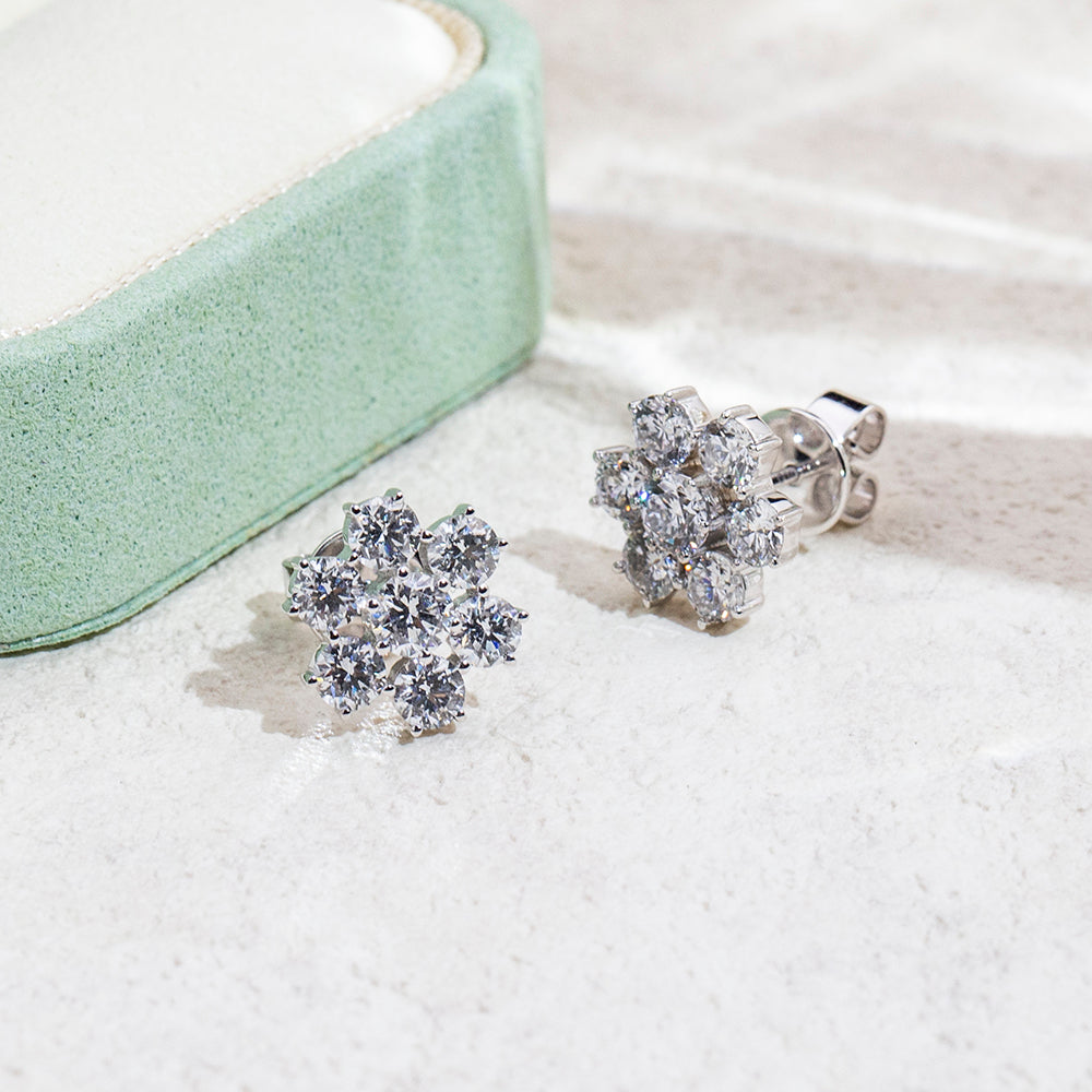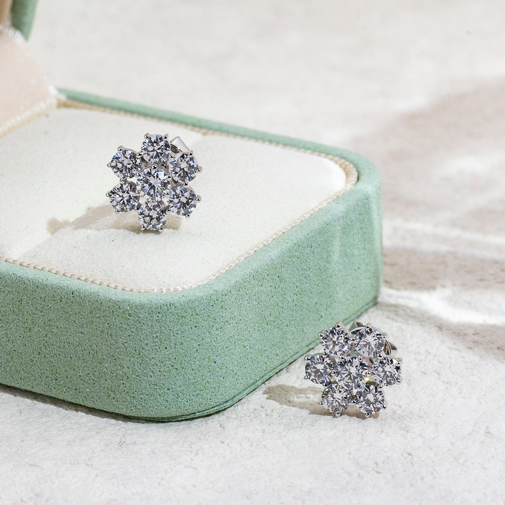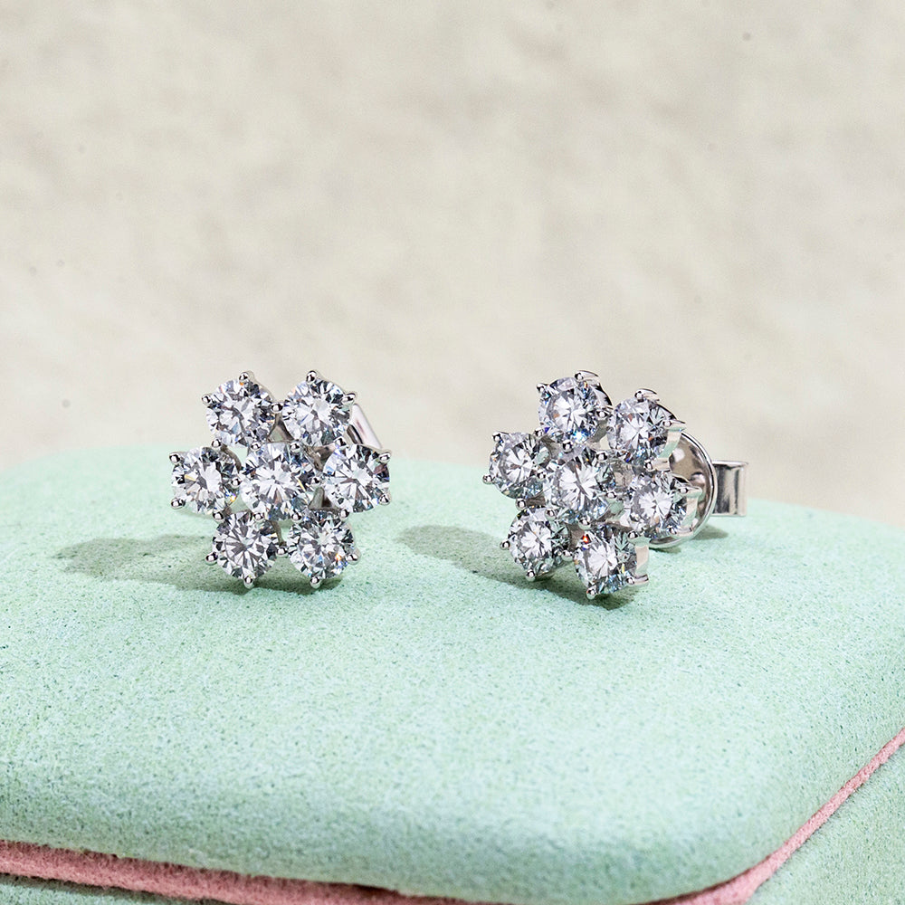 Meticulously crafted in high-polished 18K white gold, the earrings feature a cluster of lab-grown diamonds arranged in a floral burst. Each stone is brilliant-cut to maximize fire and clarity, reflecting light from every angle. The design evokes purity and precision, making it ideal for both formal occasions and elevated everyday wear.