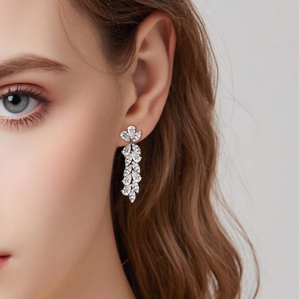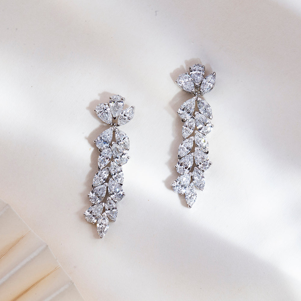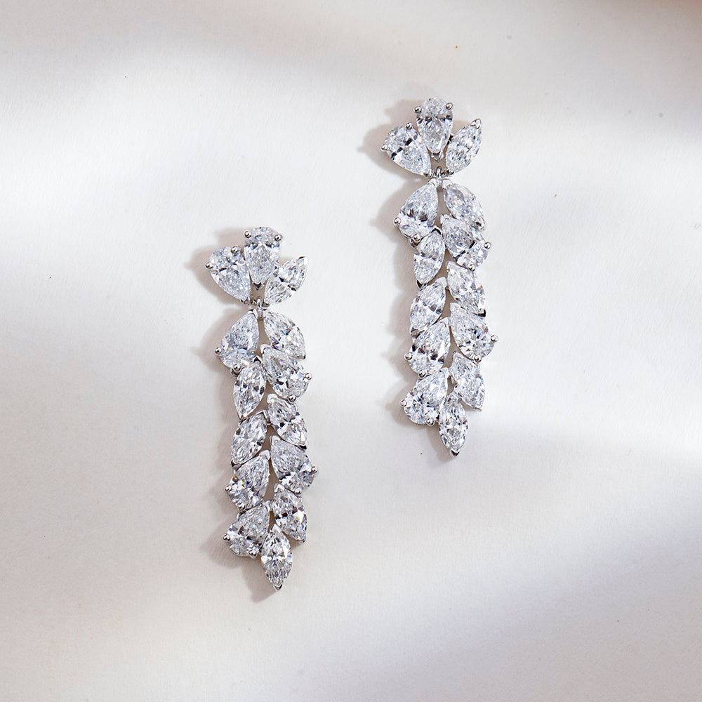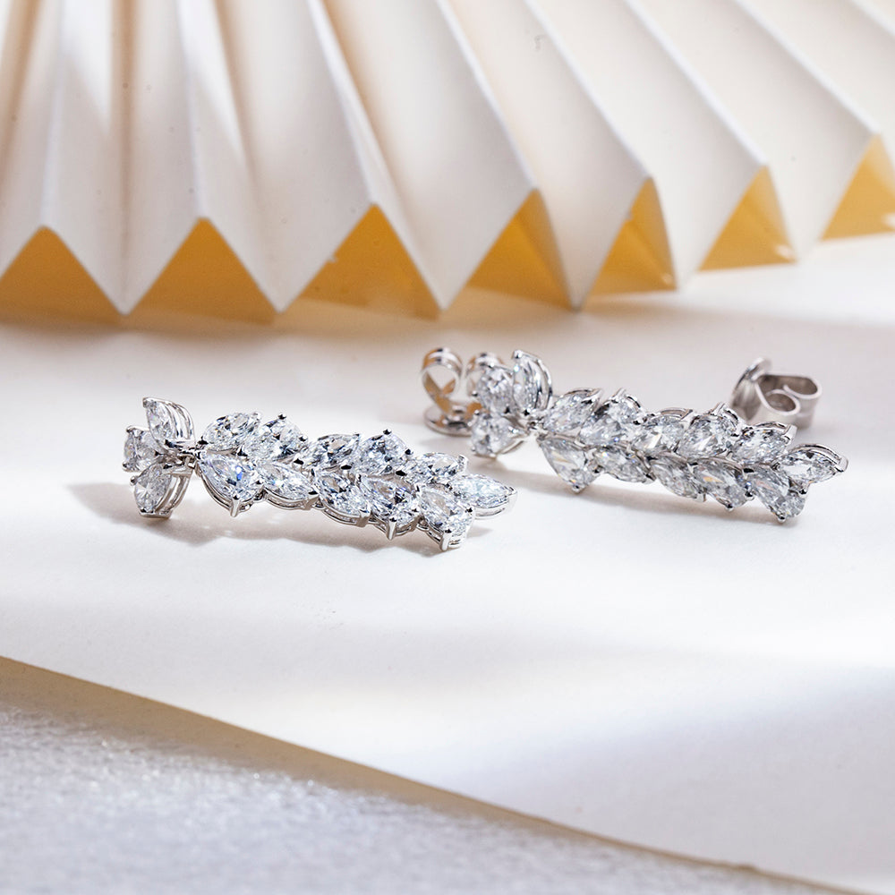 Each earring features a graceful arrangement of marquise-cut lab-grown diamonds, meticulously set in a vertical flow that mimics the silhouette of falling leaves. The top cluster blooms with three stones in a floral formation, giving way to a tapering trail of brilliance. The stones are mounted in high-polished 18K white gold.