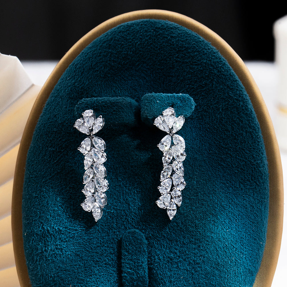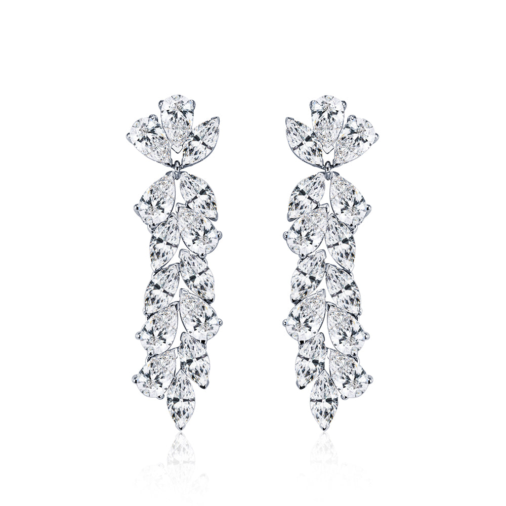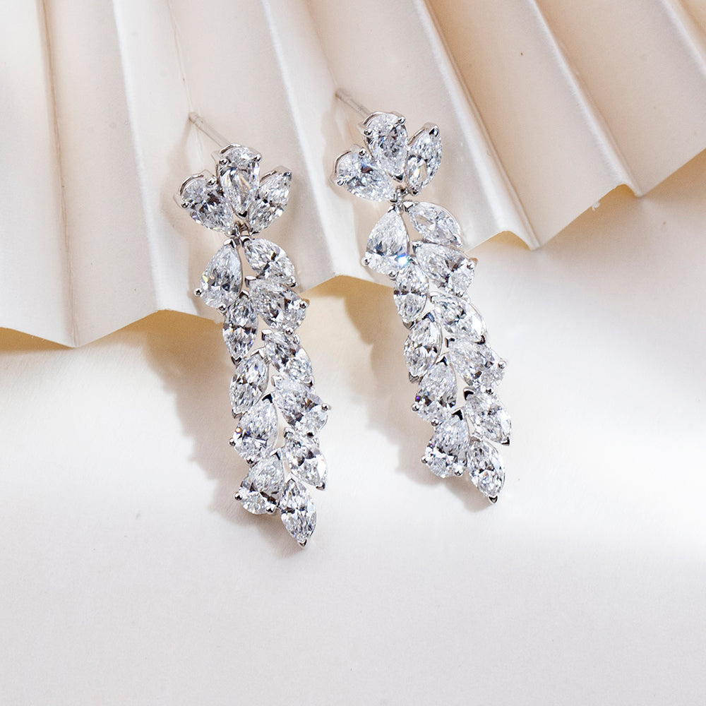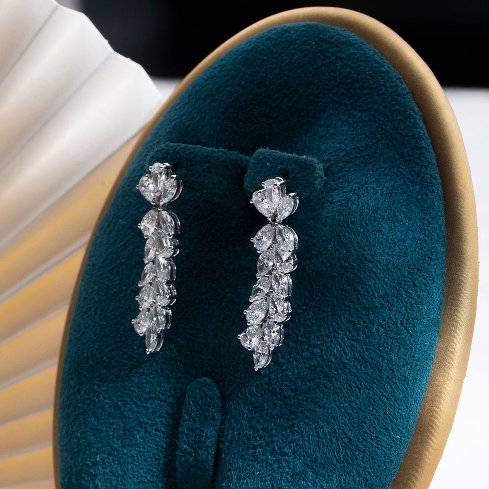 Each earring features a graceful arrangement of marquise-cut lab-grown diamonds, meticulously set in a vertical flow that mimics the silhouette of falling leaves. The top cluster blooms with three stones in a floral formation, giving way to a tapering trail of brilliance. The stones are mounted in high-polished 18K white gold.