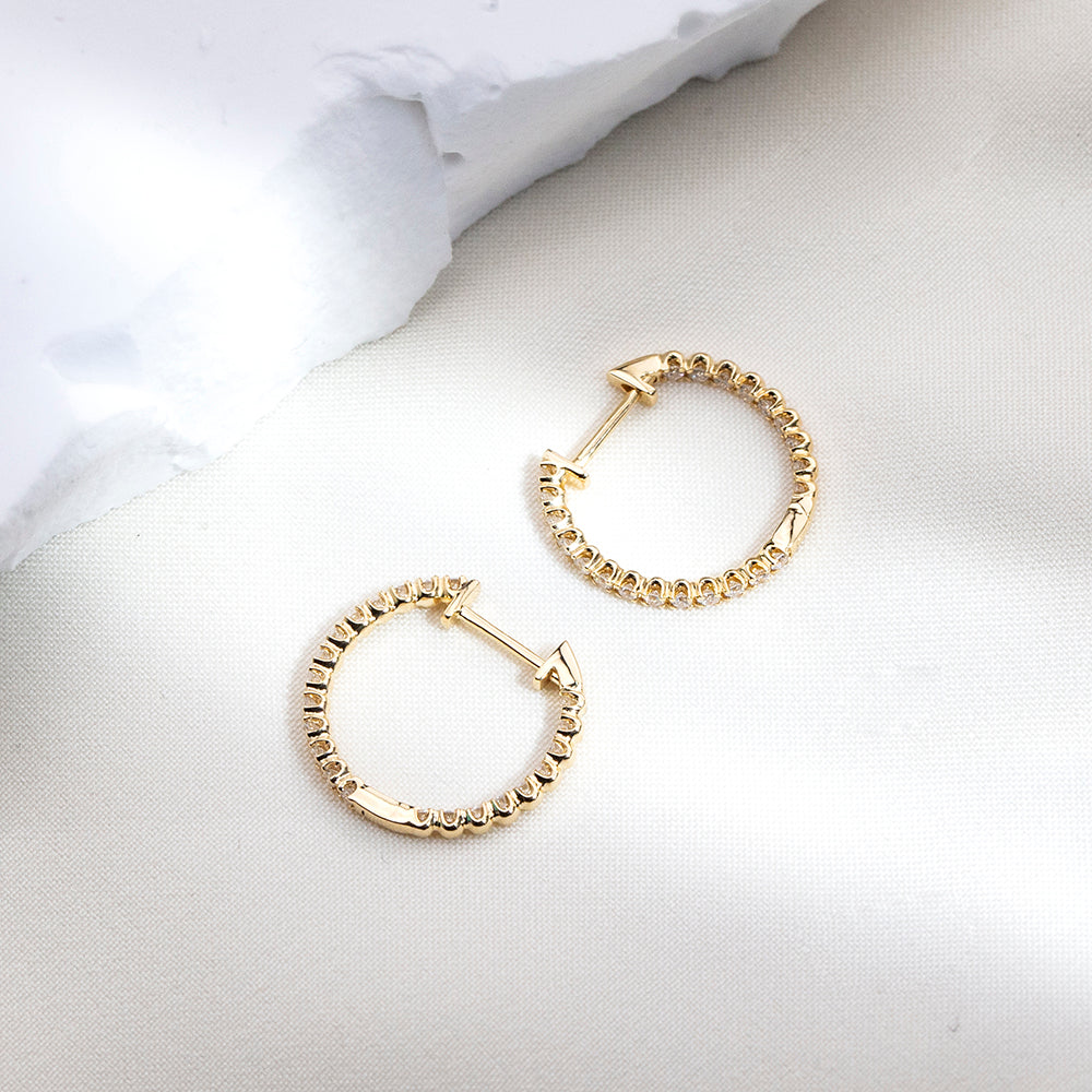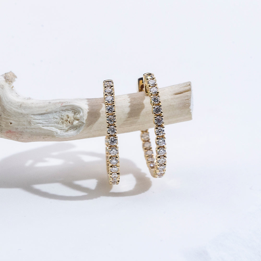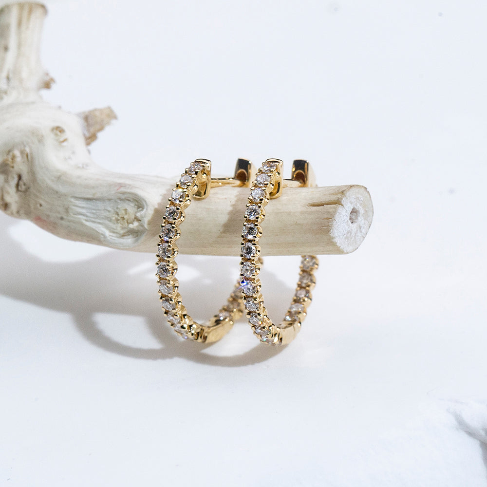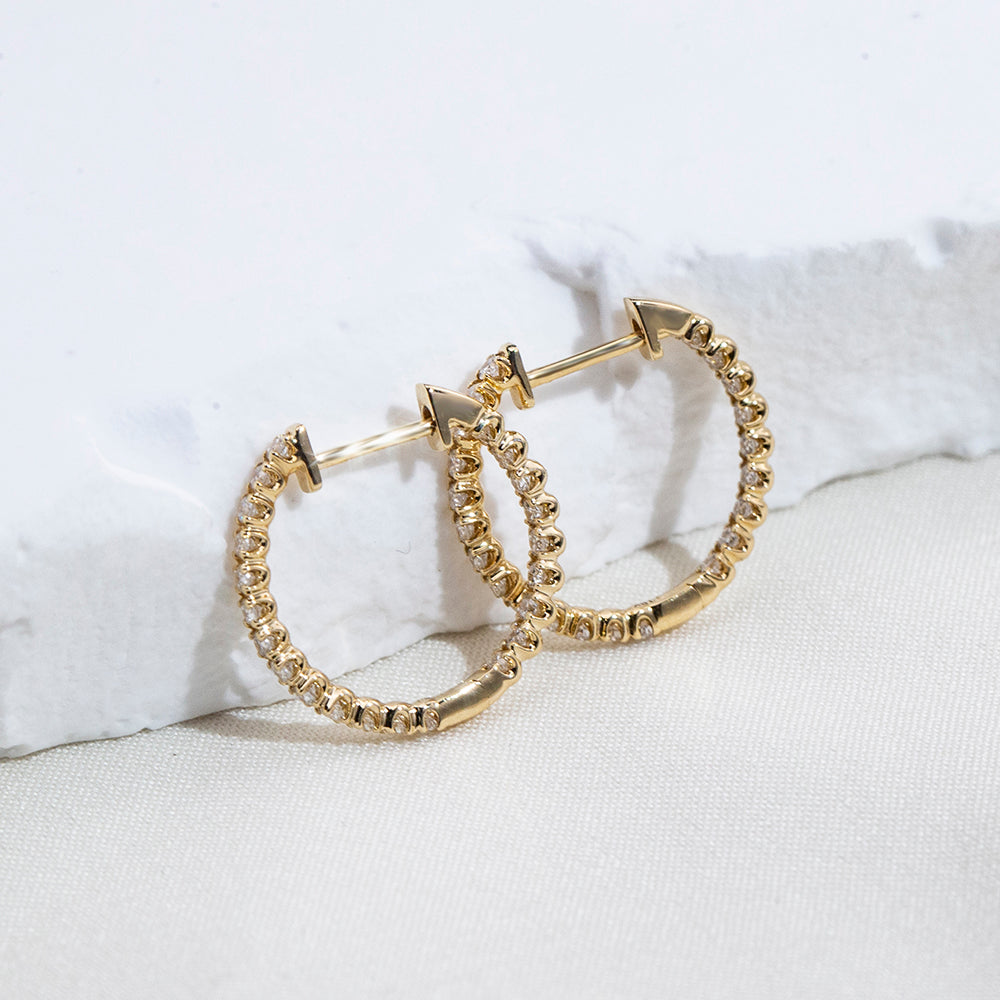 Each hoop is meticulously crafted in 18K recycled gold, available in white, yellow, or rose gold, and set with a seamless row of lab-grown diamonds, each round brilliant-cut to maximize fire and clarity. The stones are nestled along the outer edge, creating a radiant halo effect that catches light with every movement.