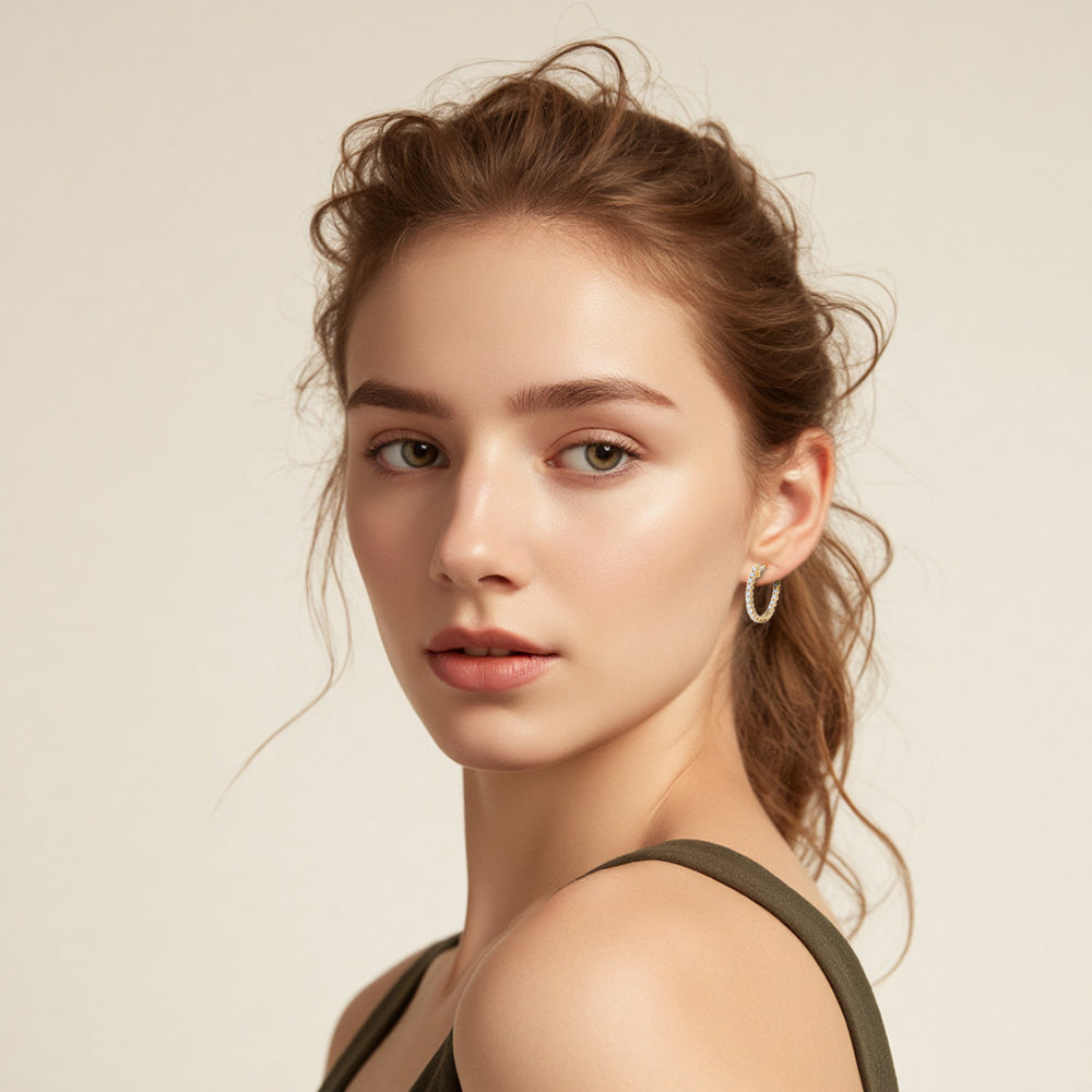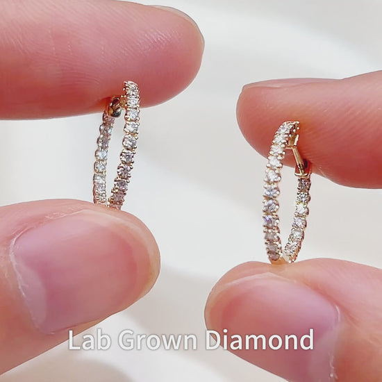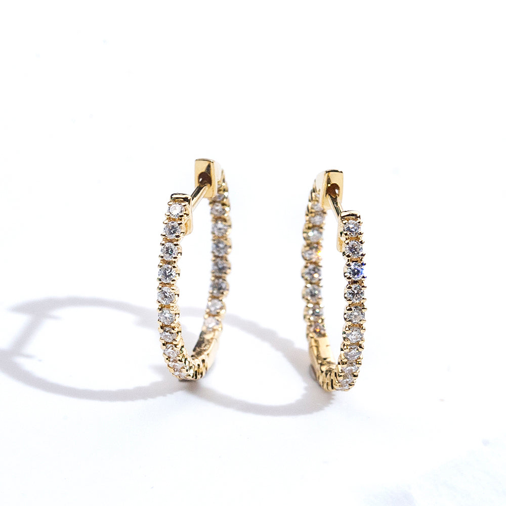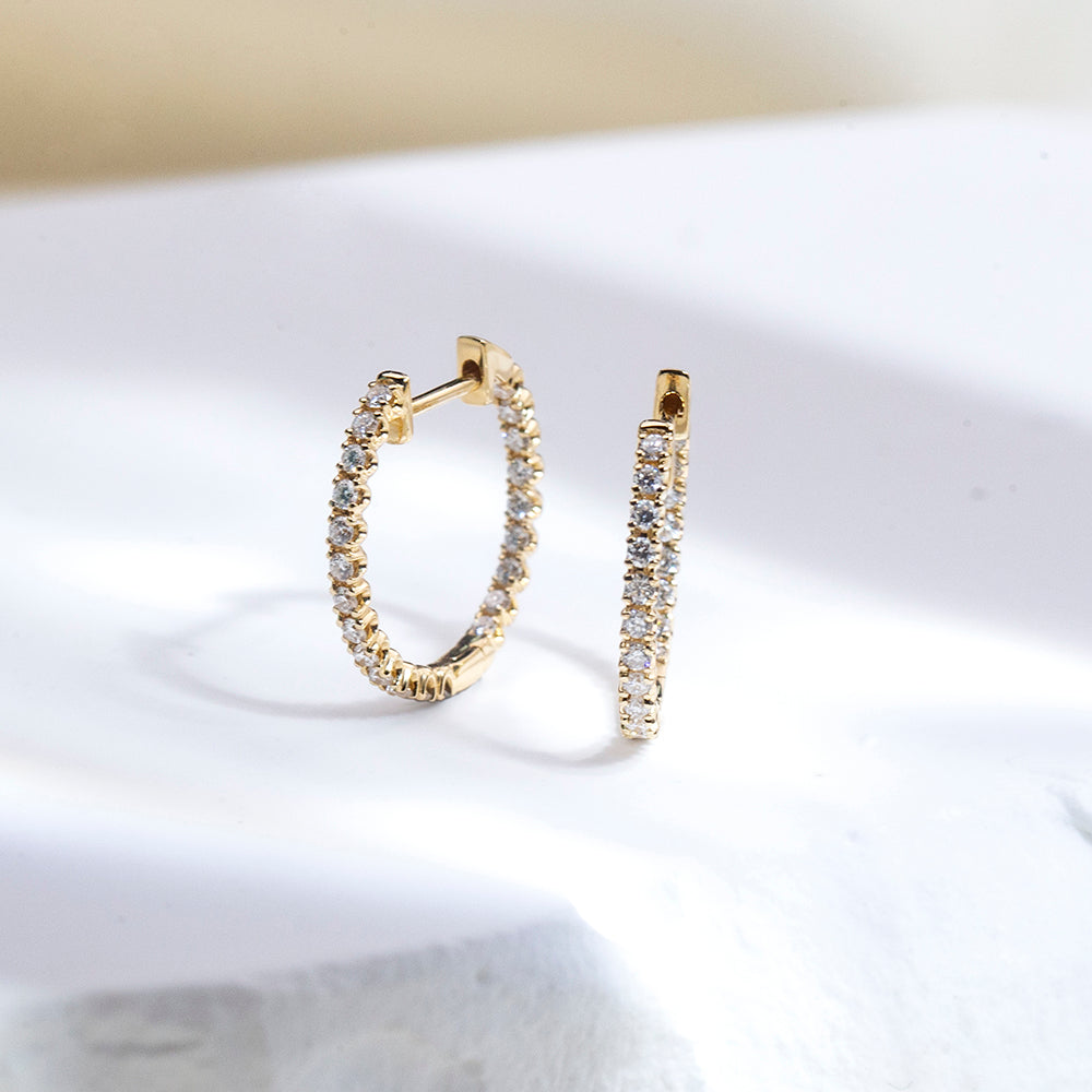 Each hoop is meticulously crafted in 18K recycled gold, available in white, yellow, or rose gold, and set with a seamless row of lab-grown diamonds, each round brilliant-cut to maximize fire and clarity. The stones are nestled along the outer edge, creating a radiant halo effect that catches light with every movement.