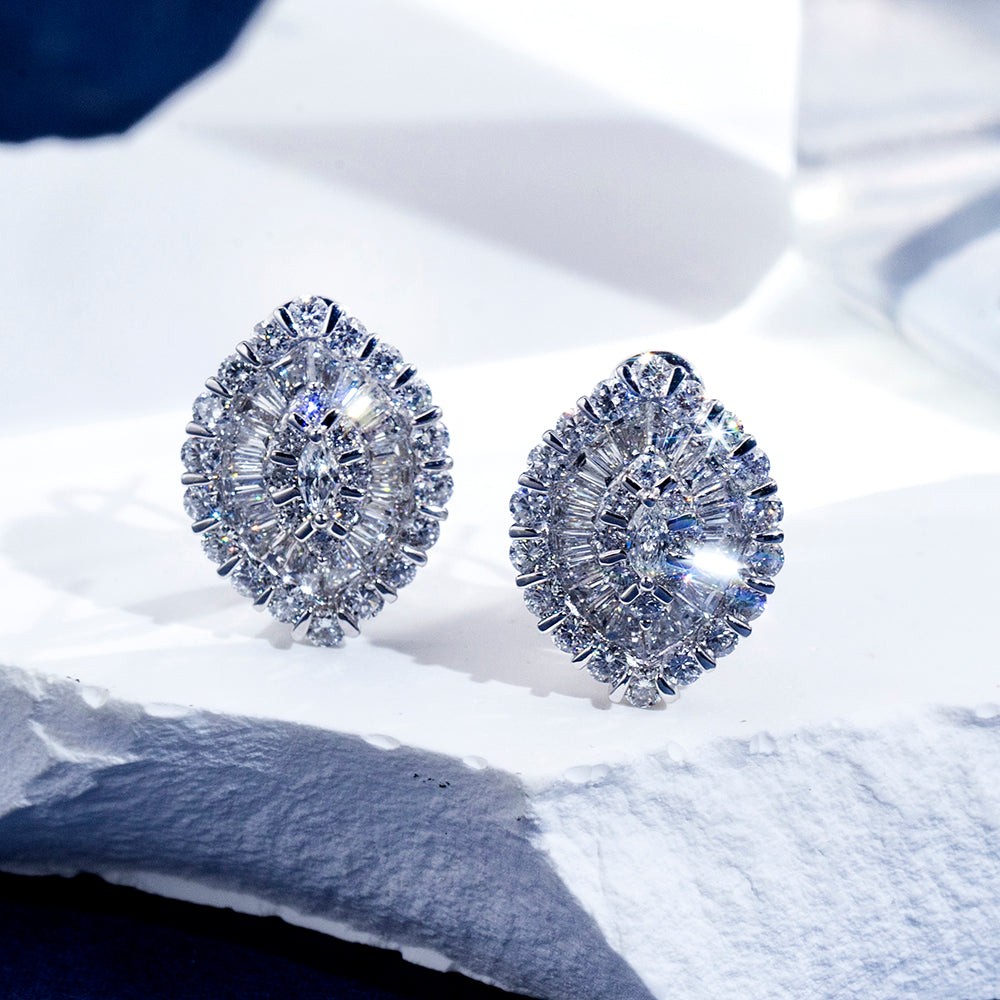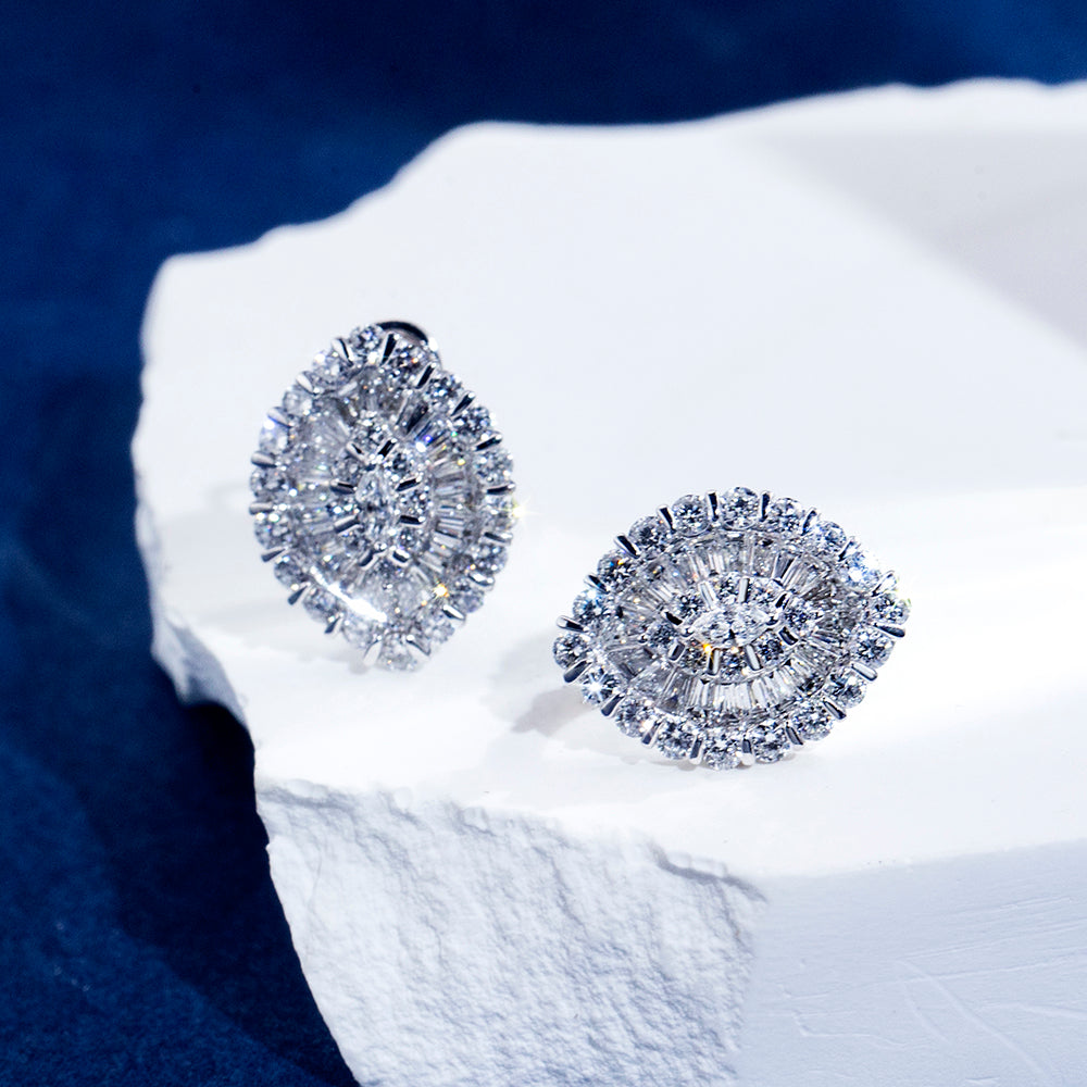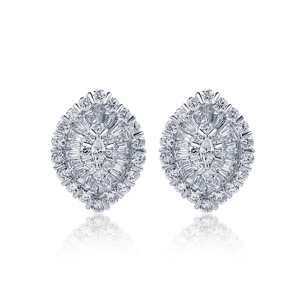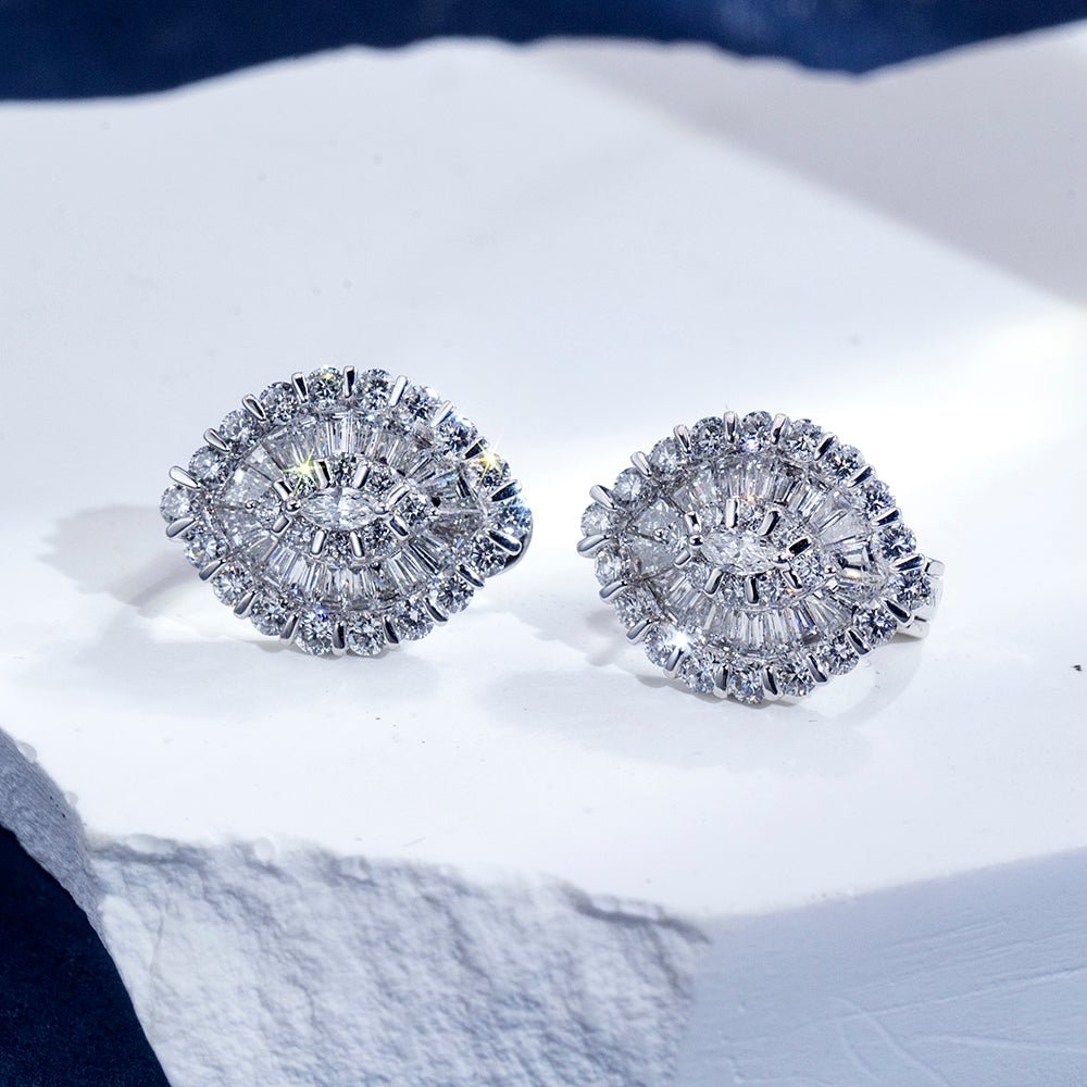 The design features a harmonious blend of marquise, baguette, and round brilliant-cut lab-created diamonds, each carefully set to reflect light from every angle. The stones are mounted in high-polished 18K white gold. The earrings are lightweight yet bold, designed to frame the face with a luminous aura.