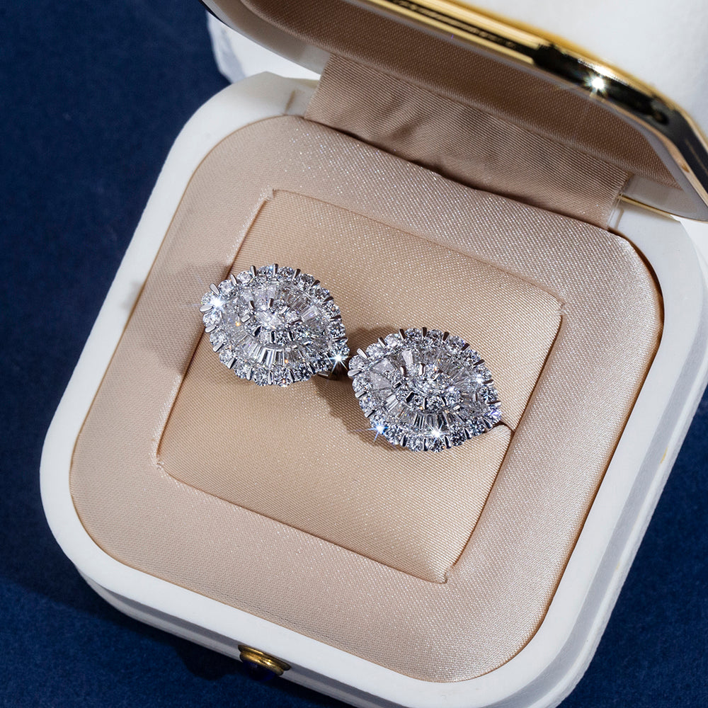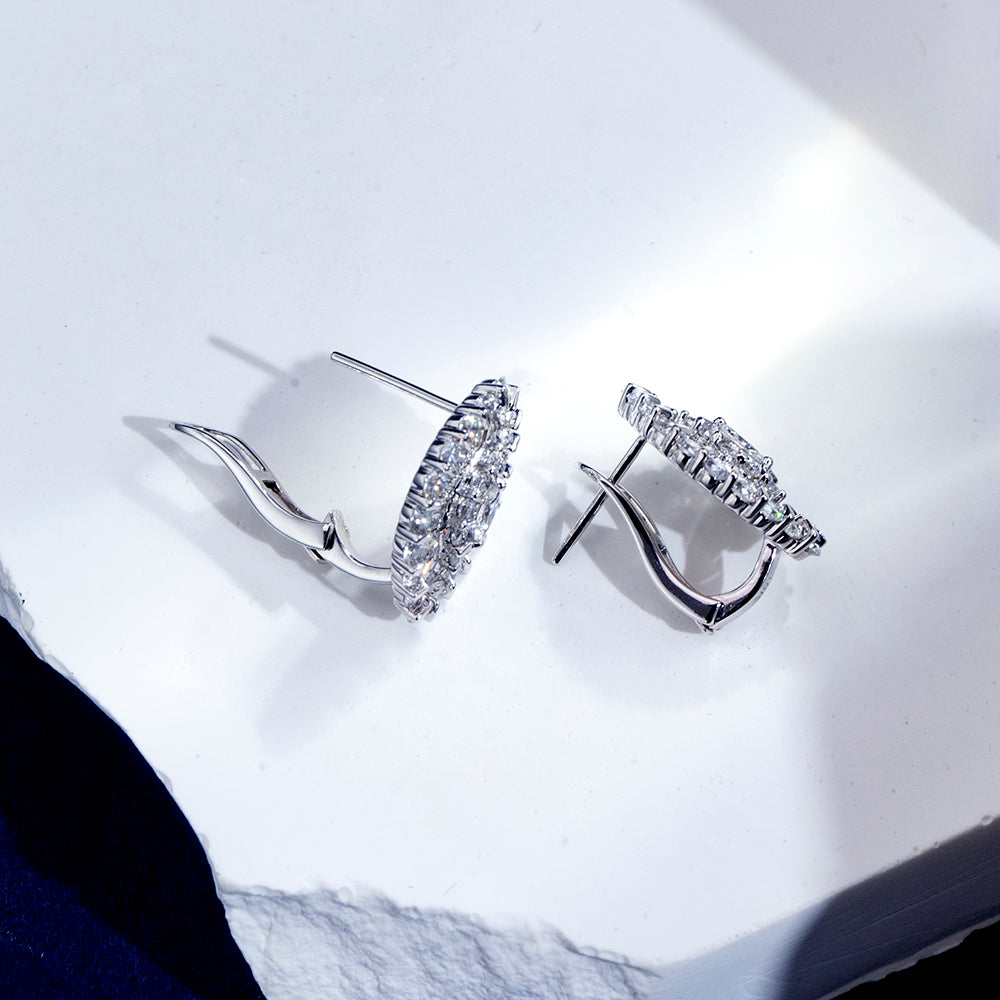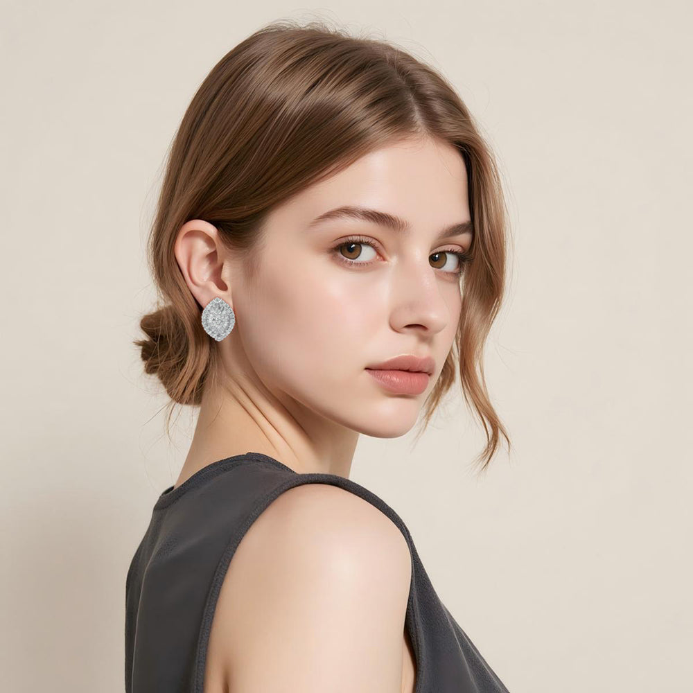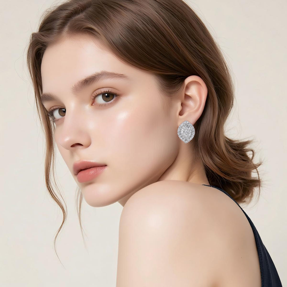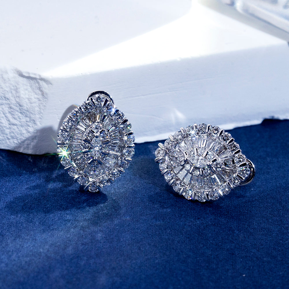The design features a harmonious blend of marquise, baguette, and round brilliant-cut lab-created diamonds, each carefully set to reflect light from every angle. The stones are mounted in high-polished 18K white gold. The earrings are lightweight yet bold, designed to frame the face with a luminous aura.