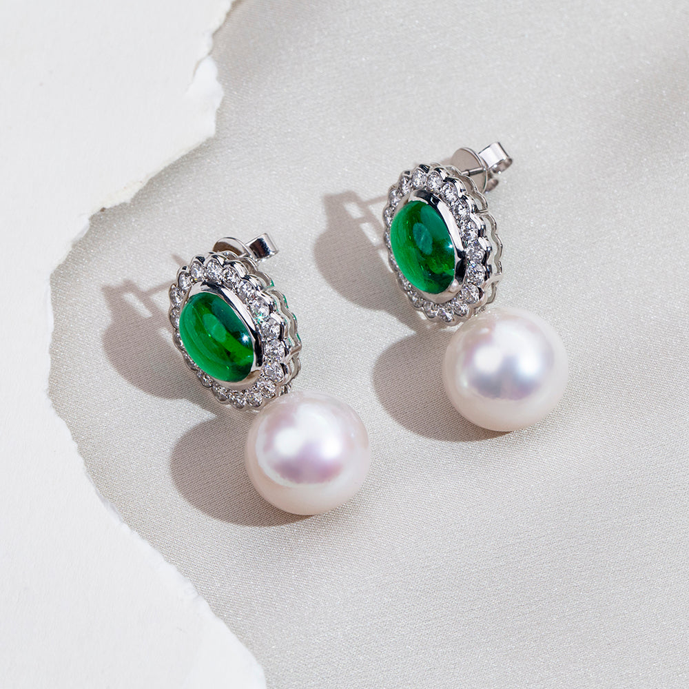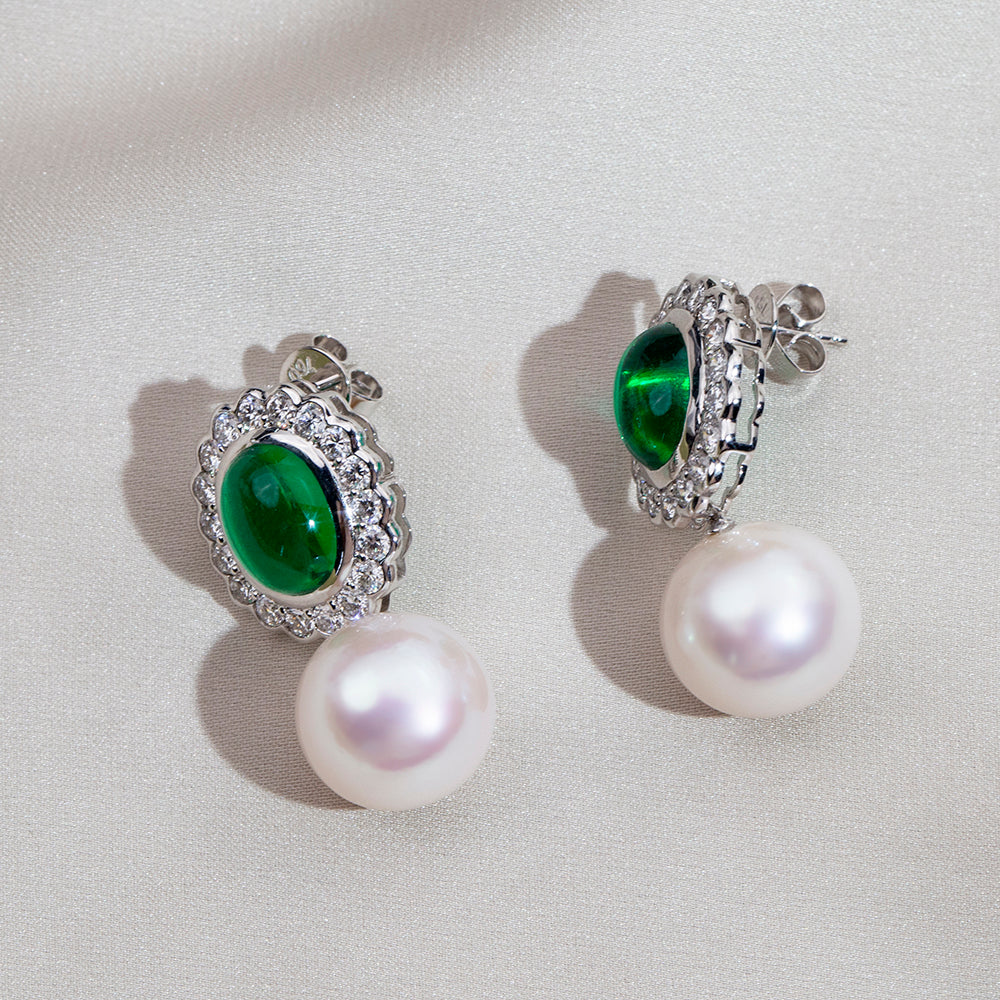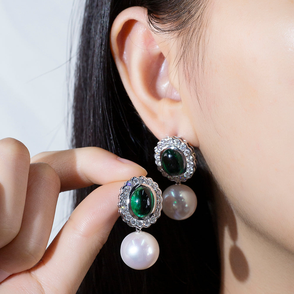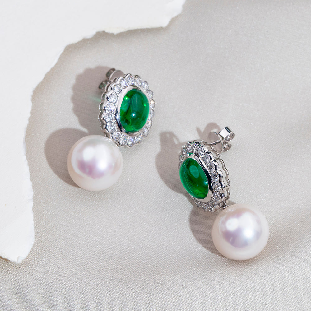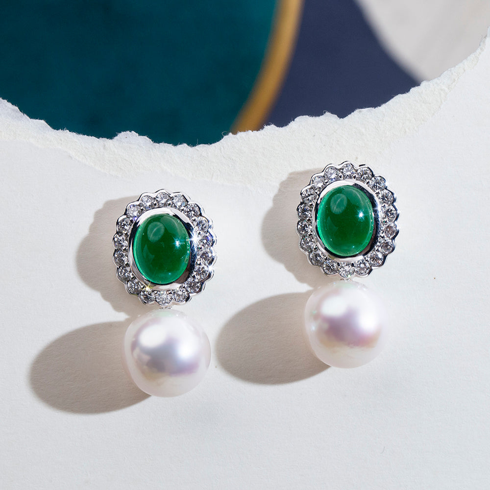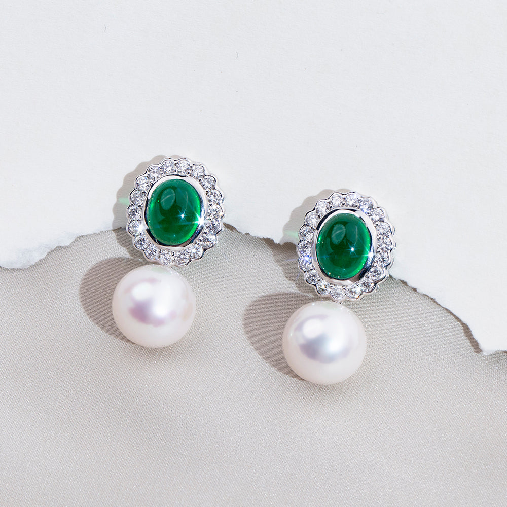 Each earring features a lab-created emerald in a smooth oval cabochon cut, surrounded by a halo of lab-grown diamonds that shimmer like morning frost. Suspended below is a single round cultured pearl, its soft luster adding depth and contrast to the vivid green above. The scalloped halo setting enhances the vintage charm while maintaining a contemporary edge.