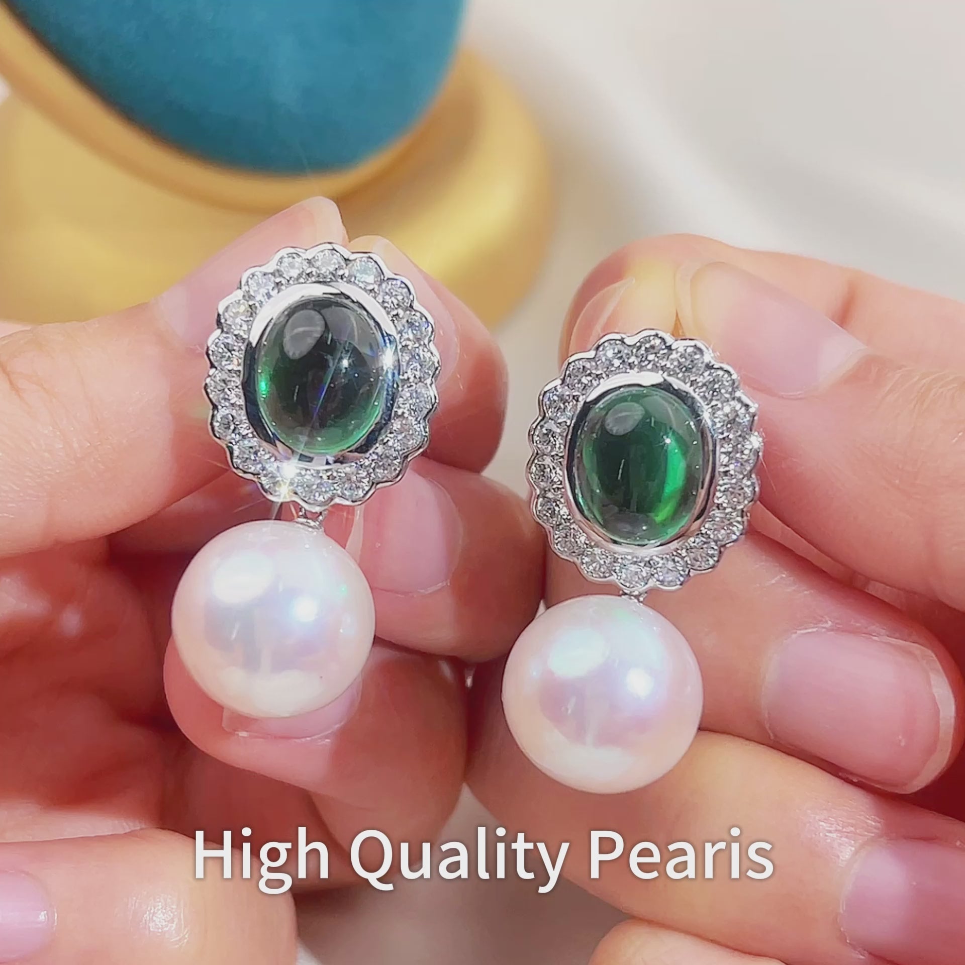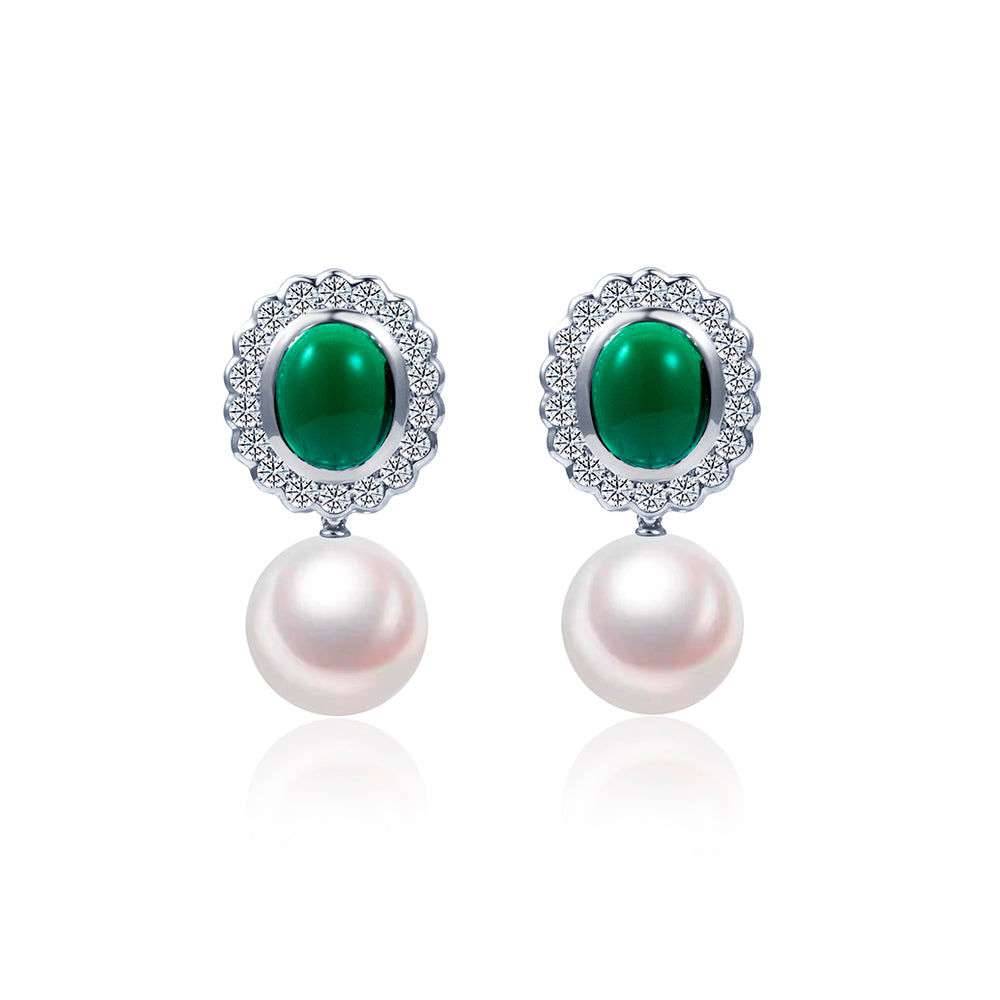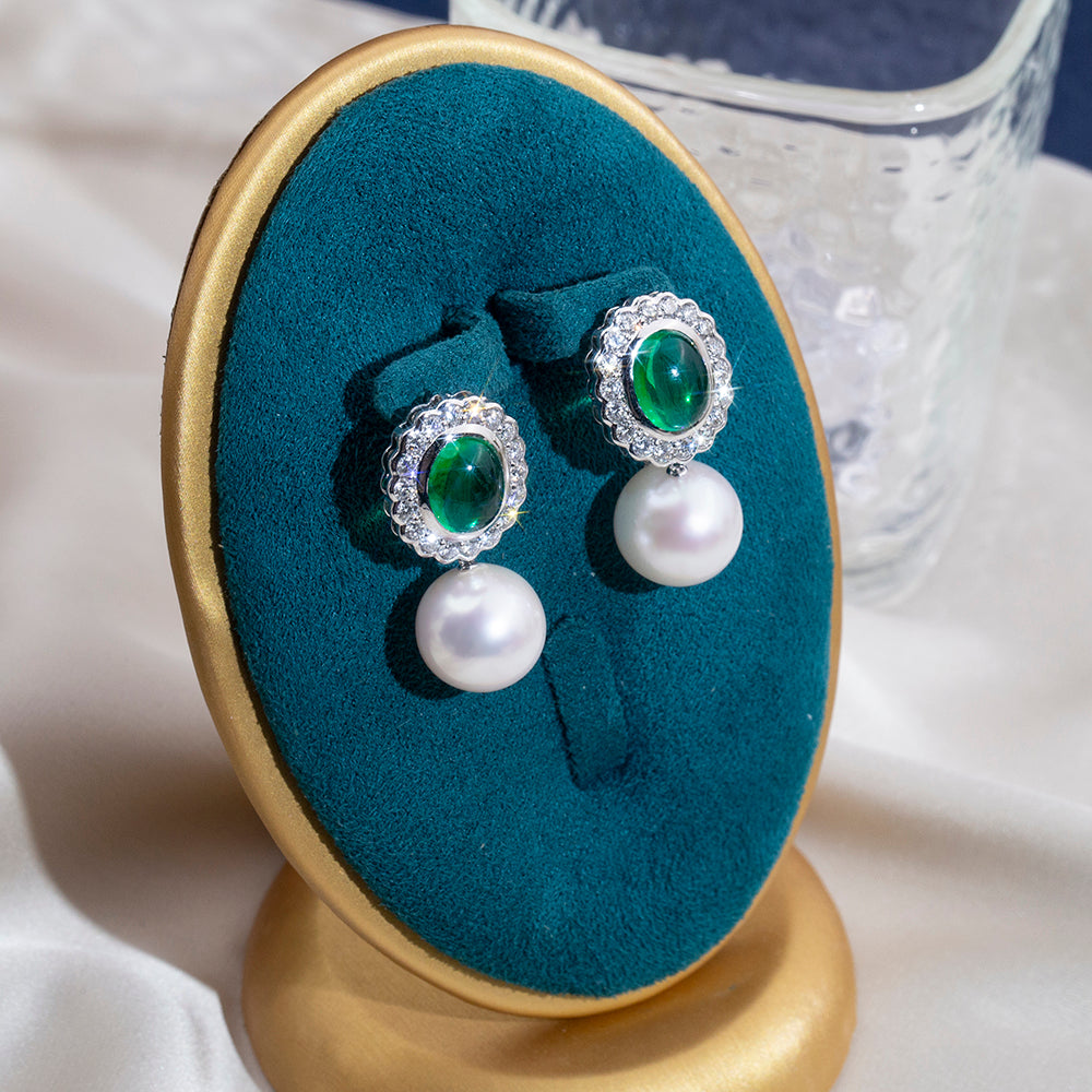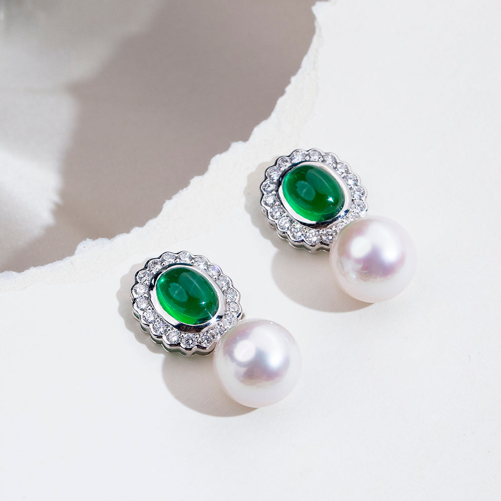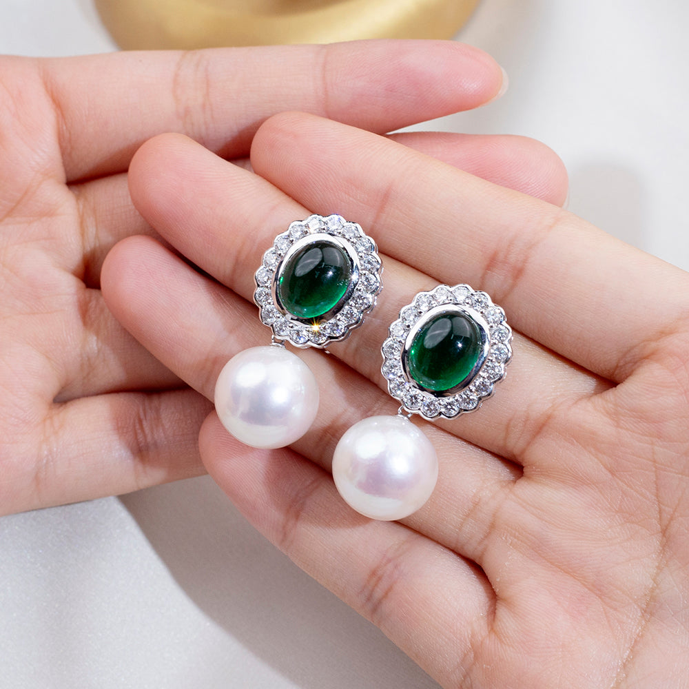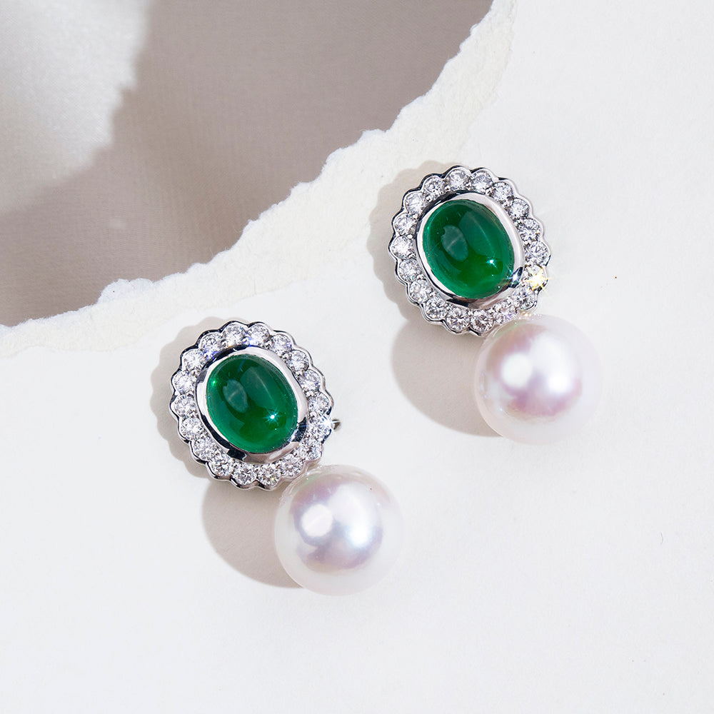Each earring features a lab-created emerald in a smooth oval cabochon cut, surrounded by a halo of lab-grown diamonds that shimmer like morning frost. Suspended below is a single round cultured pearl, its soft luster adding depth and contrast to the vivid green above. The scalloped halo setting enhances the vintage charm while maintaining a contemporary edge.