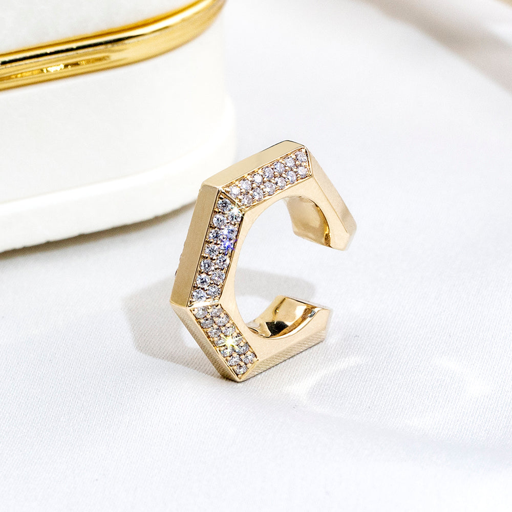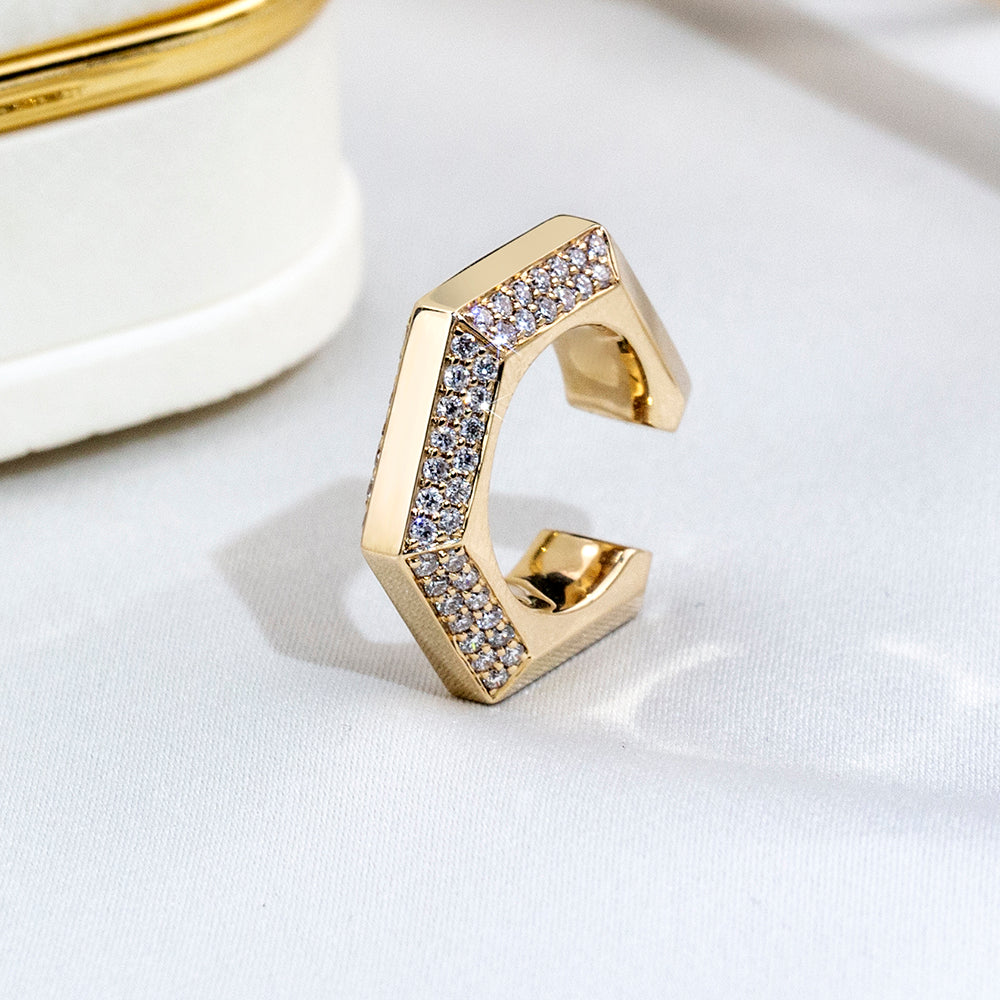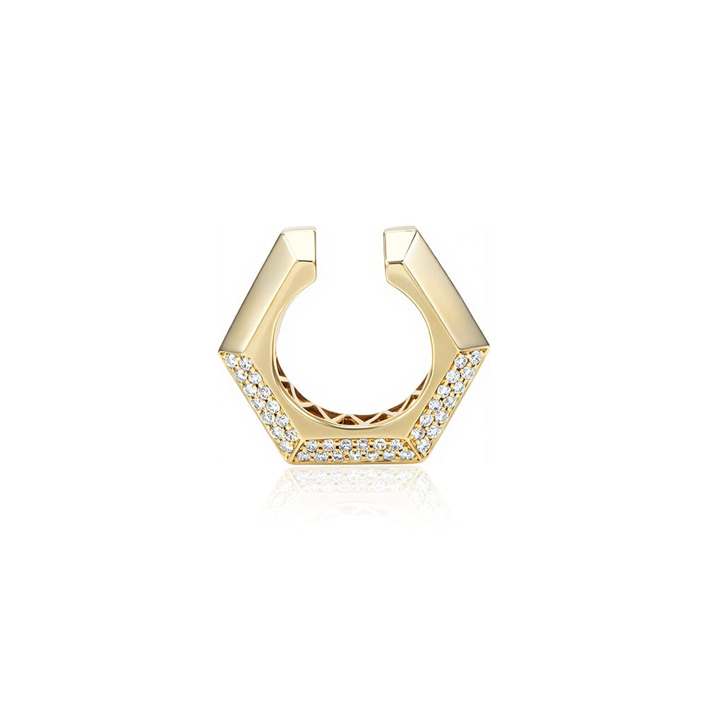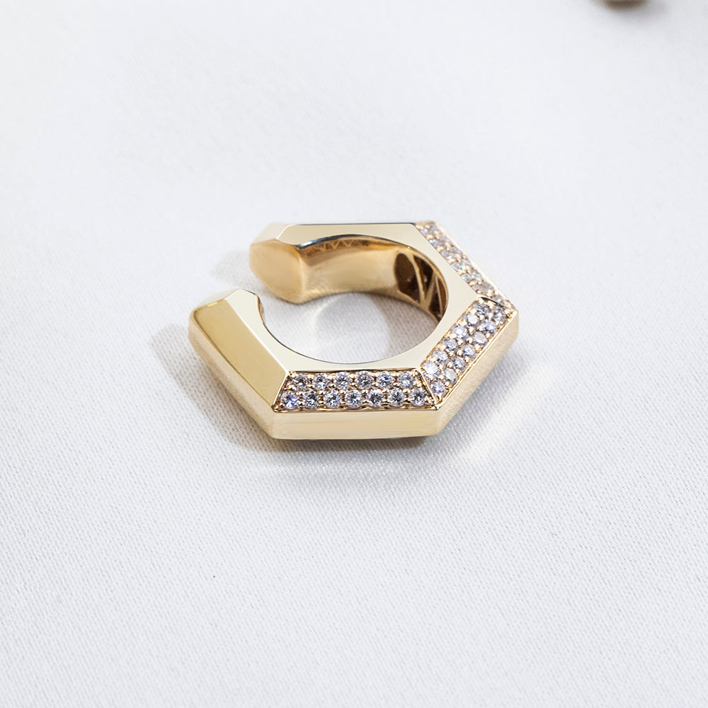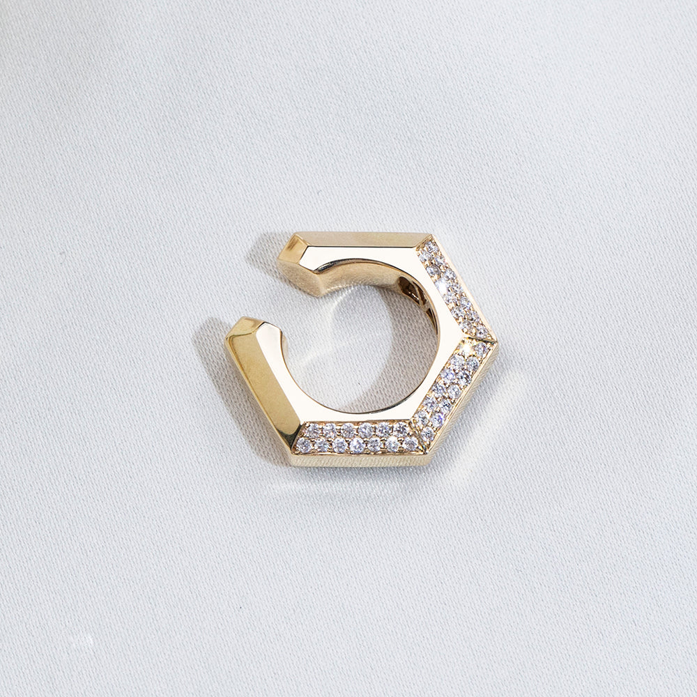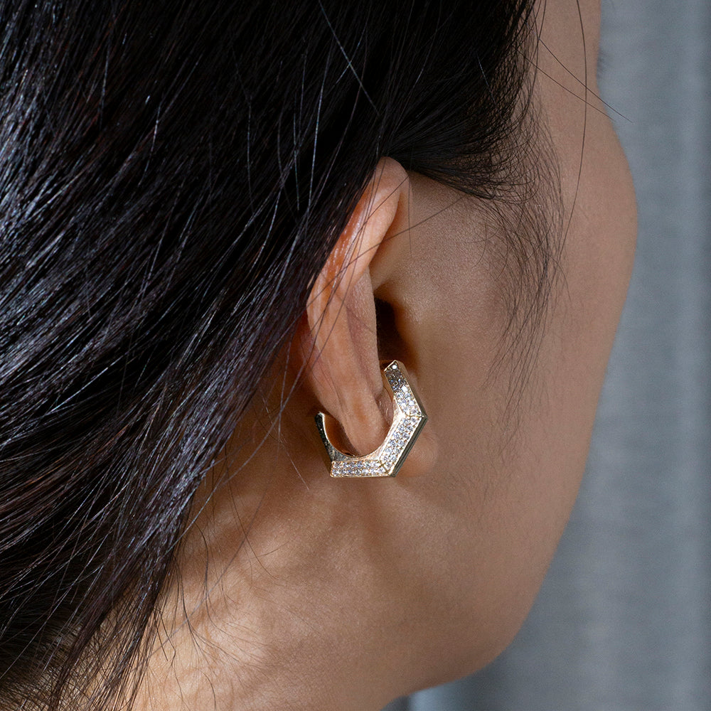 The design features a hexagonal silhouette with a partial open top, encrusted along the lower arc with three rows of lab-grown diamonds, each precisely pavé-set to maximize brilliance. The inner surface reveals a lattice-like texture, adding depth and intrigue to the minimalist form. Whether worn as a stud, cuff, or drop, the angular profile creates a striking contrast against the softness of the skin.