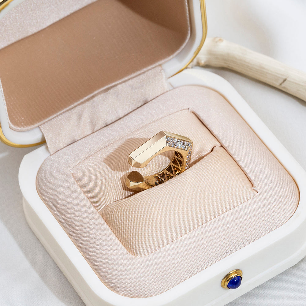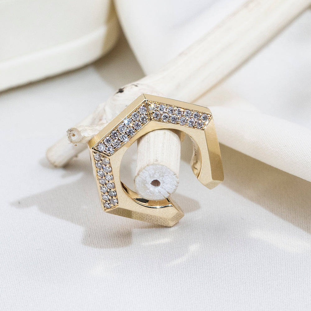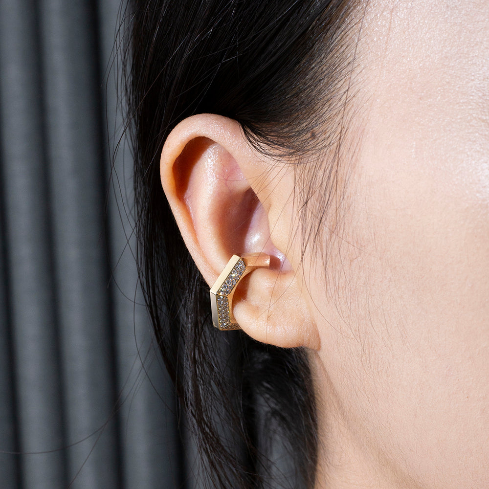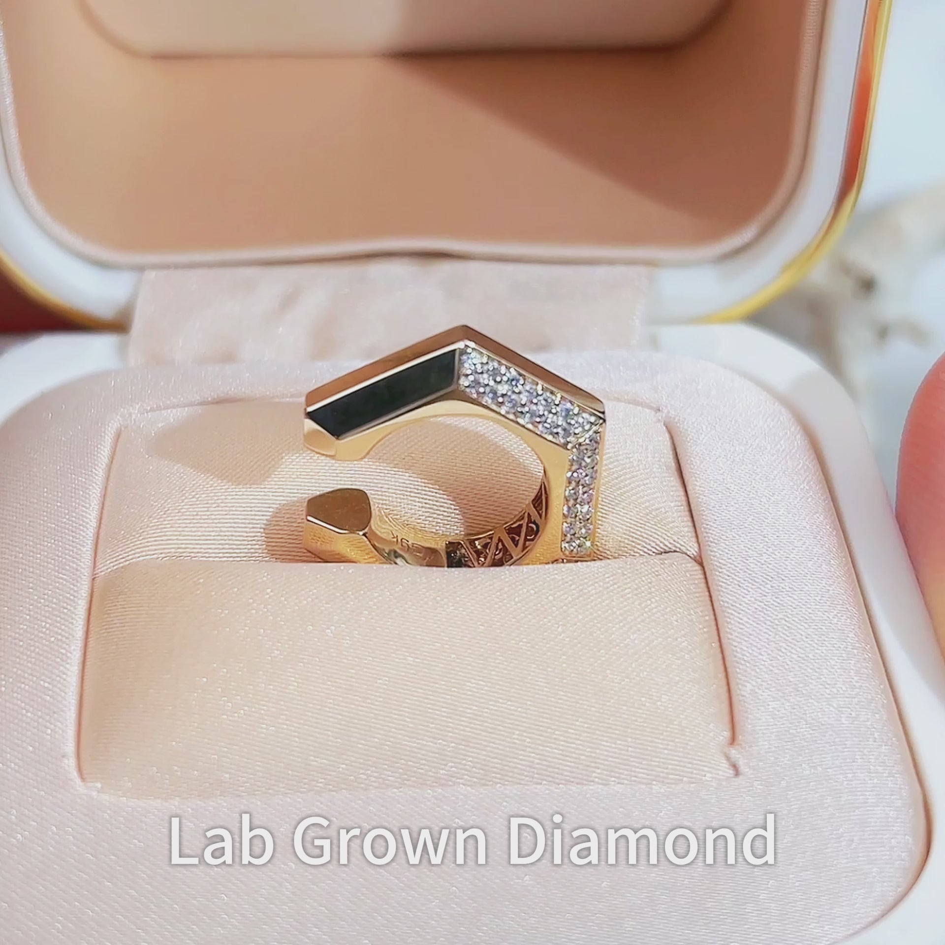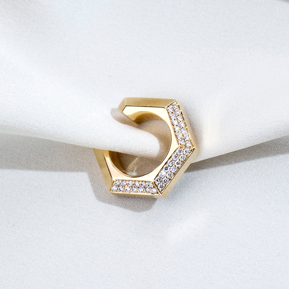 The design features a hexagonal silhouette with a partial open top, encrusted along the lower arc with three rows of lab-grown diamonds, each precisely pavé-set to maximize brilliance. The inner surface reveals a lattice-like texture, adding depth and intrigue to the minimalist form. Whether worn as a stud, cuff, or drop, the angular profile creates a striking contrast against the softness of the skin.