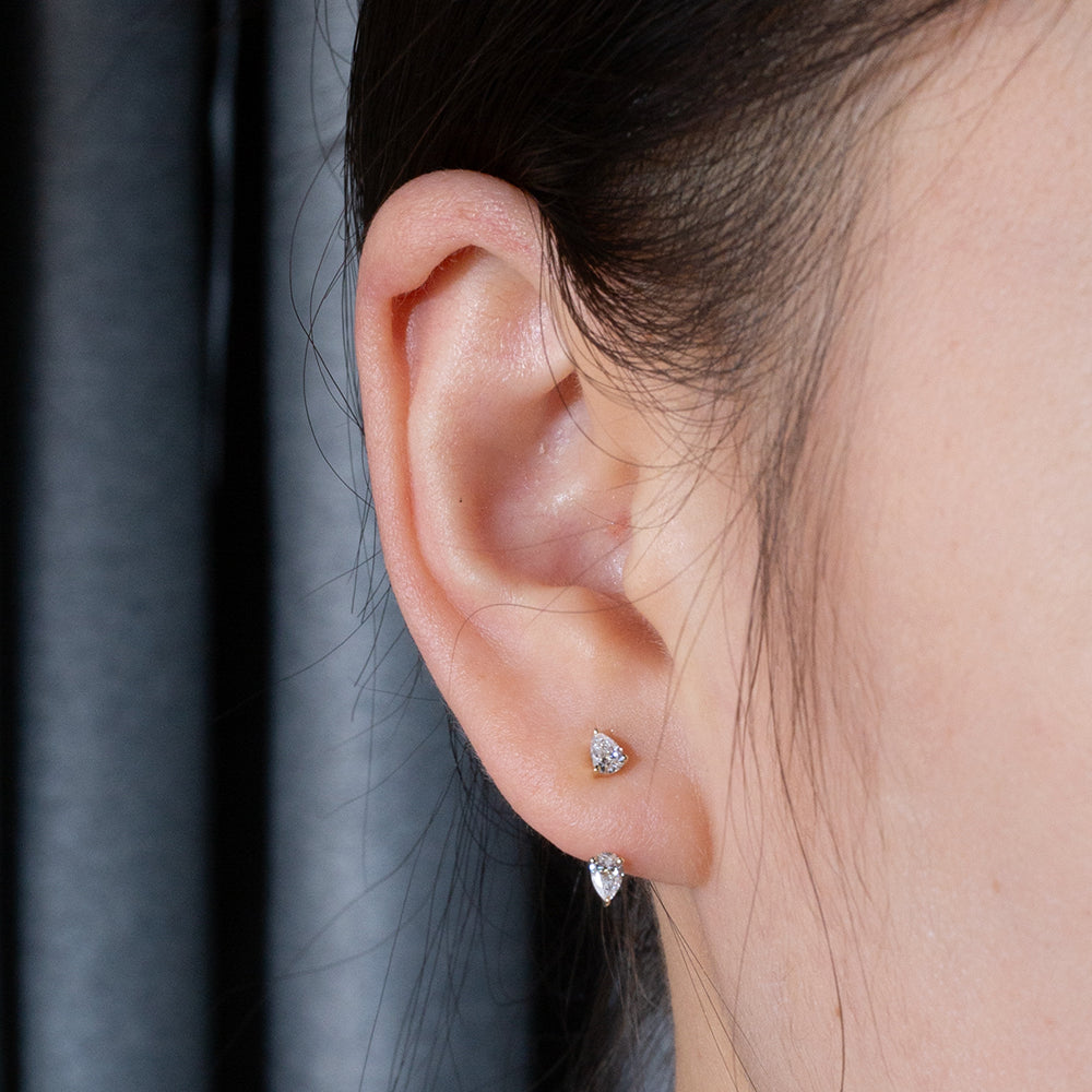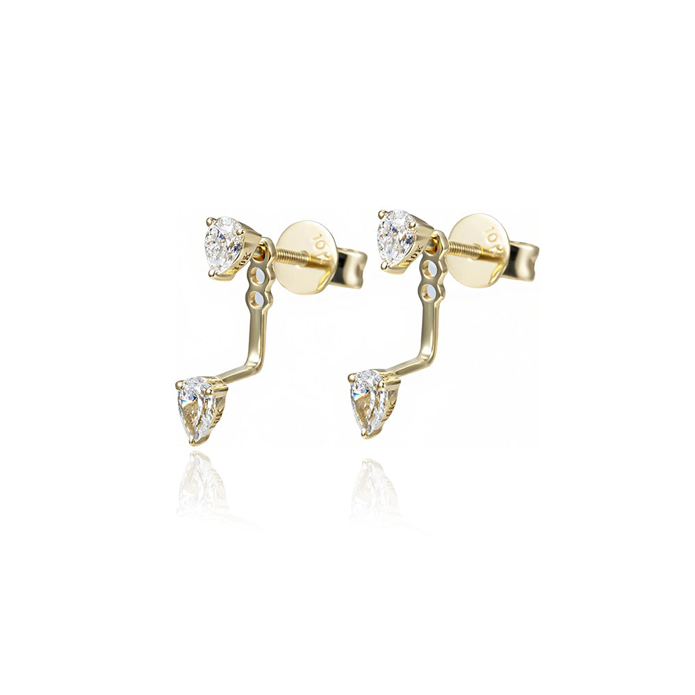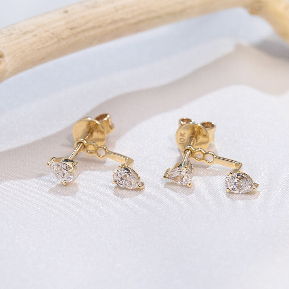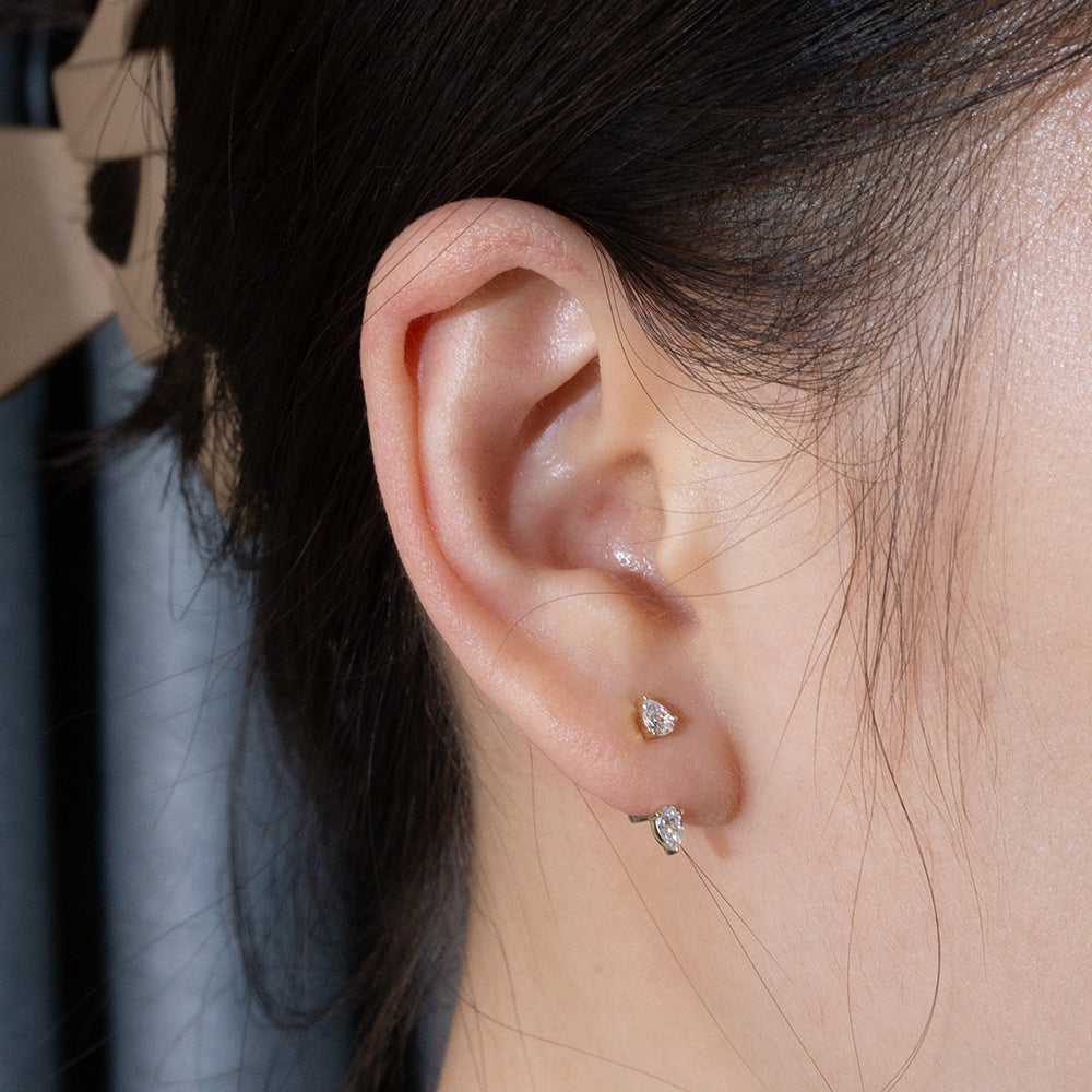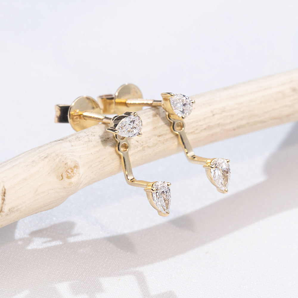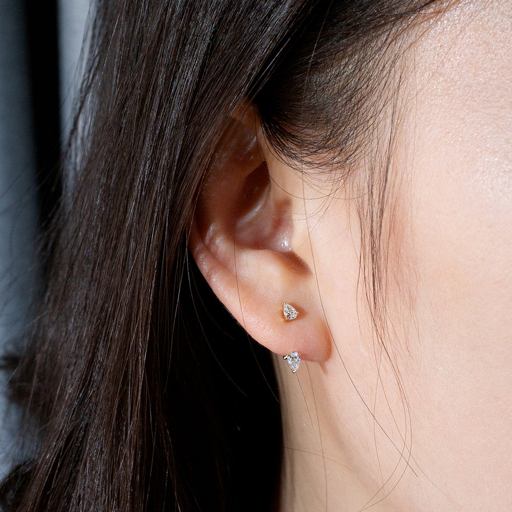 The pear-cut silhouetteโrounded at one end, tapering to a fine pointโoffers a graceful elongation that flatters the face and catches light with every movement. Set in a minimalist three-prong mount, the stones appear to float, creating a sense of weightless brilliance.