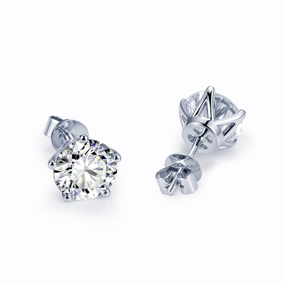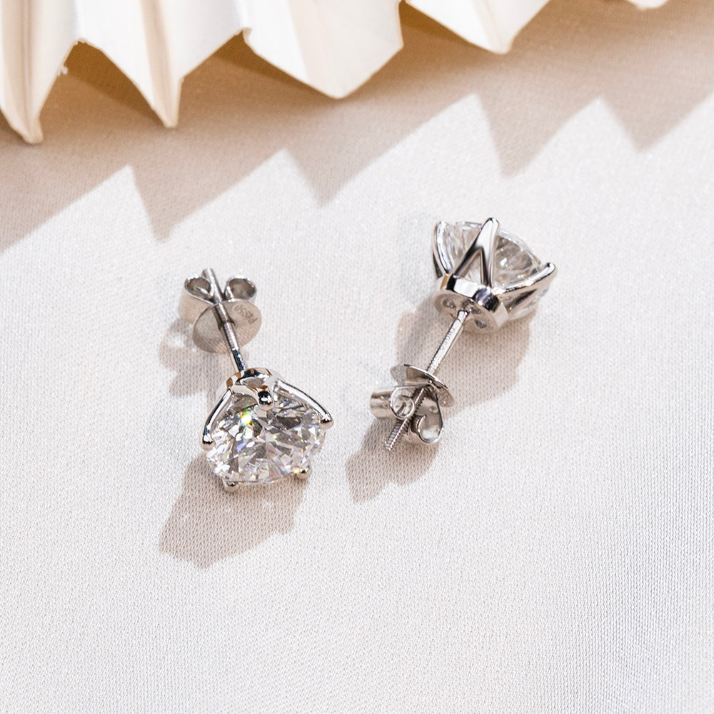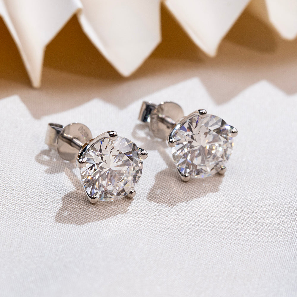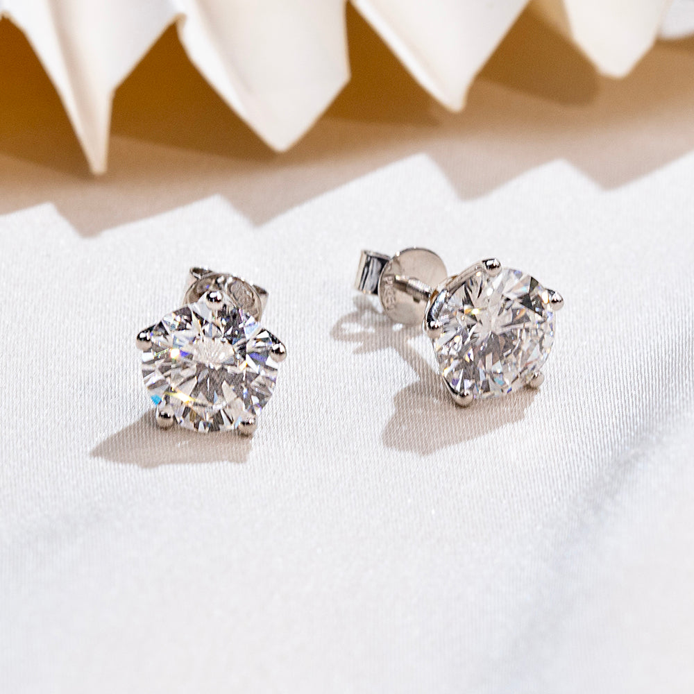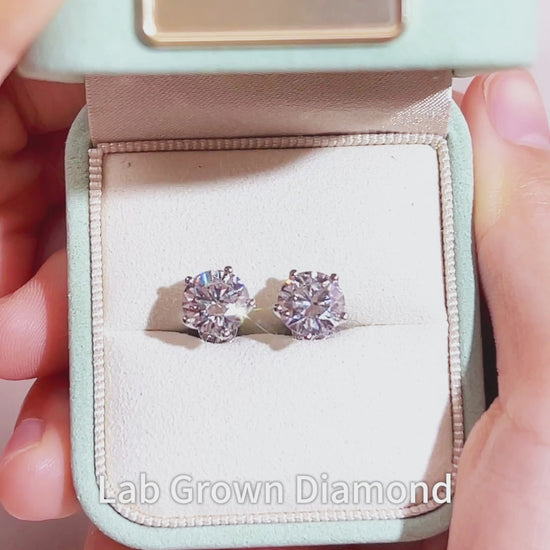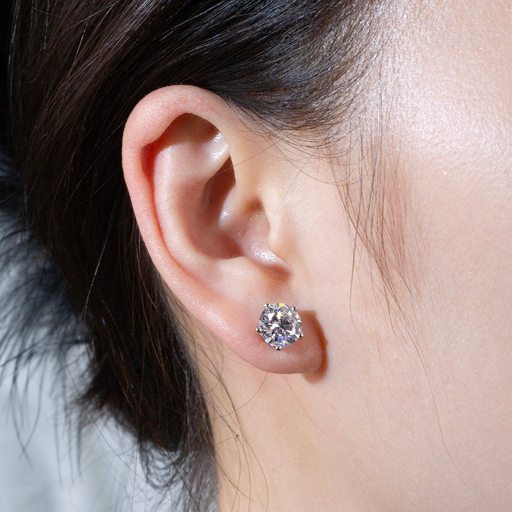At the heart of each earring lies a round-cut lab-grown diamond, meticulously faceted to capture light from every angle. The stones are held in a four-prong crown setting, allowing maximum exposure to brilliance while offering secure, graceful framing. The design is minimal yet commandingโperfect for everyday radiance or elevated occasions.