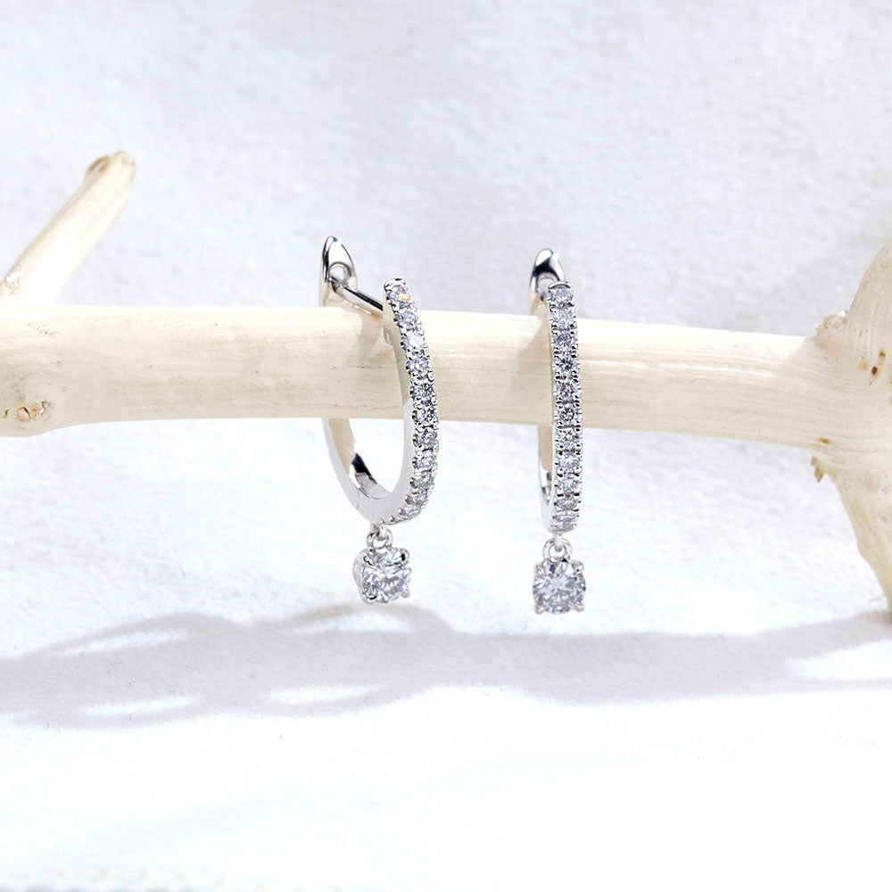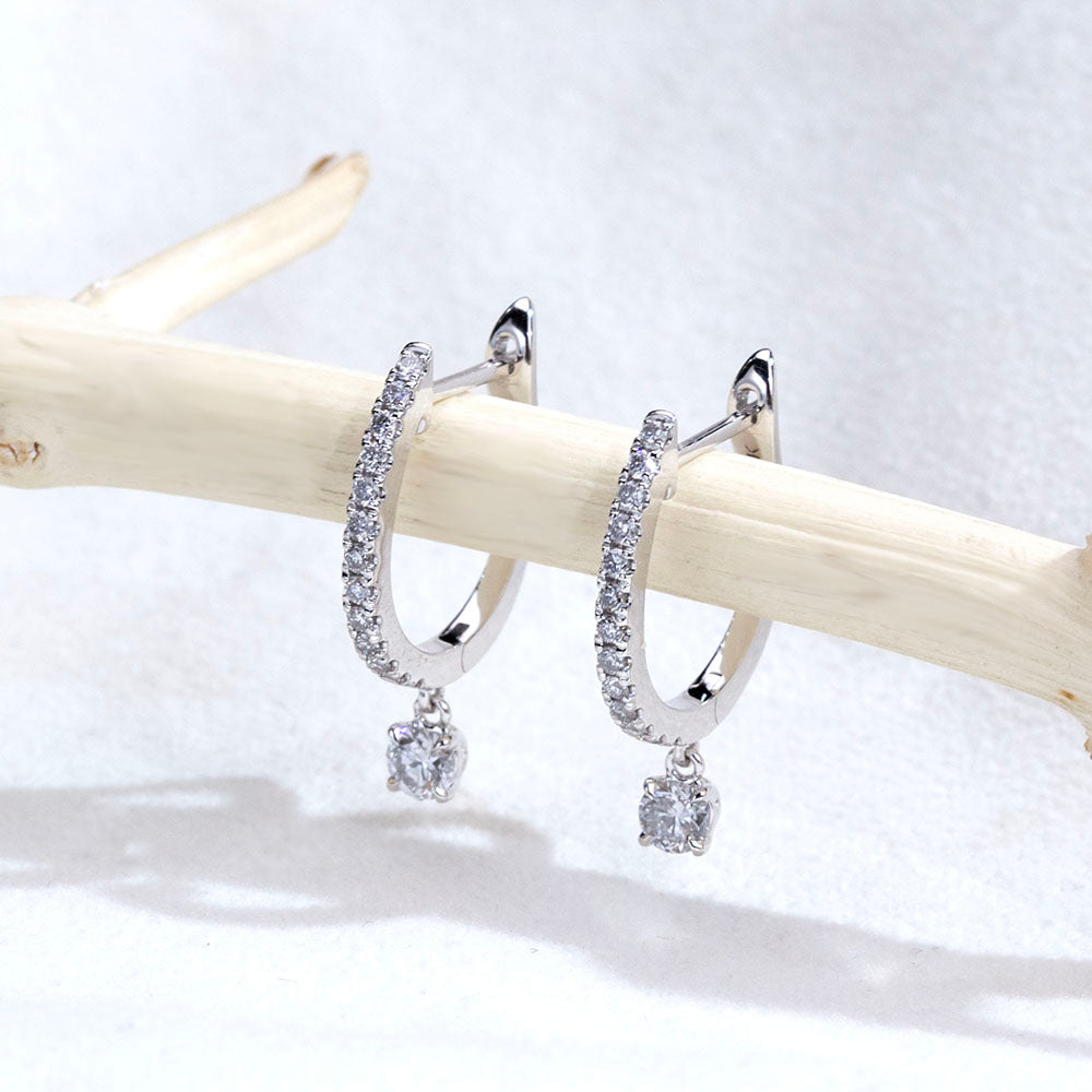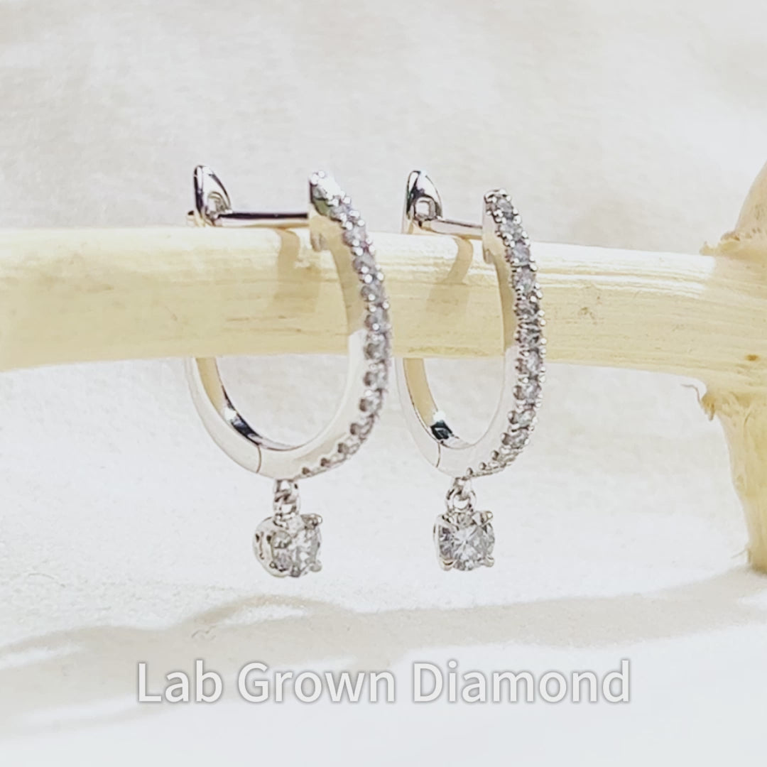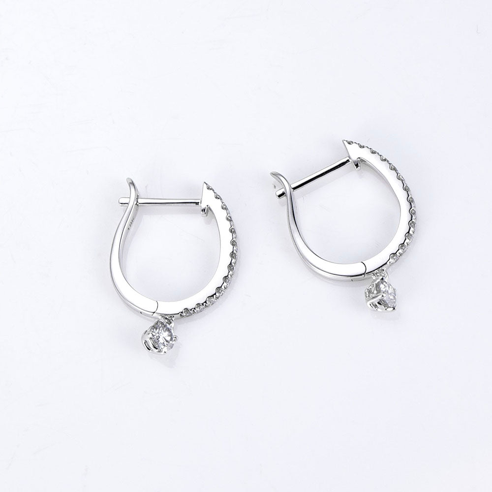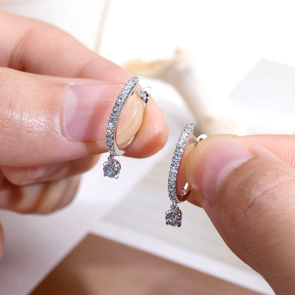 The front curve of each earring is encrusted with lab-grown round-cut diamonds, pavé-set to create a seamless shimmer. Suspended from the base is a single solitaire lab-created diamond, dancing freely with movement and catching light like a star in orbit. The contrast between the structured hoop and the fluid drop creates a dynamic silhouette—refined yet radiant.