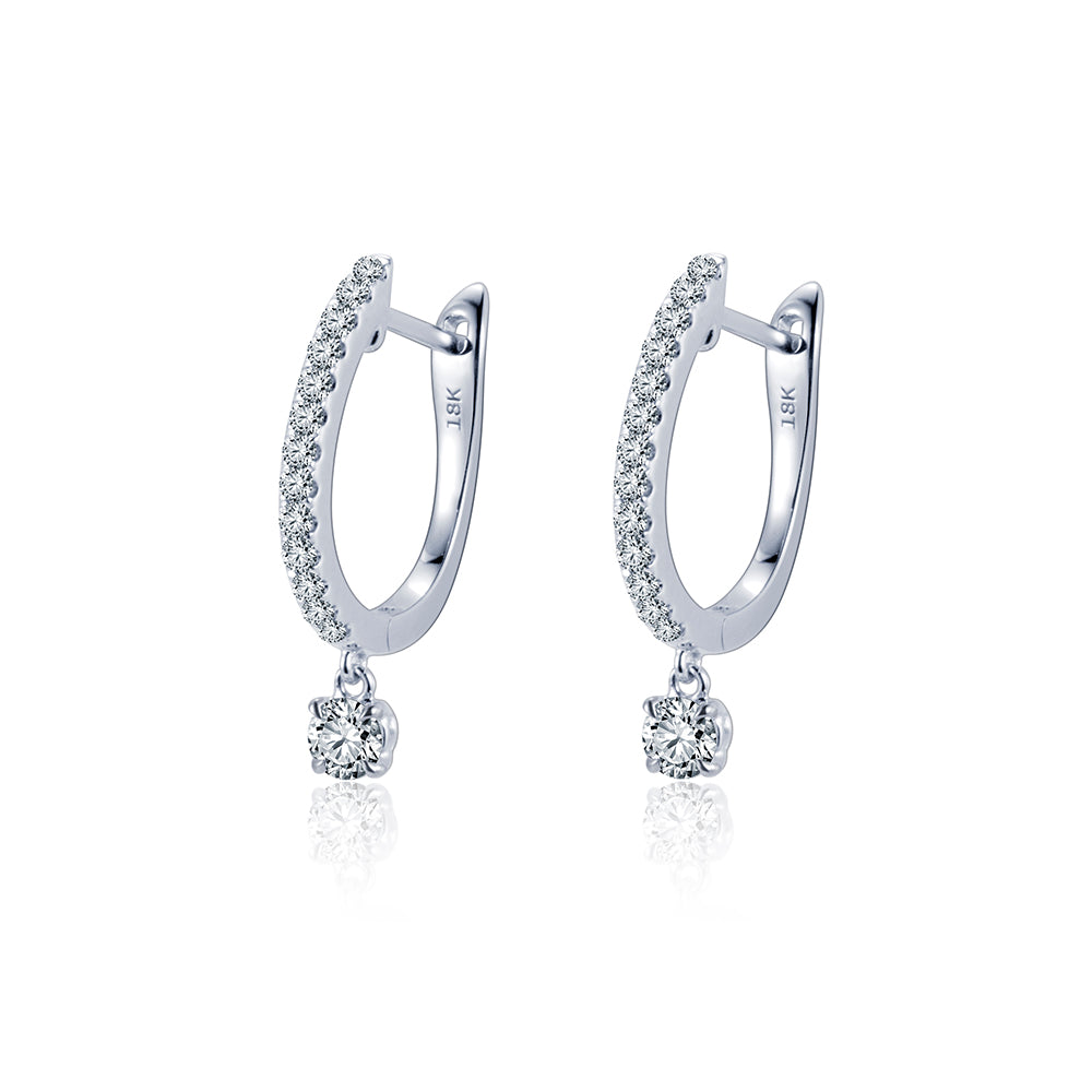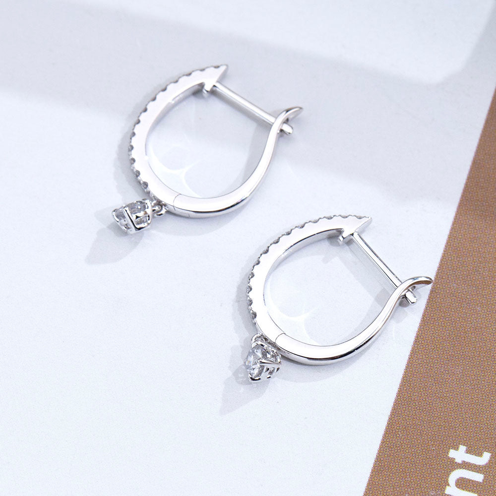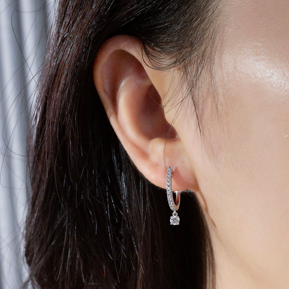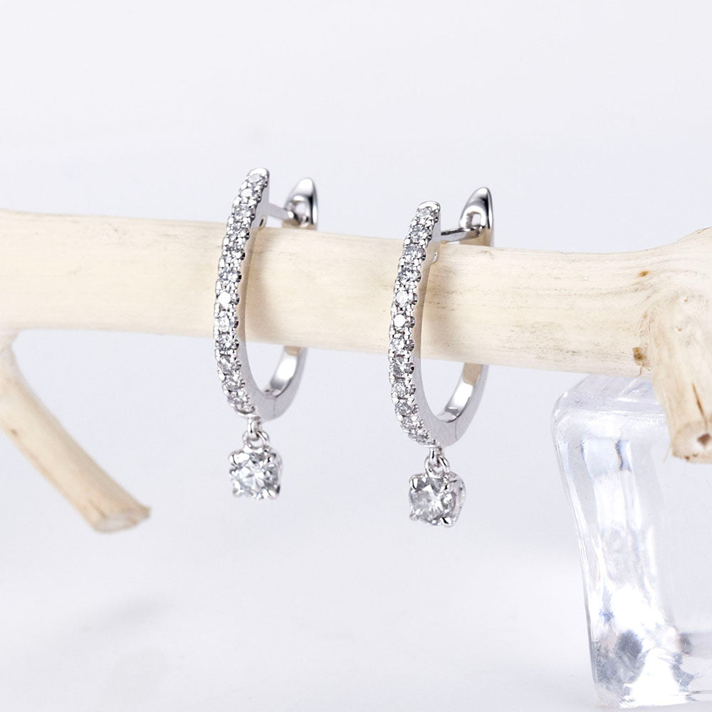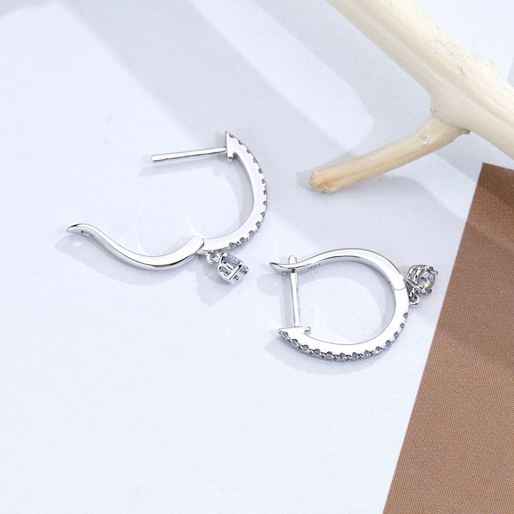 The front curve of each earring is encrusted with lab-grown round-cut diamonds, pavé-set to create a seamless shimmer. Suspended from the base is a single solitaire lab-created diamond, dancing freely with movement and catching light like a star in orbit. The contrast between the structured hoop and the fluid drop creates a dynamic silhouette—refined yet radiant.