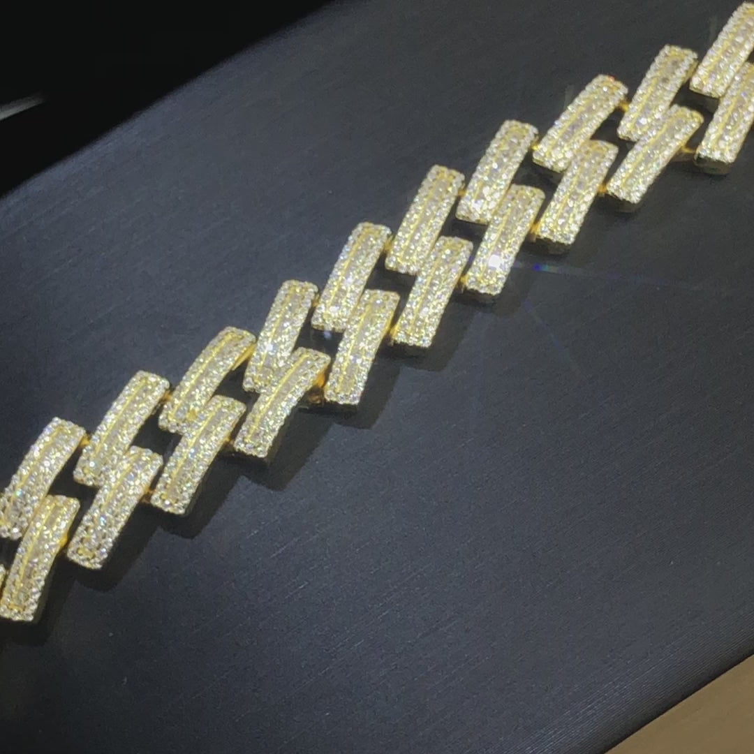 Each link is crafted in a zigzag Cuban silhouette, a staggered design that evokes movement and energy while maintaining the classic strength of interlocked geometry. The surface of every link is fully pavé-set with premium lab-grown moissanite stones, chosen for their exceptional brilliance, clarity, and ethical origin.