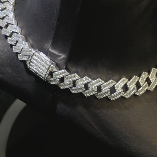 Each link is crafted in the classic Cuban silhouette, thick, flat, and tightly interlocked to create a seamless flow of light and form. The surface of every link is fully pavé-set with premium lab-grown moissanite stones, selected for their exceptional fire, clarity, and ethical origin.