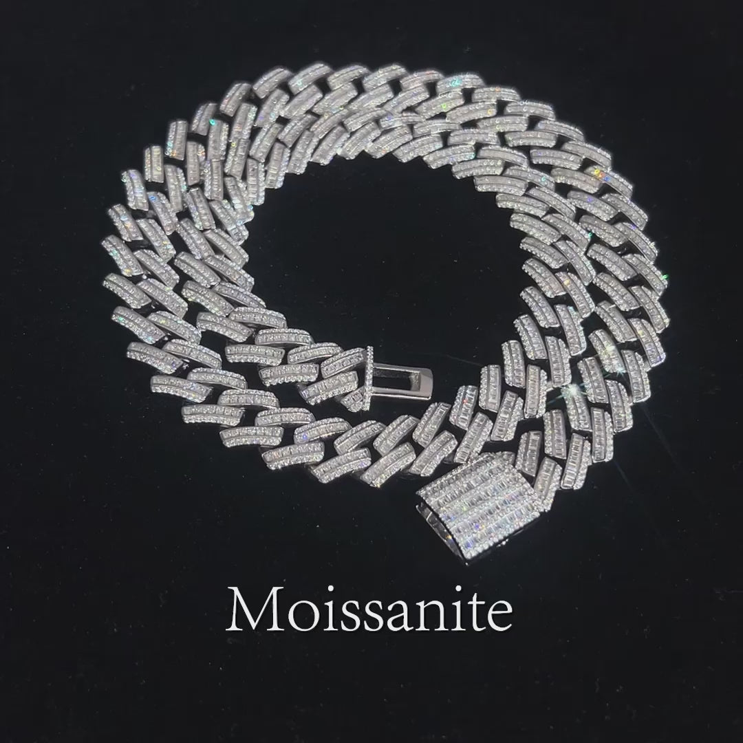 Each link is shaped in a rectangular silhouette, a departure from traditional curves, offering a bold, modern rhythm. The surface of every segment is fully pavé-set with premium lab-grown moissanite stones, selected for their unmatched brilliance, clarity, and ethical origin.