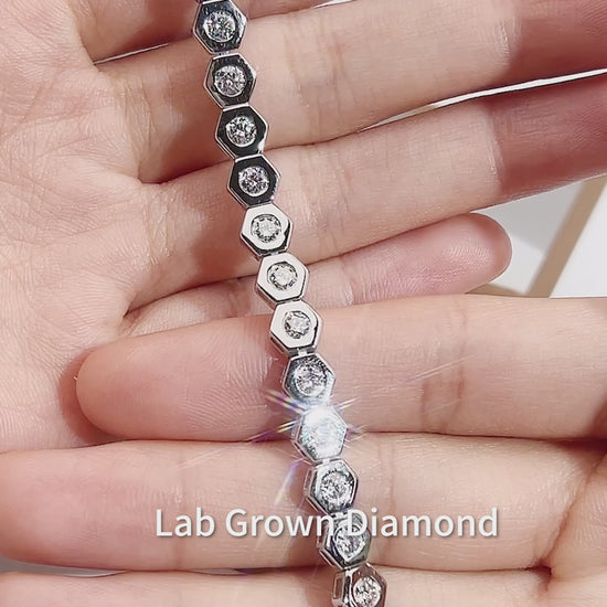 The bracelet's design evokes crystalline symmetry, with each round brilliant-cut stone set in a hexagonal bezel, reflecting light from every angle. The diamonds may be customized to include lab-grown sapphires, rubies, emeralds, or moissanite, allowing for a personalized palette of color and meaning.